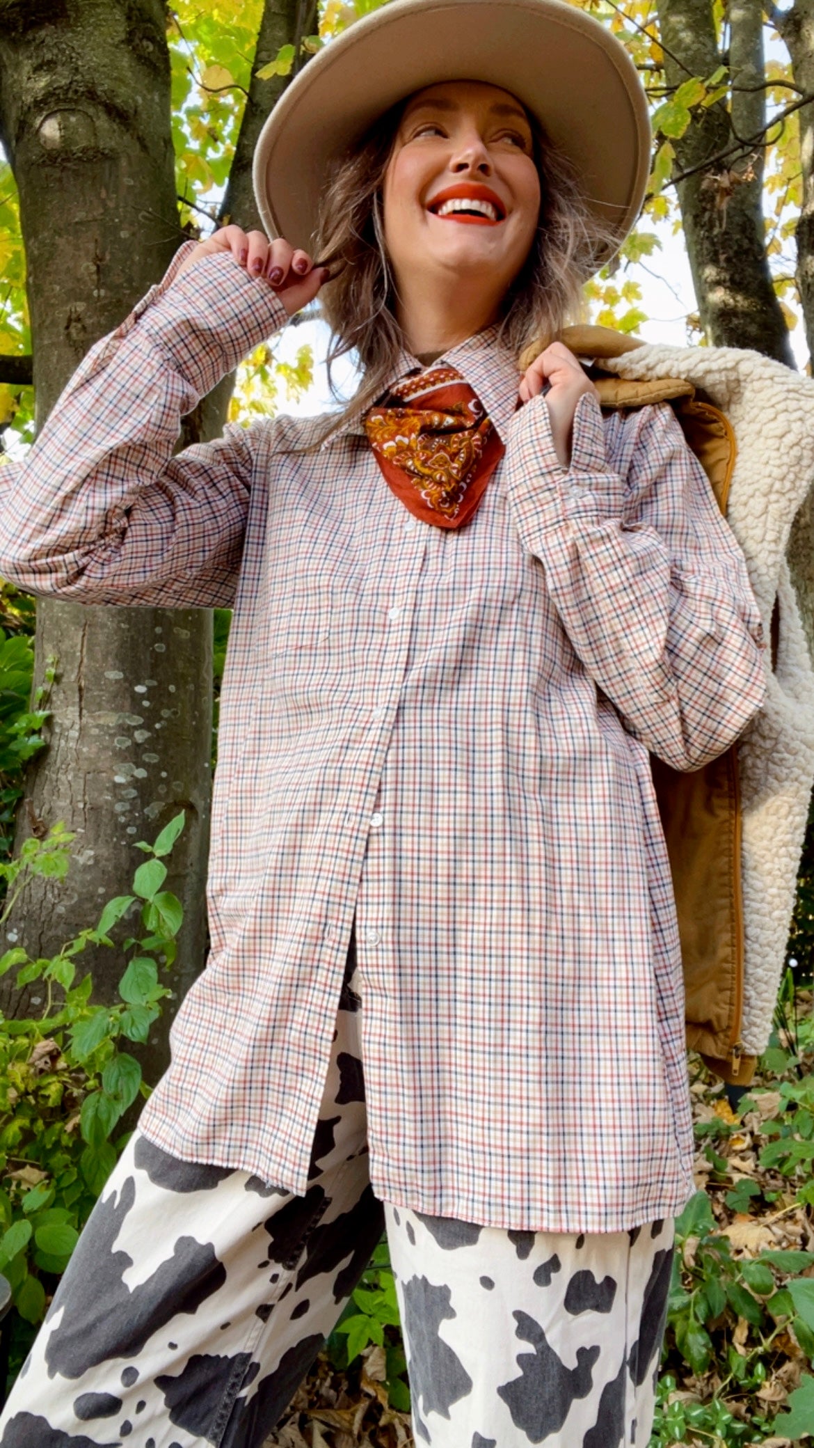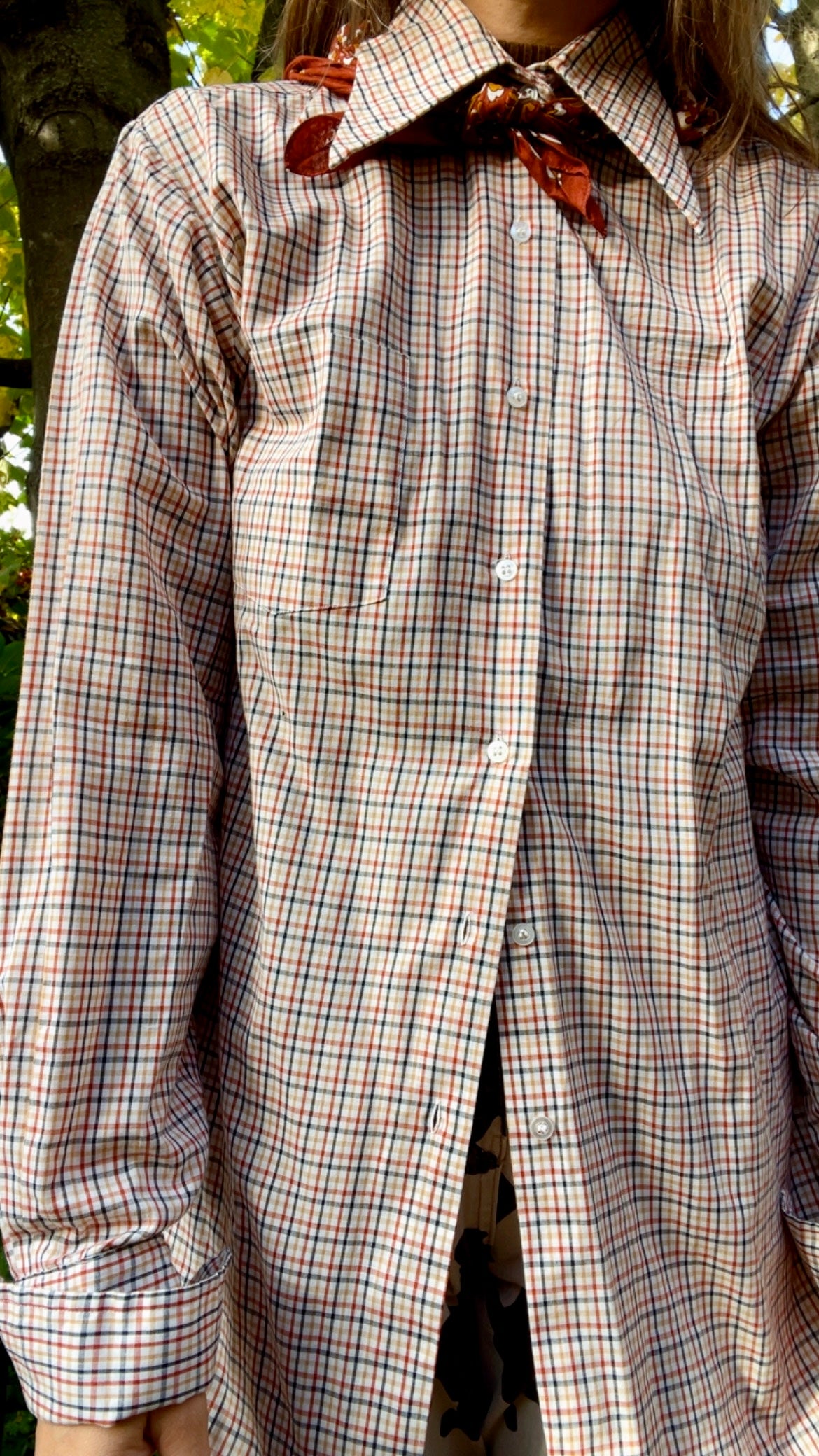 Absolutely an amazing find. A lovely dagger collar shirt in a warm toned check print. A so called easy iron fabric, comfortable and light.