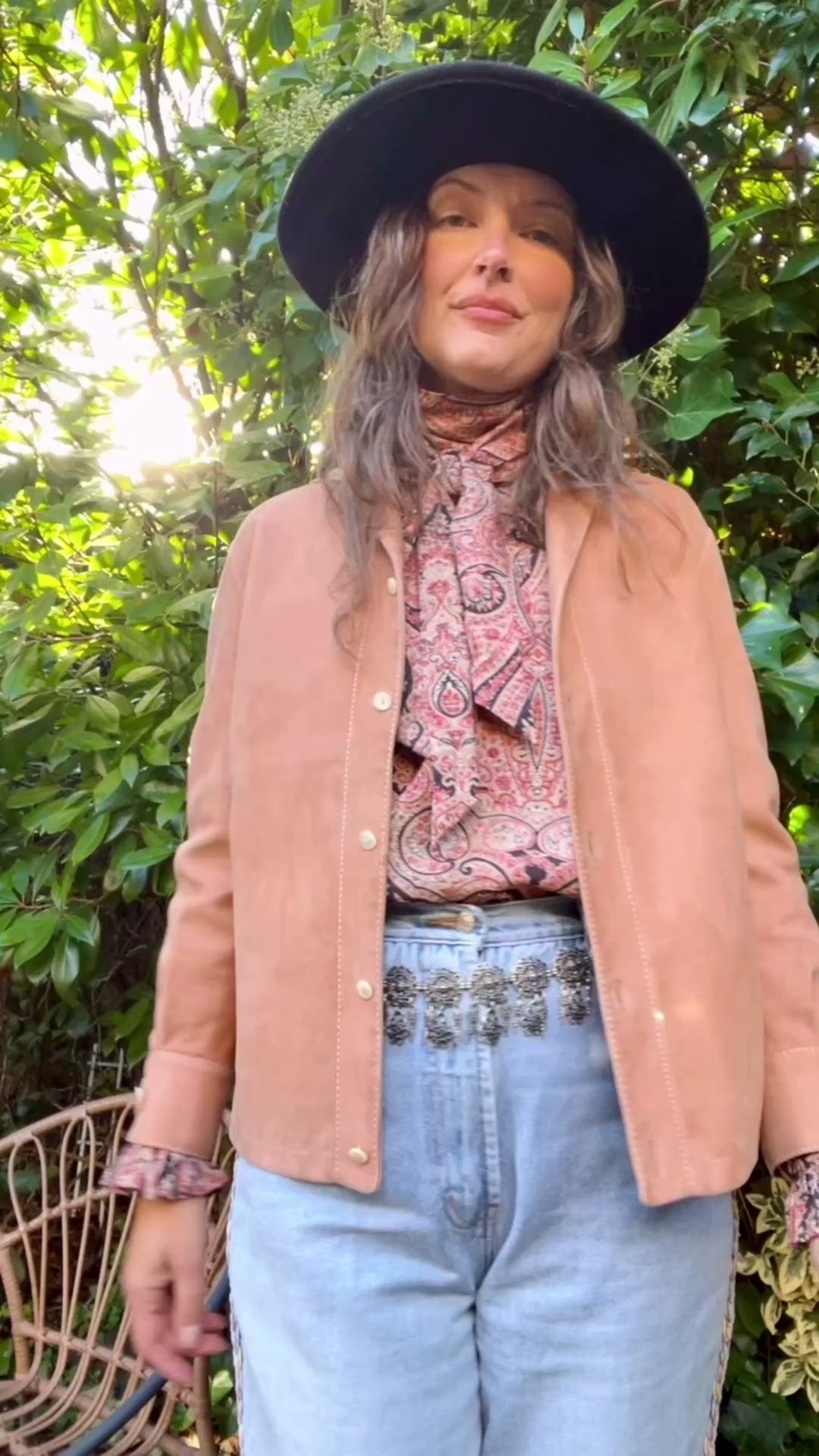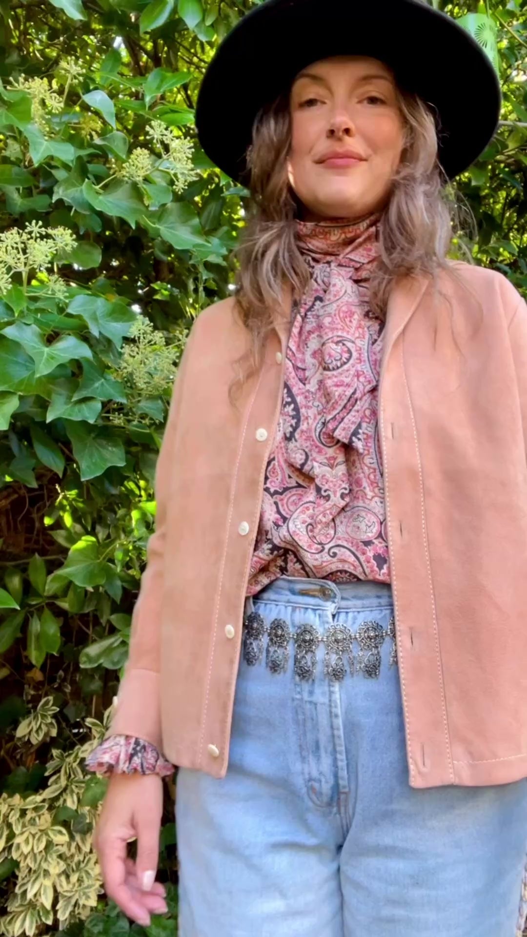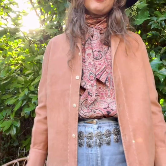 Such a stunning piece. This peachy leather jacket, super soft and a very pretty soft color. Beautiful detailing on the sleeves. Satin lined.