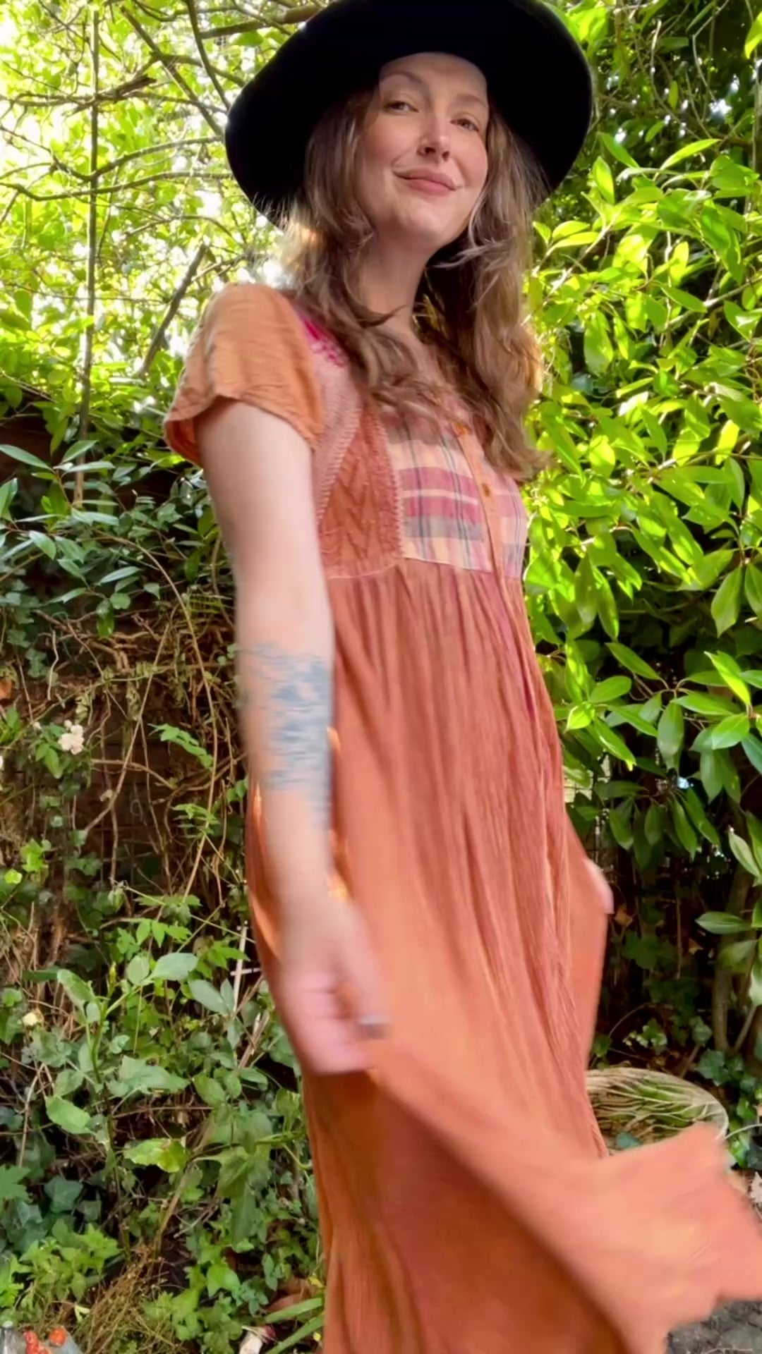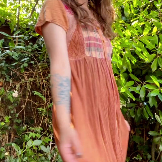 This beautiful garment dyed dress is giving Indian summer/ fall vibes with the warm color of changing leaves and check pattern. Buttons all the way down and can be adjusted in the waist.