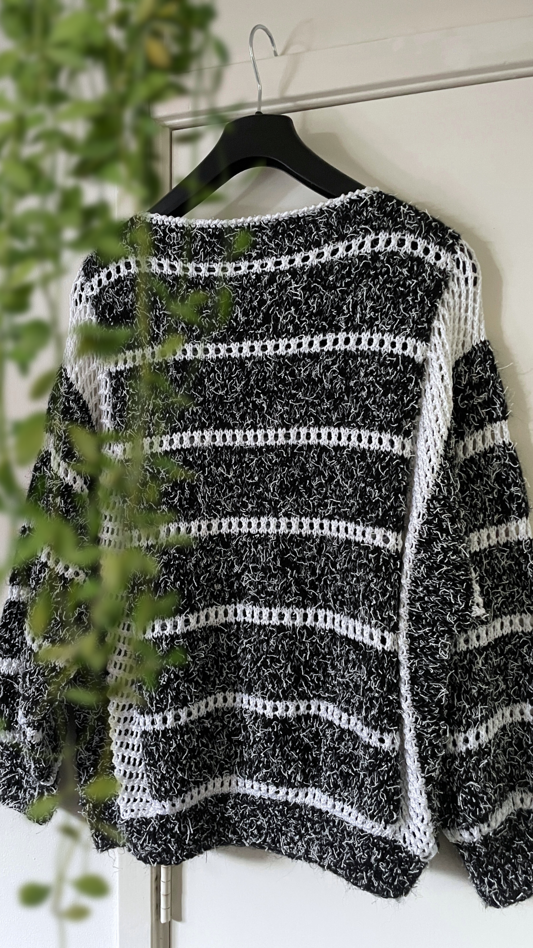 Wowza, such a cool piece. Super 80s with the bat sleeve shape. Black and white is a combo that can never go wrong. Keep in mind it’s knitted loosely and therefore slightly see through.