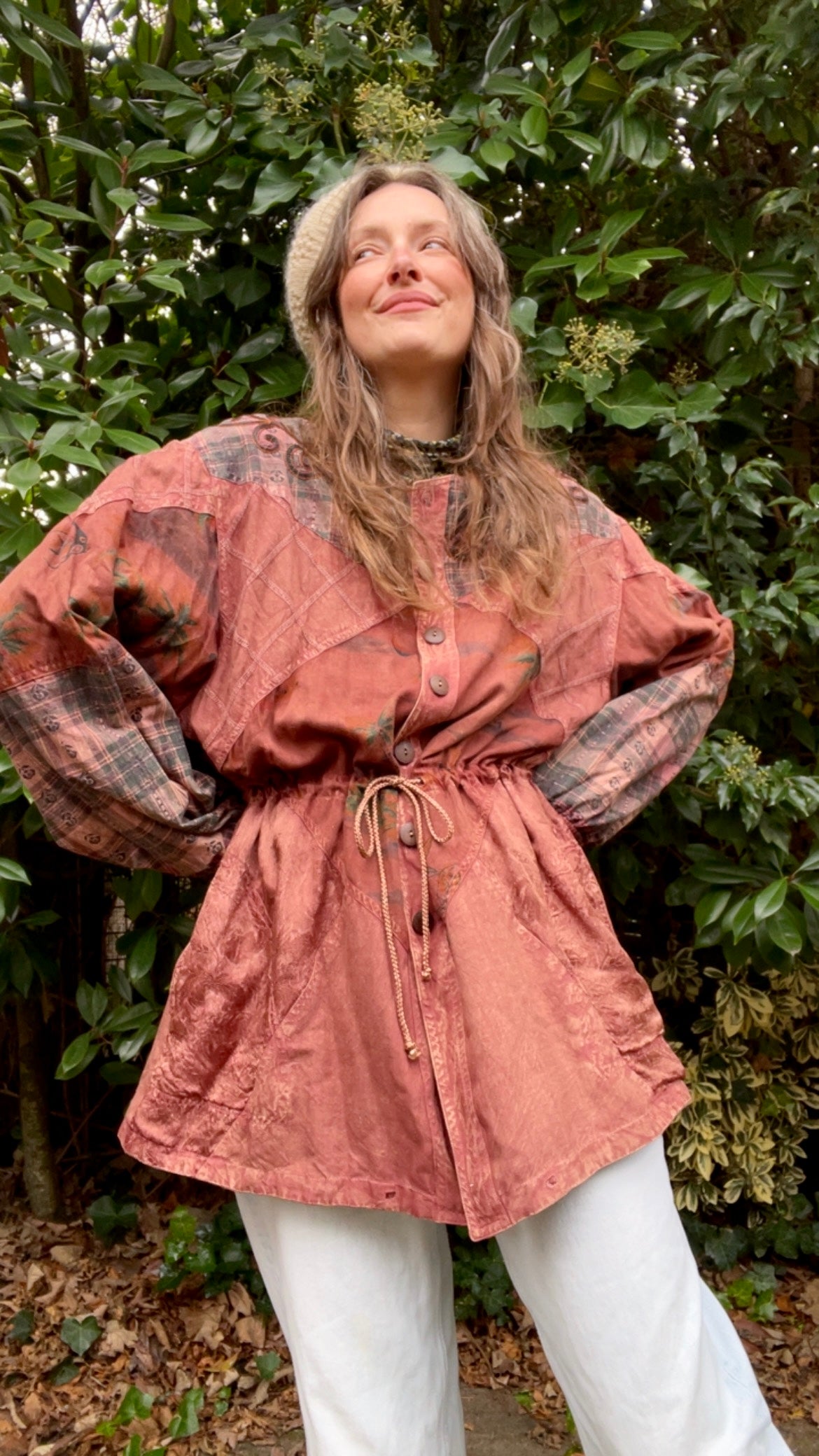Super cool jacket in a large box fit. Will fit many bodies and the waist can be adjusted with a lace. Unfortunately the bottom one is missing but if you like it more balloon shape you could switch the mid lace to the bottom piping. Beautifully made so it could be worn inside out even (shown in de photos). The color is a nice burgundy. Not padded but lined. Closes with coconut buttons.