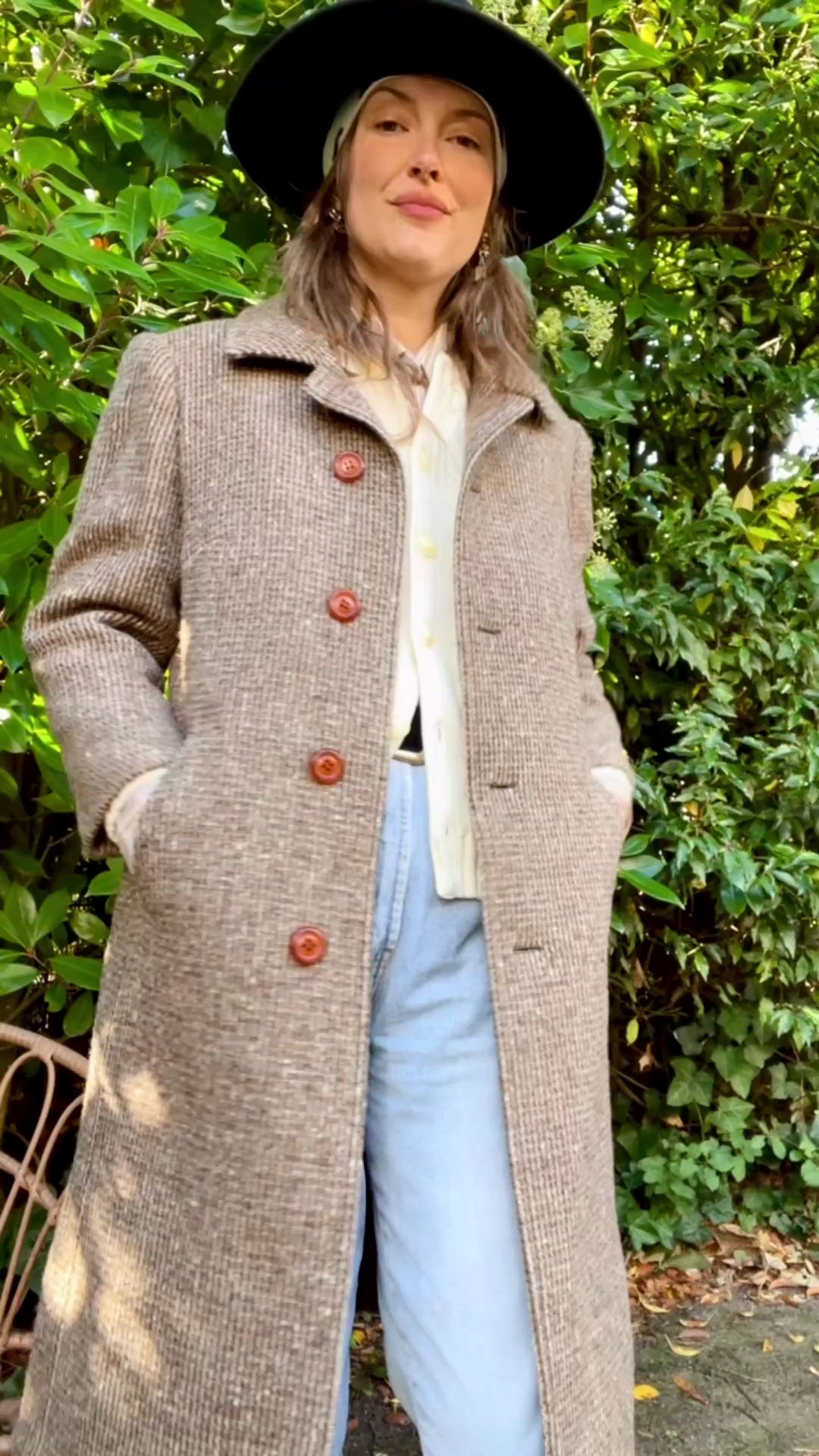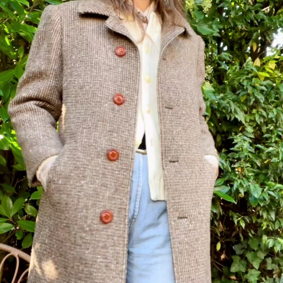 A classic wool coat. Beautiful, warm and timeless. Stunning color combo of browns, cream and a little hint of green. Satin lined. Deep pockets and a slit in the back for comfortable movement.