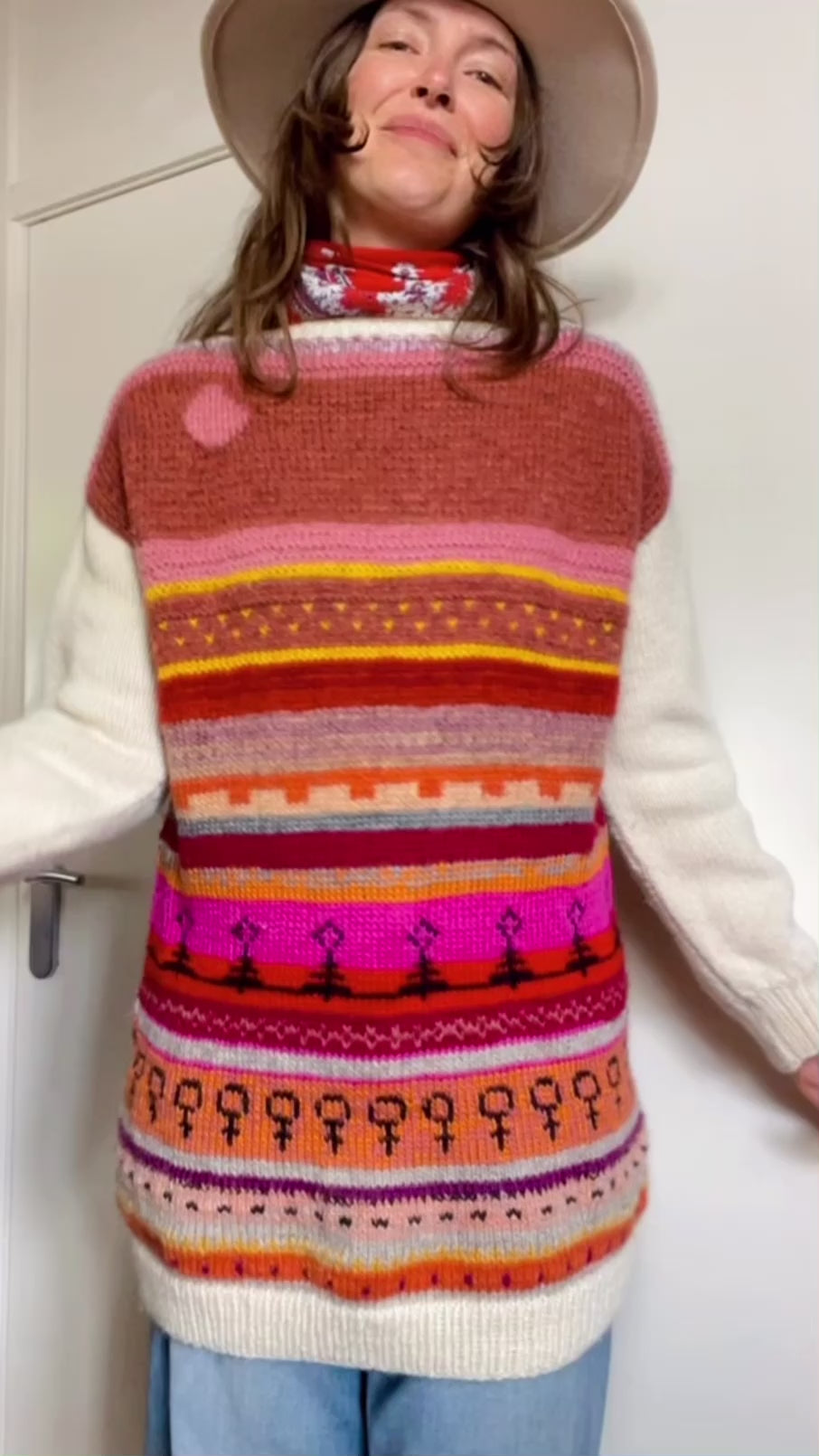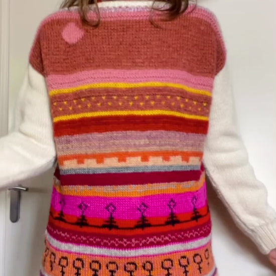 This absolutely treasure of a jumper is so long, many will be able to wear it as a dress. Warm wool in warm and happy colors. This is a jumper that immediately makes you smile.