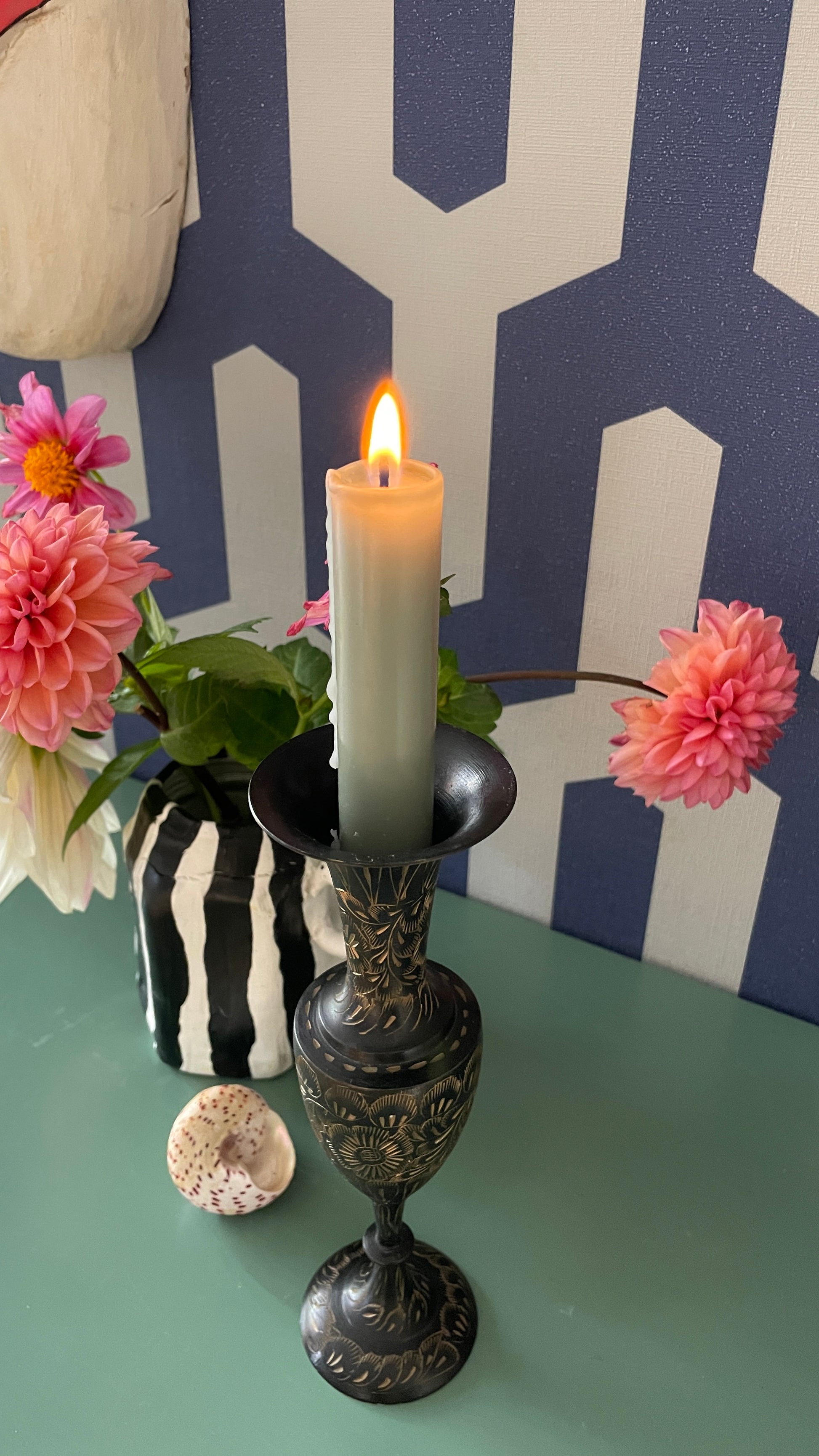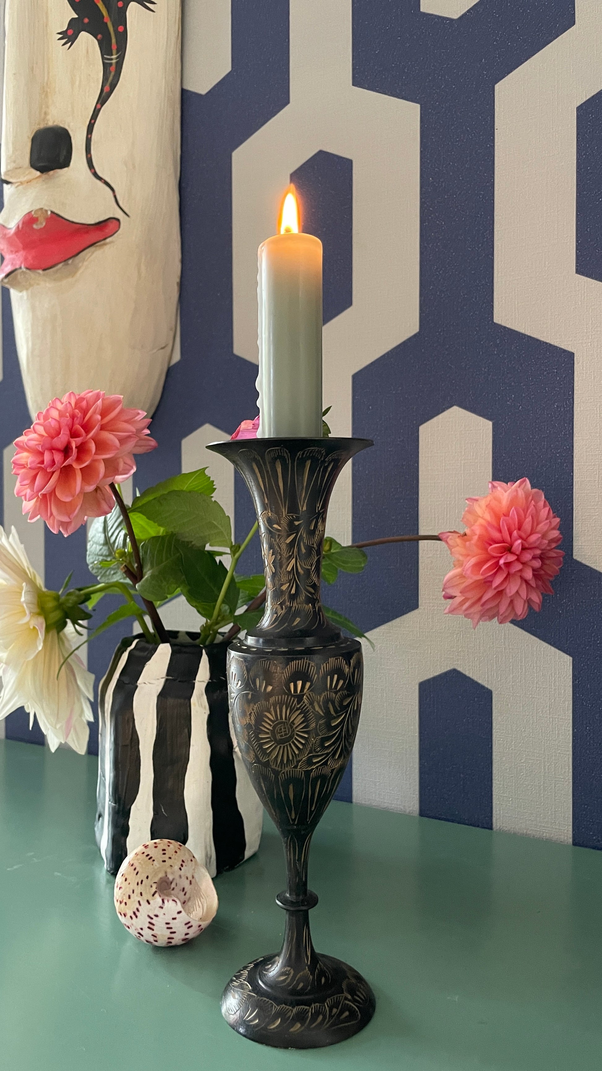 Stunning Indian brass vase. Beautifully decorated with flower engraving. For dried flowers only. Could also hold a dinner candle.