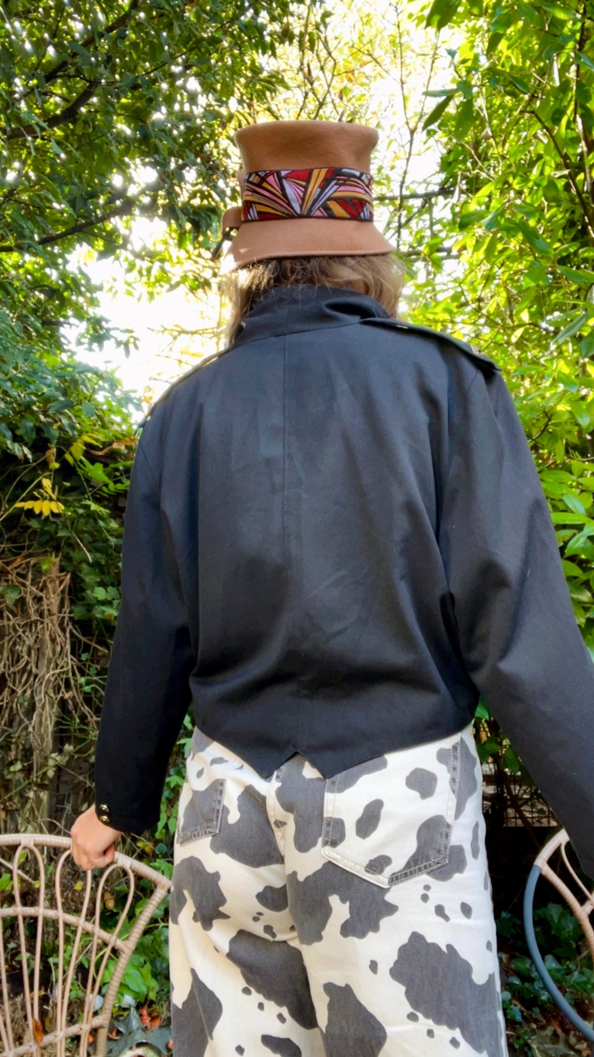 Marching band style cropped, dropped shoulder blazer. Black fabric, gold colored buttons with black “stone” in the middle. Lovely and light, no shoulder pads.
