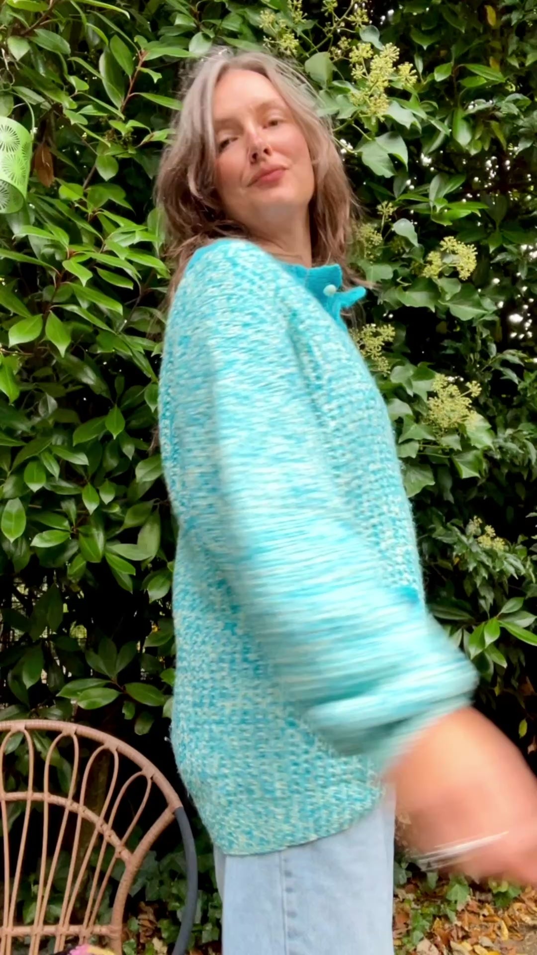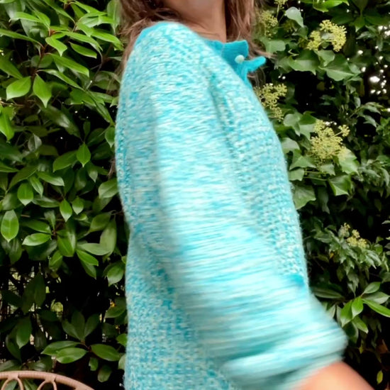 Super cute bright turquoise/ blue and white melange jumper. A very cute fit Has a cute pocket detail. The missing button is replaced before send off.
