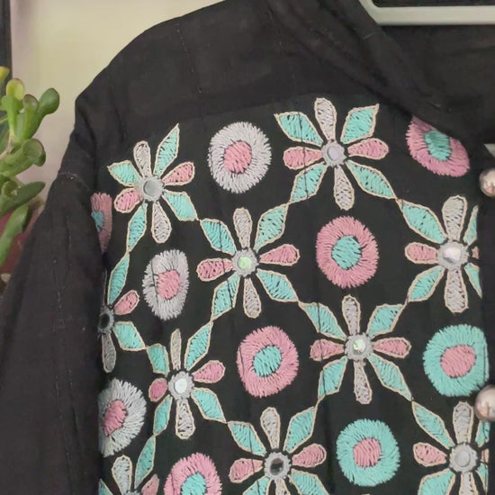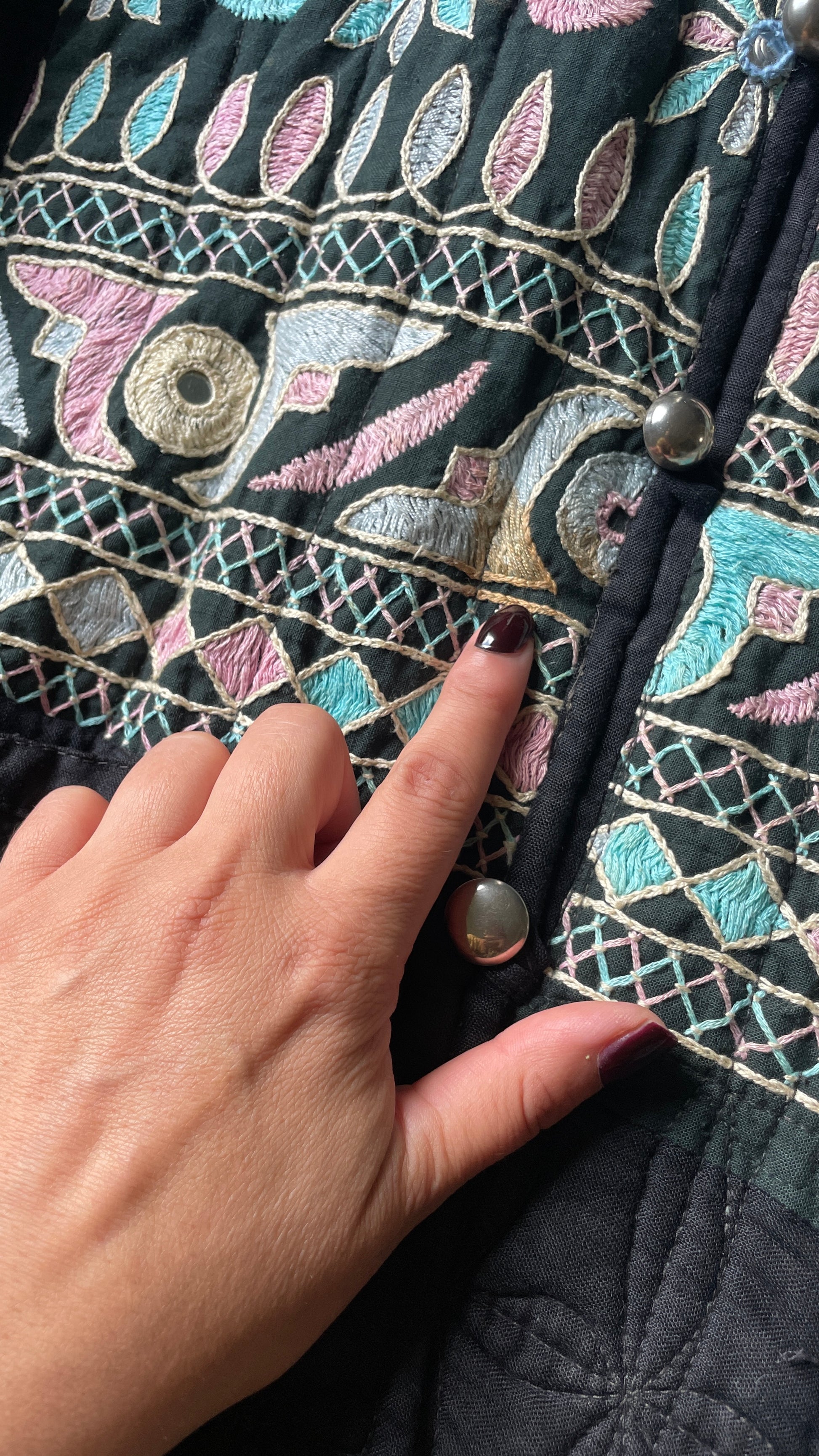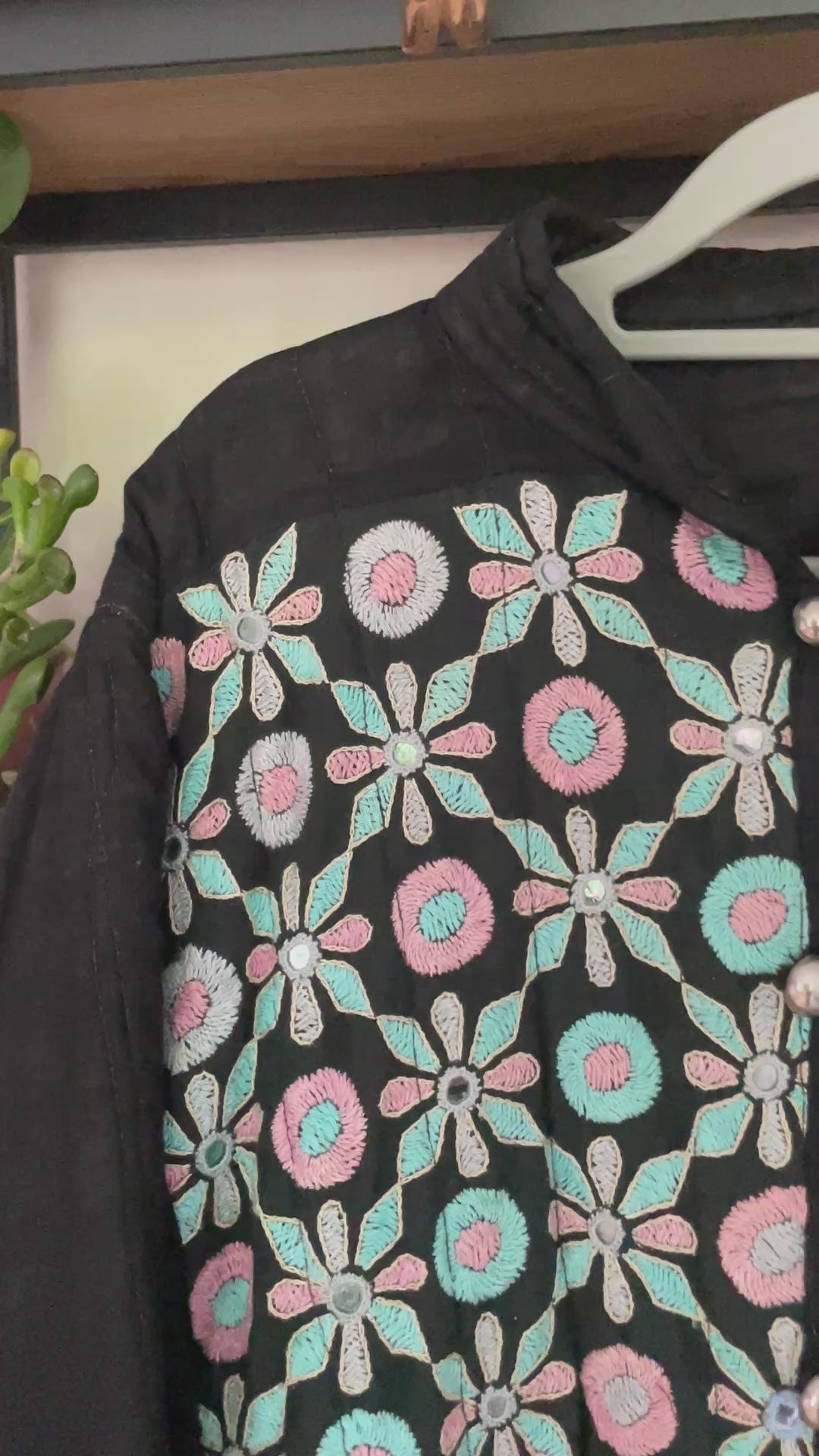 A lovey soft jacket, lightly padded. Decorated on the front and cuffs with embroidery flowers and little mirrors. I added buttons as there were only 2 left. I chose miss-matched silver metal ones that not only fit the vibe but will stand the test of time.