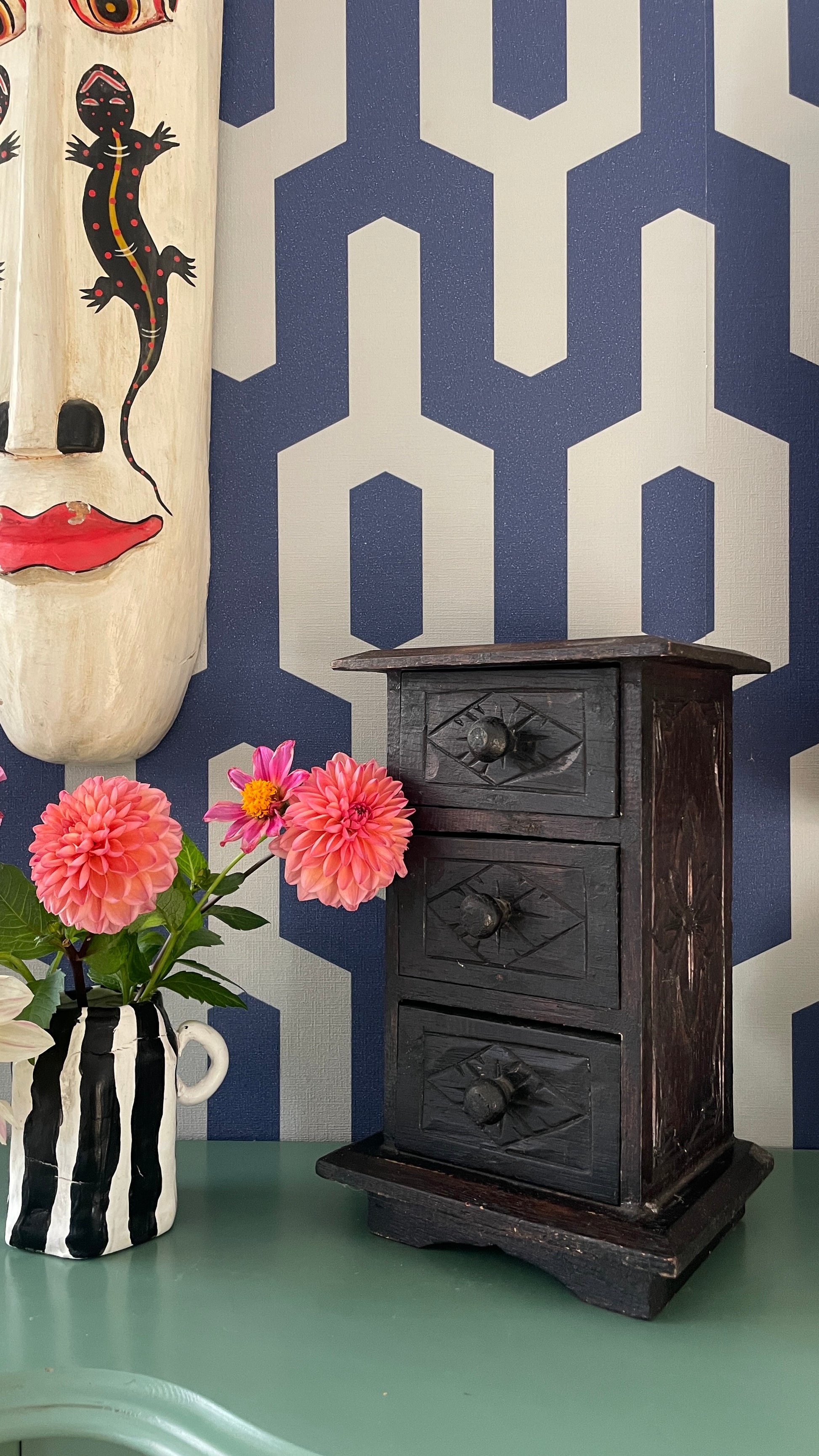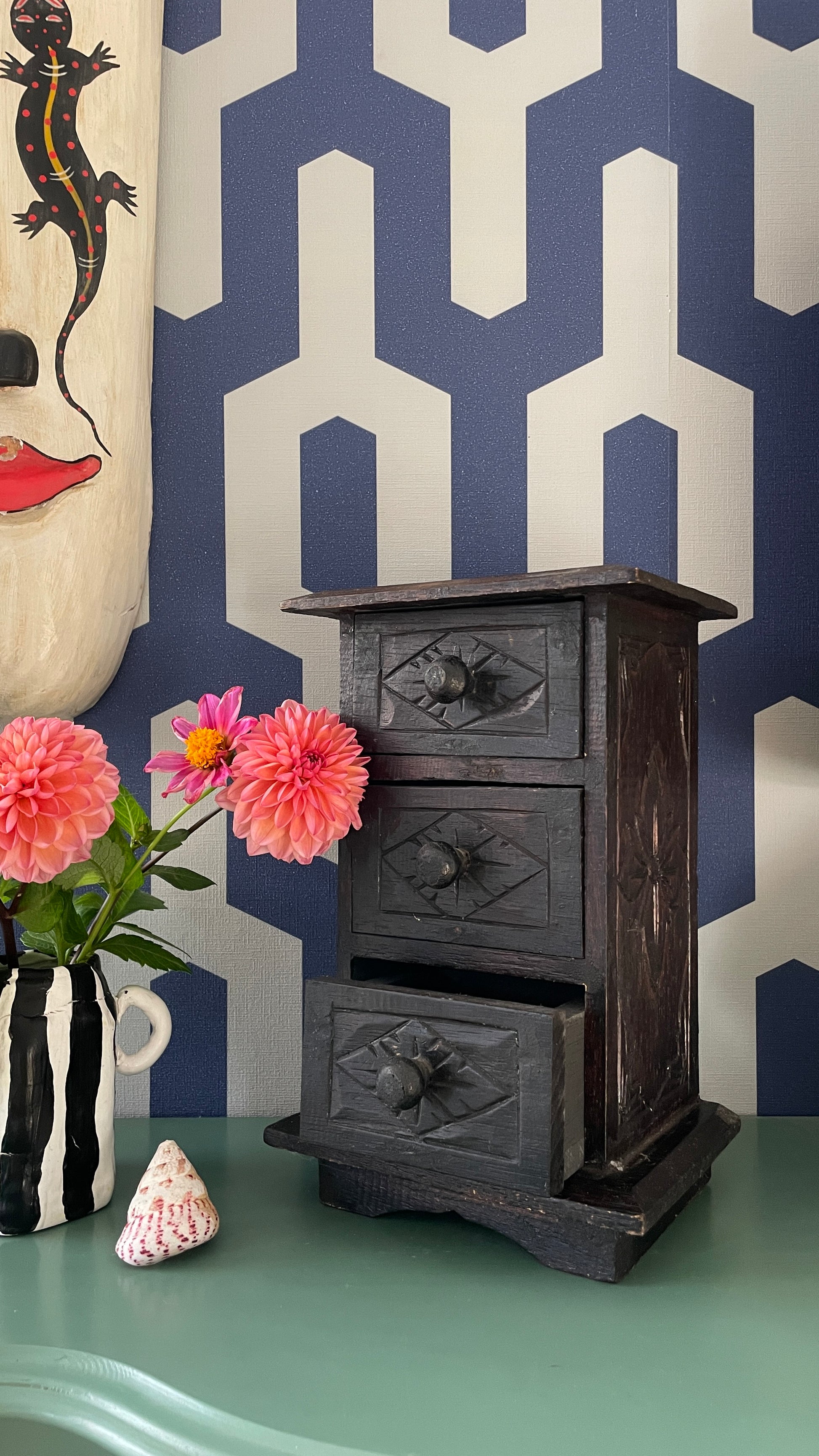 Very rustic and boho Indonesian wooden drawers. Stained dark, a light weight wood. Decorated with natural patterns. Sold separately.