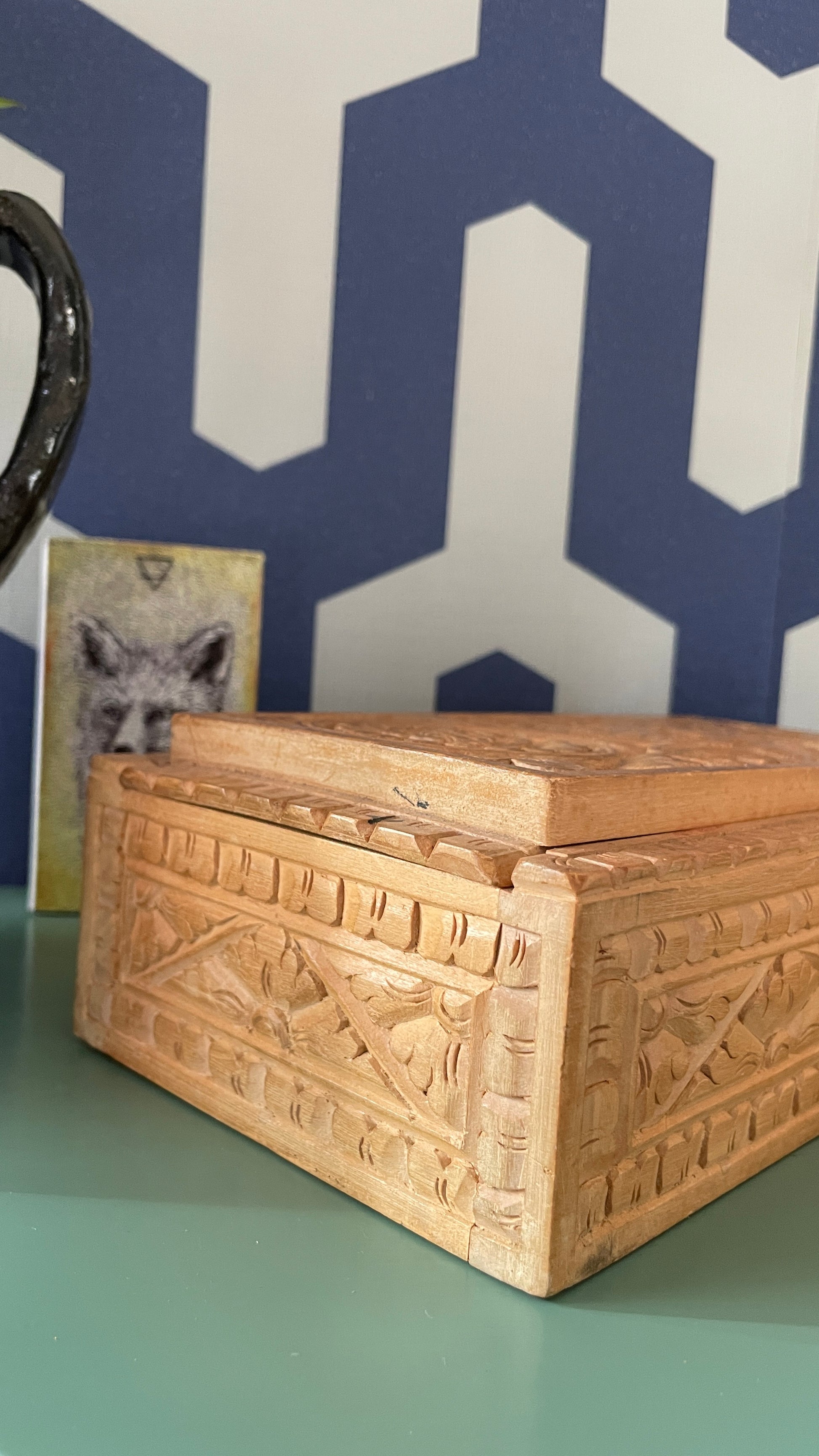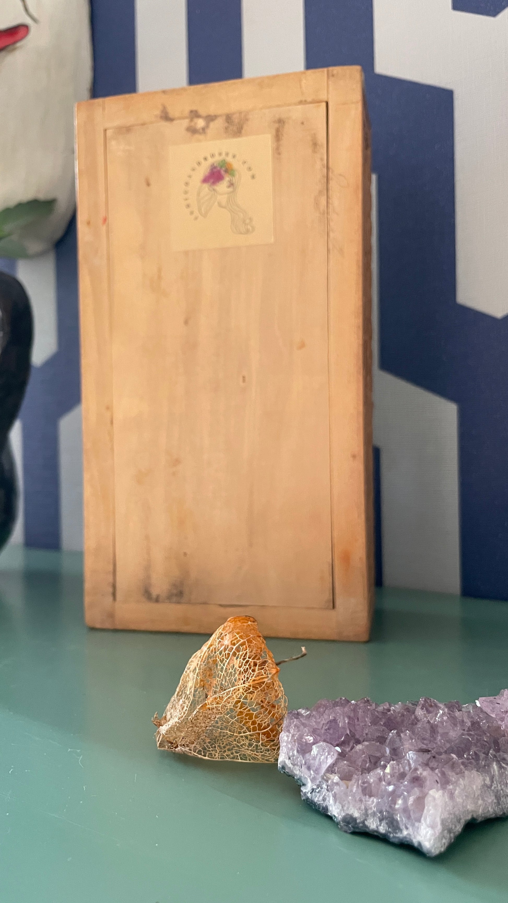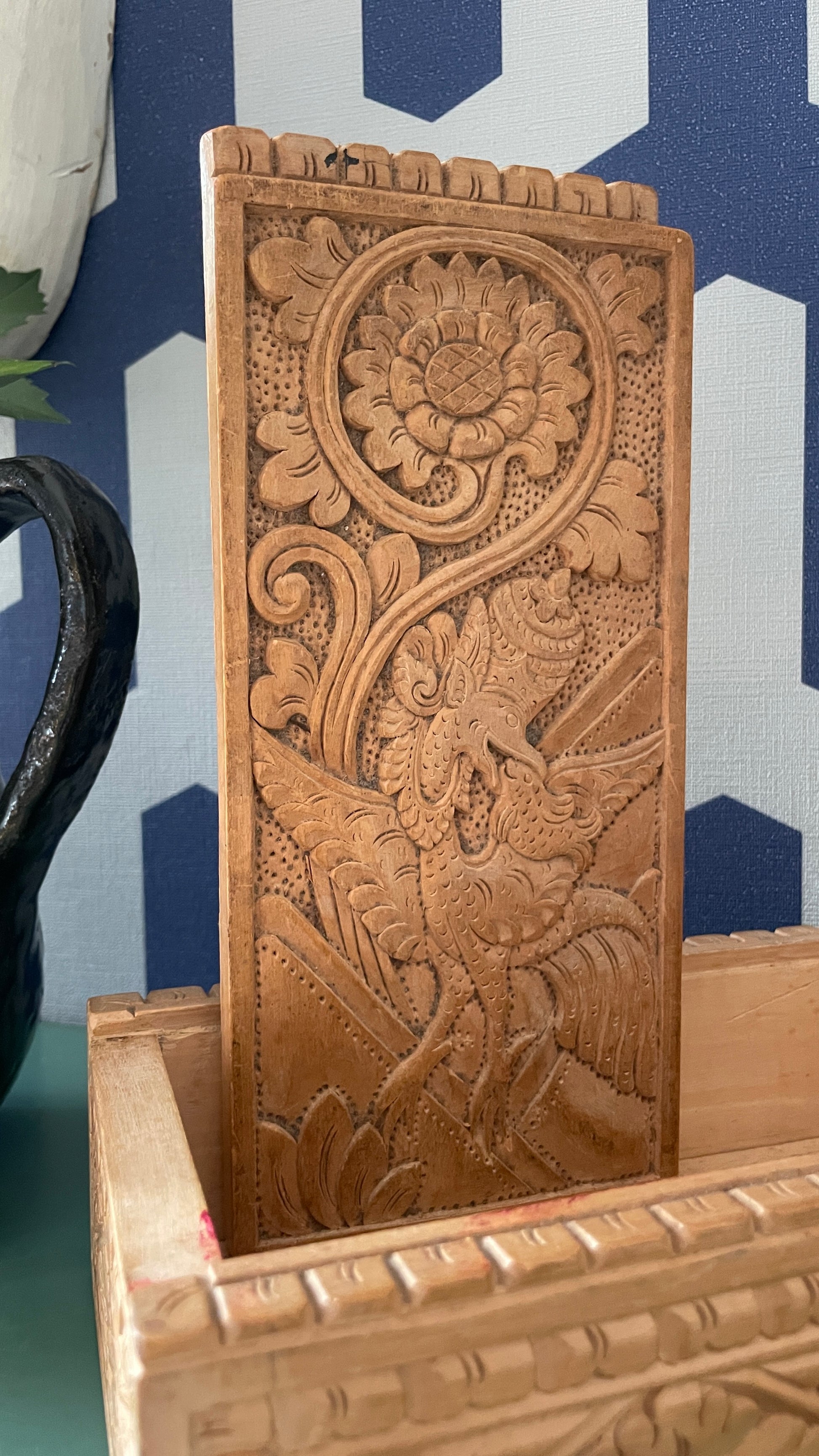 Very interesting wood carved box showing a bird like creature (a heron?) and a fish that seems pretty happy to be eaten. Around the animals beautiful flowers appear. Great for drawing supplies, tarot decks, jewelry, you name it. Lid slides on. Some signs of use as shown.