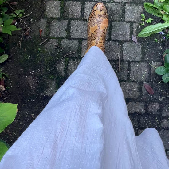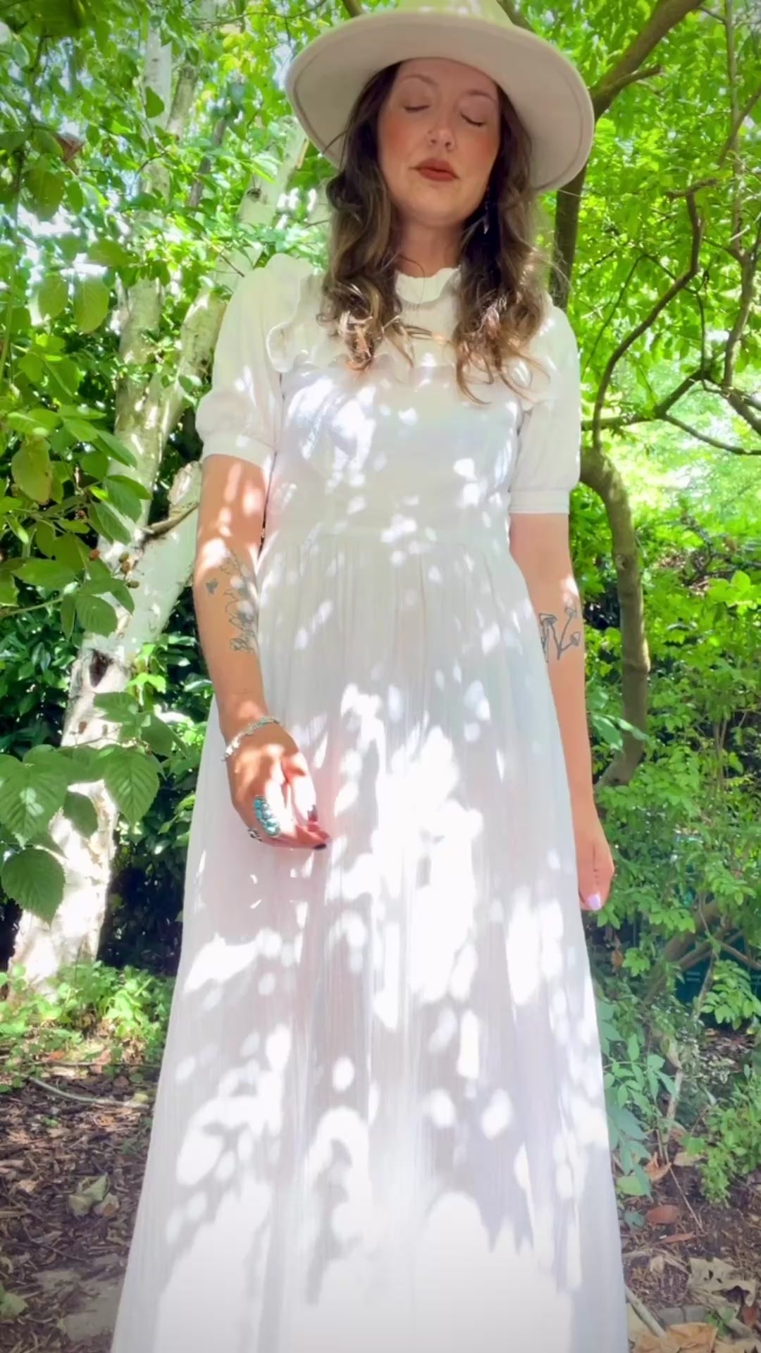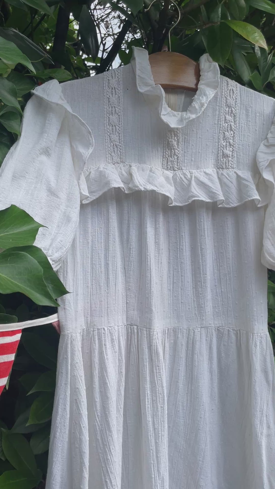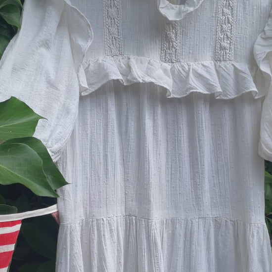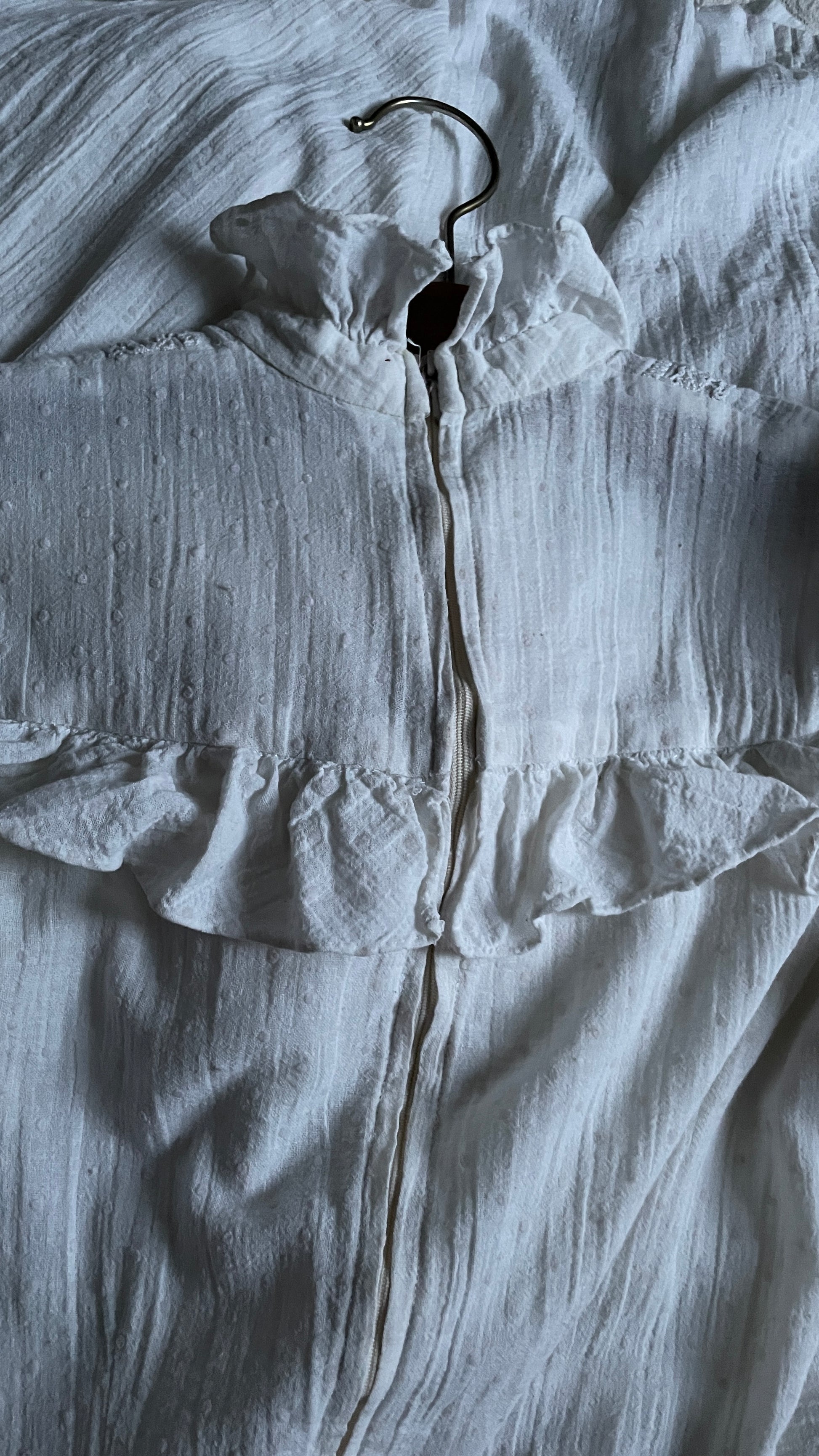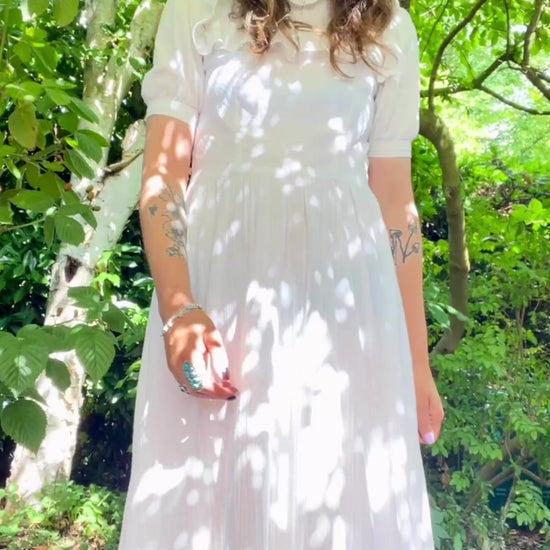 An absolute treasure of a dress, so pretty you could get married in this one. But also grocery shopping would be extra special in this one. This beauty is hand (home) made out of (ton-sur-ton) dotted white cotton gauze fabric. Closes with a zipper in the back. Unlined, I wore it with dark underwear to showcase the sheerness of the fabric. It could be worn with skin tone underwear or slip dress to prevent them showing. The sleeve cuffs are quite narrow, I’ve added the measurements as these are non stretch and no buttons on them to adjust.