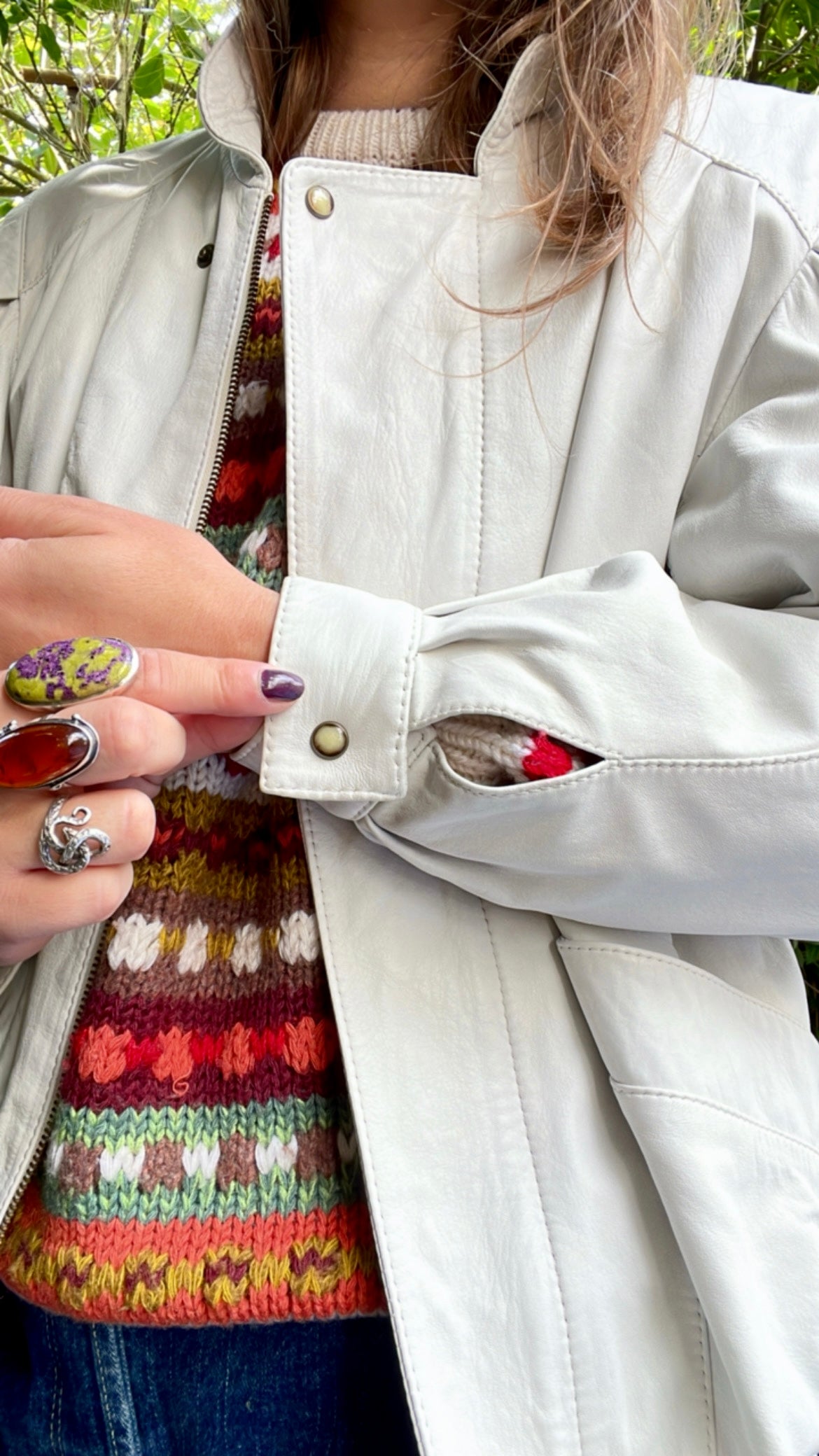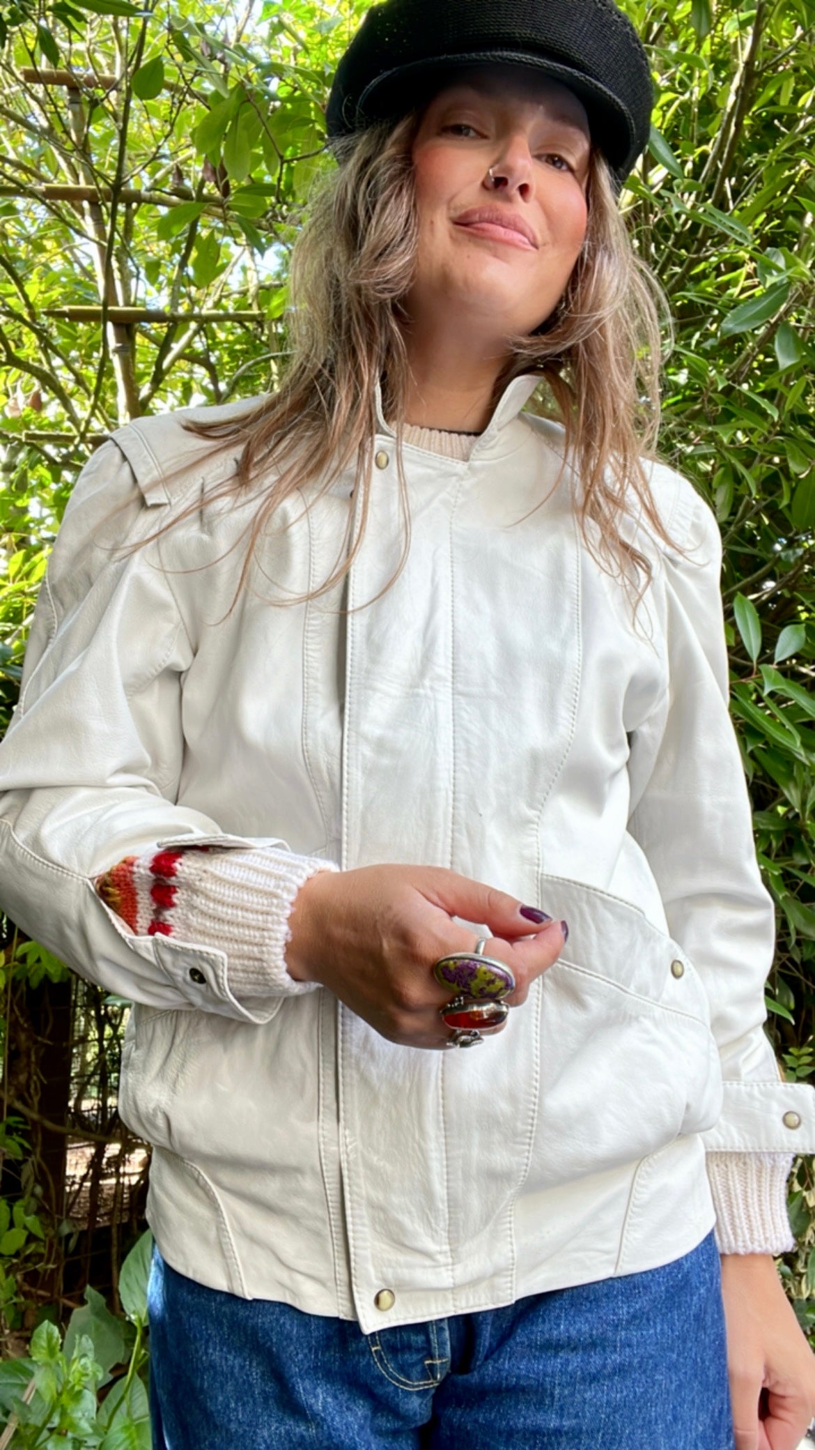 Super cool 80s leather jacket in very good shape. It has that typical 80s fit without having too much of a shoulder. Two deep pockets, closes with a zipper that overlaps. Cuffs can be worn open or closed with a snap button.