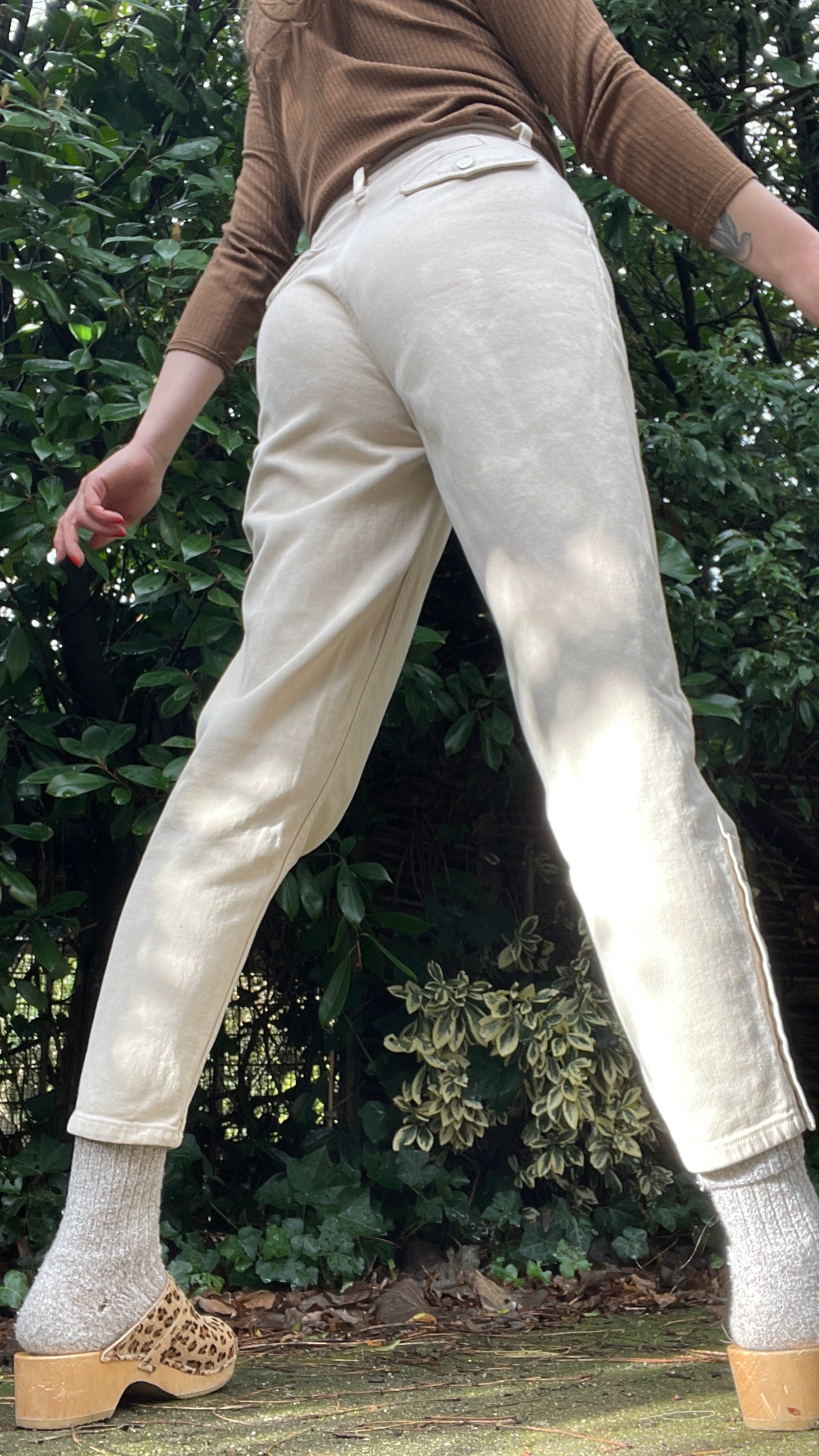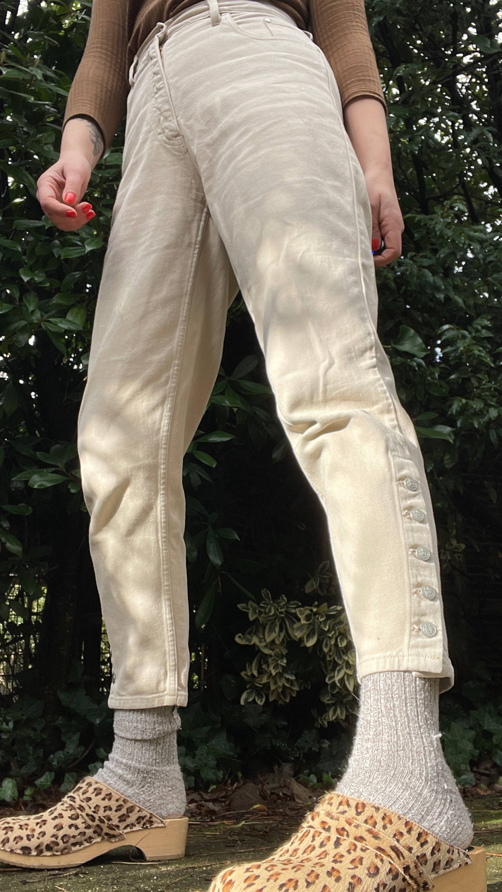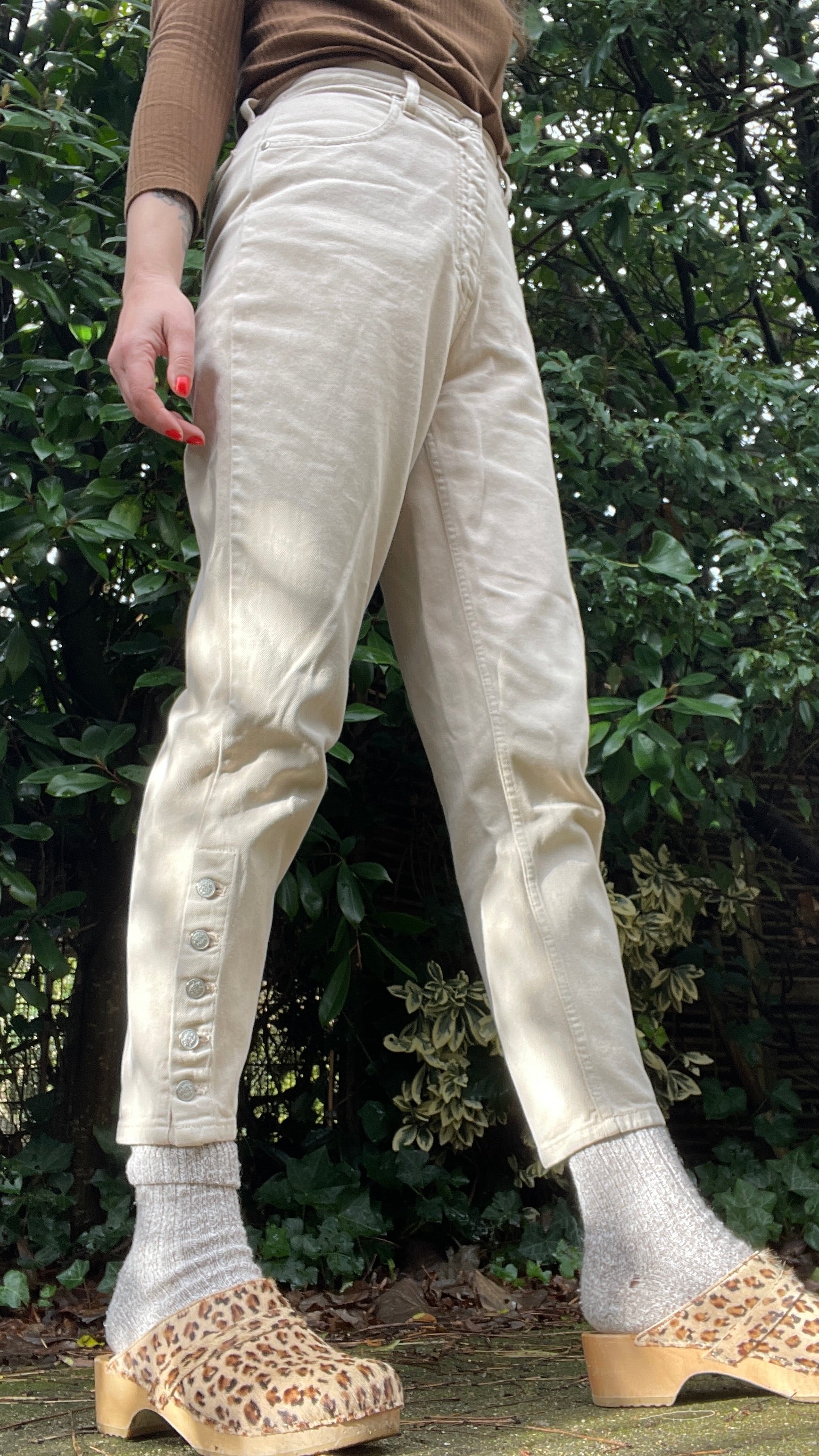 Super cool cream denim. Non stretch in a very good quality fabric. A “mom fit” shape with cool back pocket design and buttons on the lower leg.