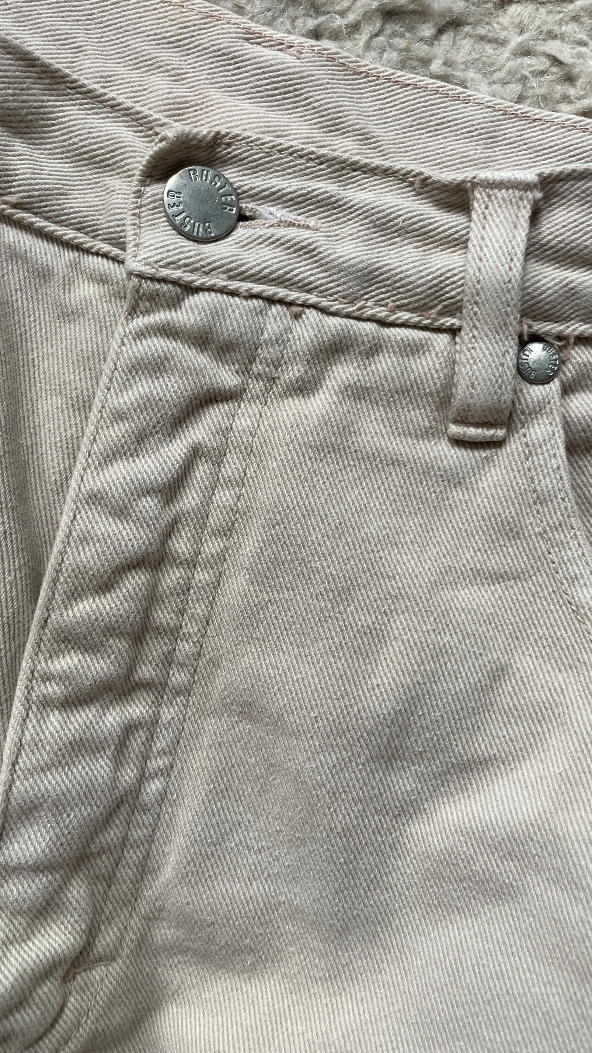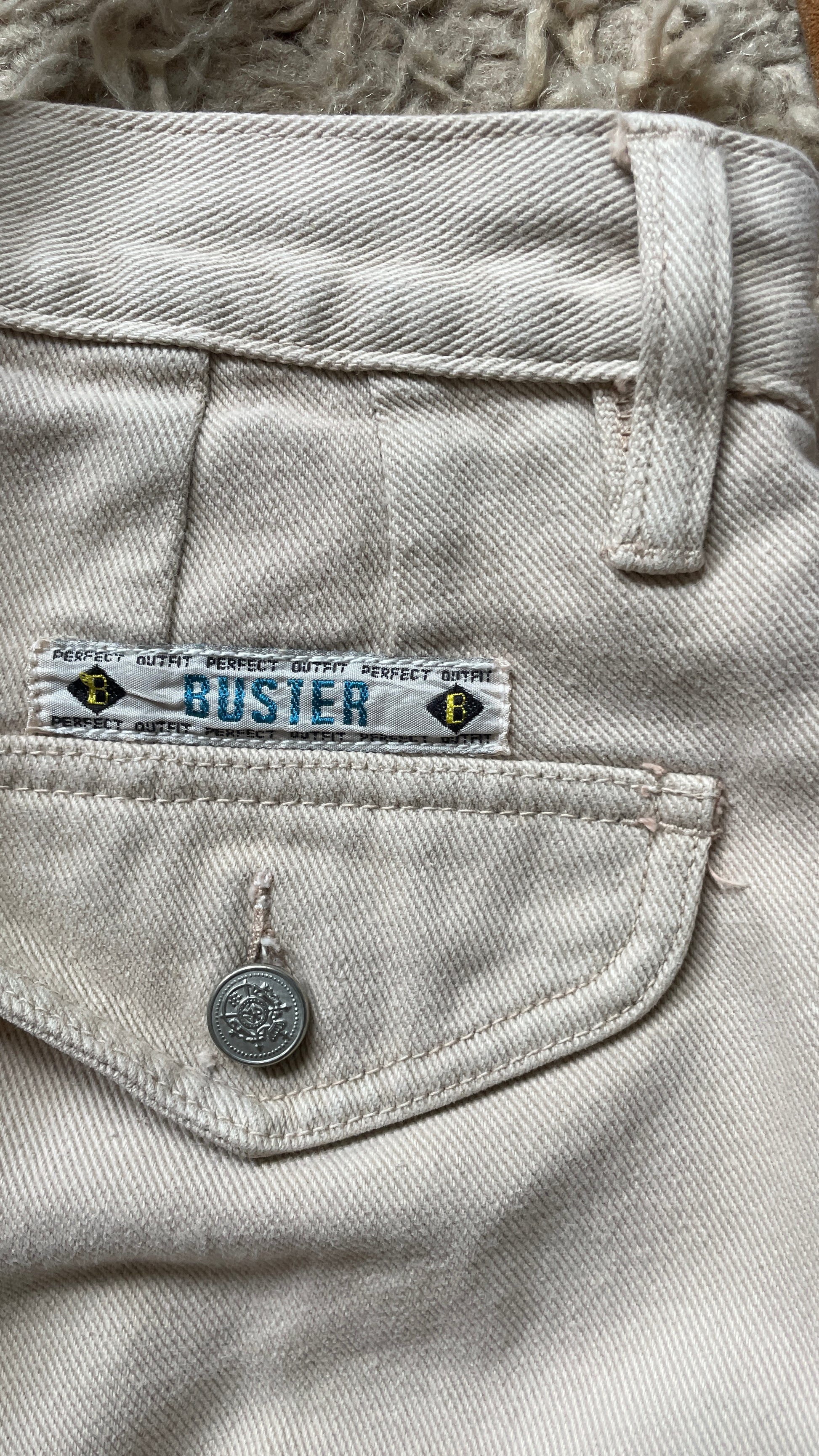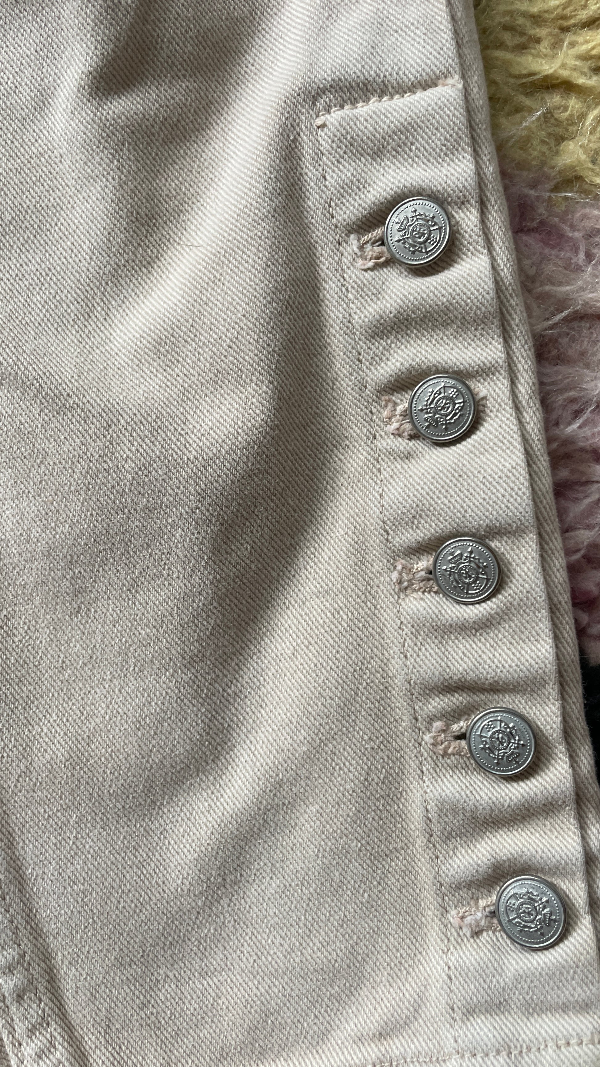 Super cool cream denim. Non stretch in a very good quality fabric. A “mom fit” shape with cool back pocket design and buttons on the lower leg.