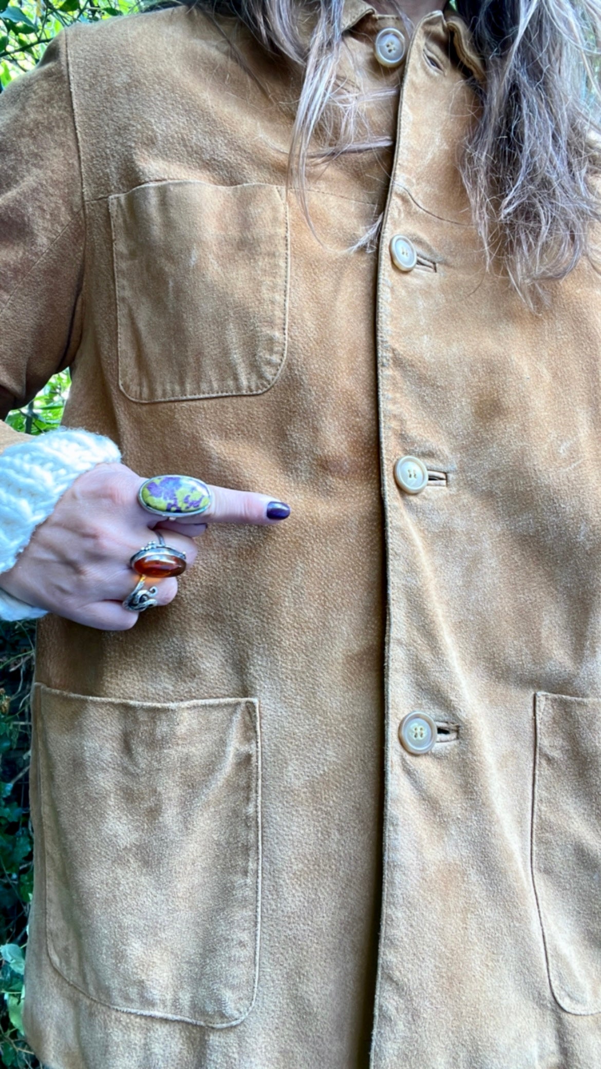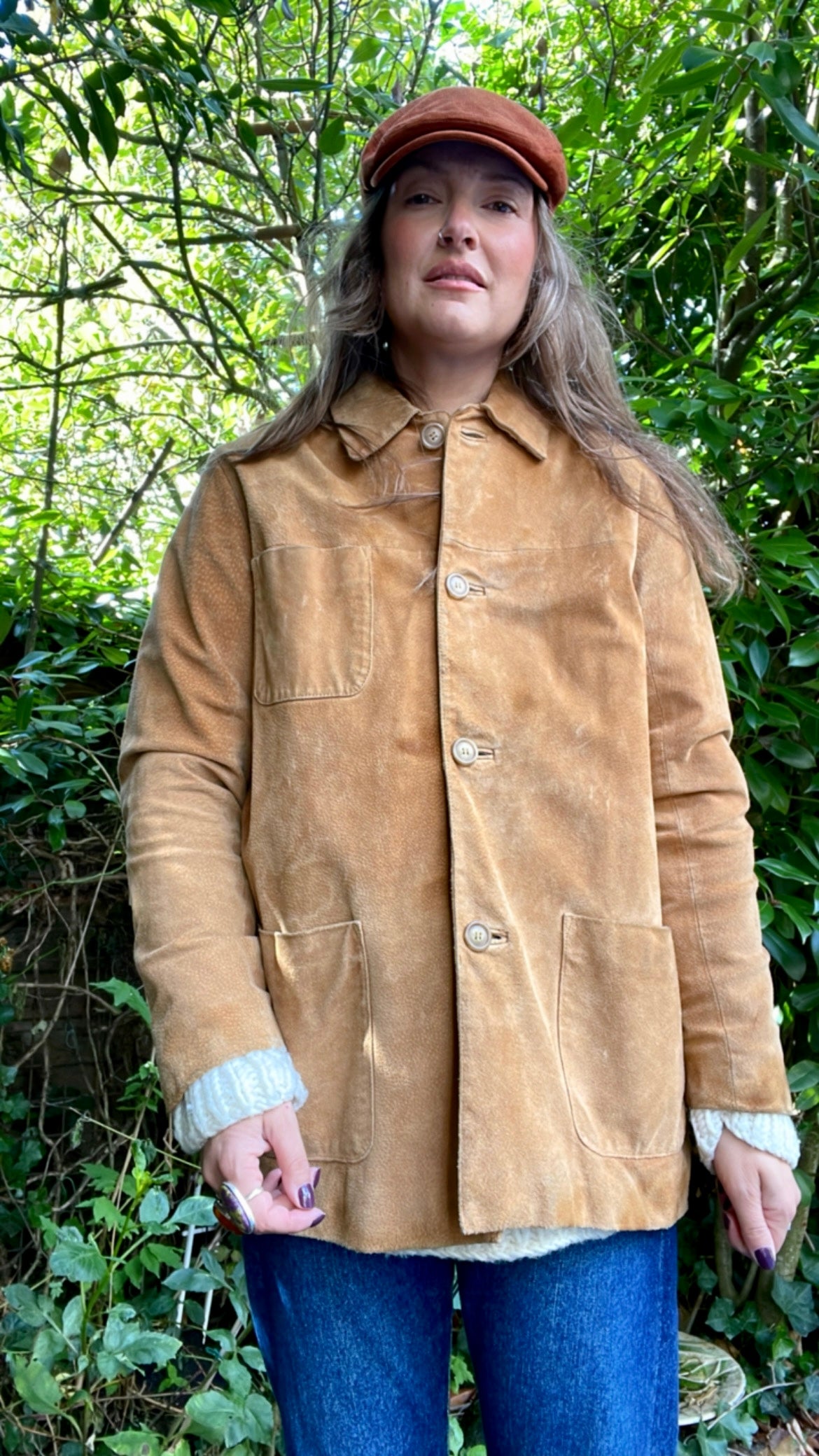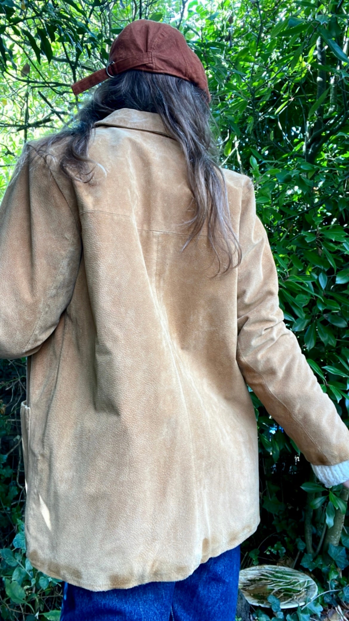 Super cool boxy suede jacket. Tan color is a classic fit in any wardrobe.