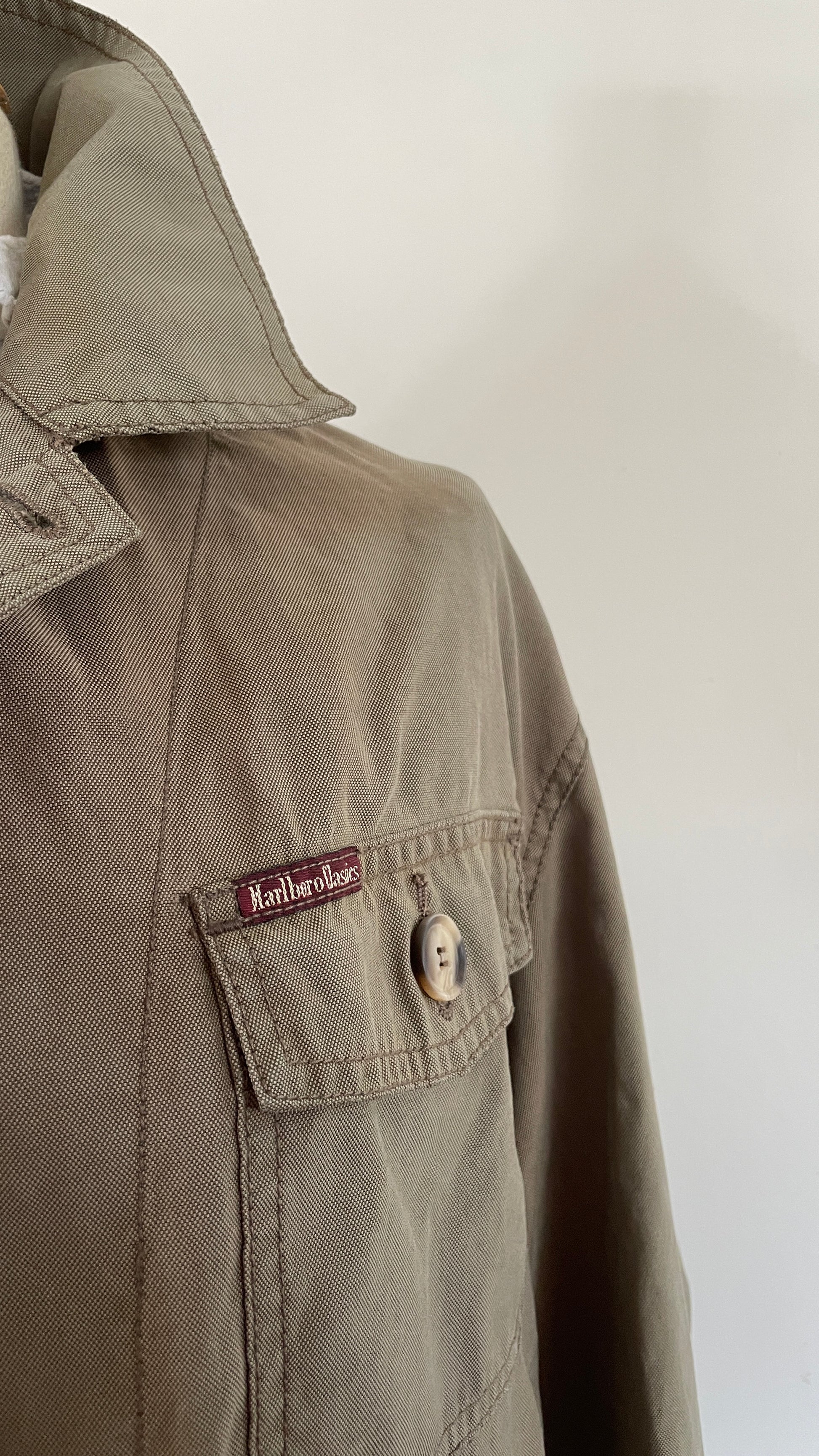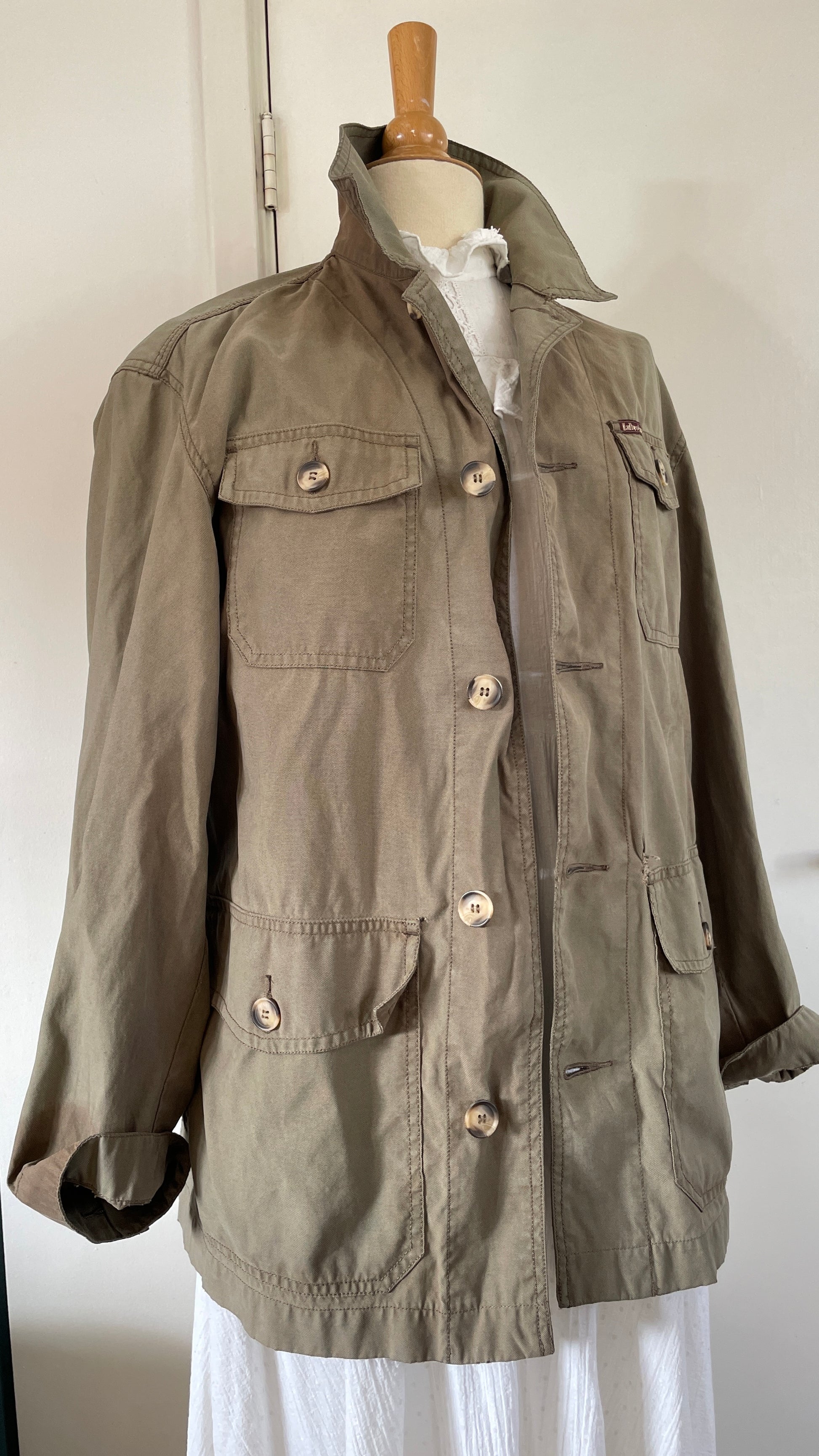 Super cool distressed chore jacket, it’s faded, it’s distressed and I love it! There’s things that look better new and there are things that look better old and this one is part of the last category. Khaki color fits with almost everything, a real classic. Two pockets on bust, 2 on the hips, all close with buttons. Please check all pictures to view what’s distressed.