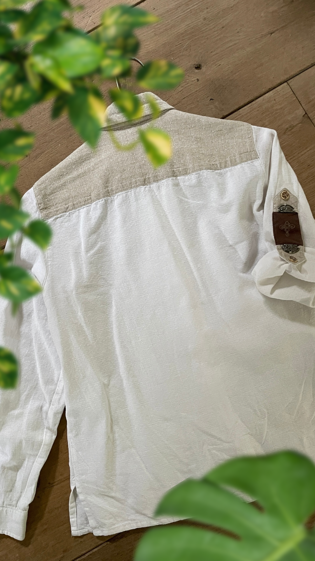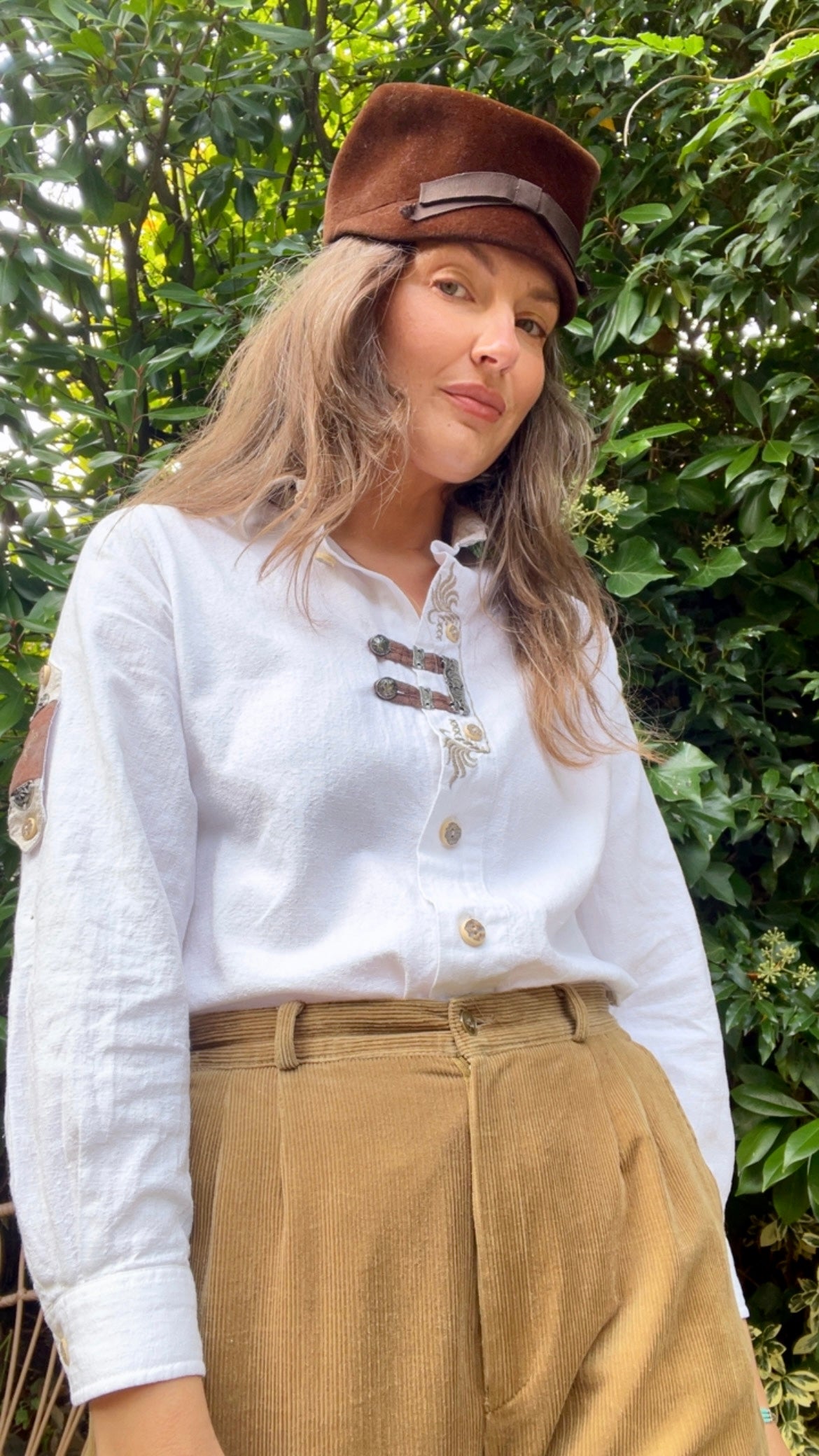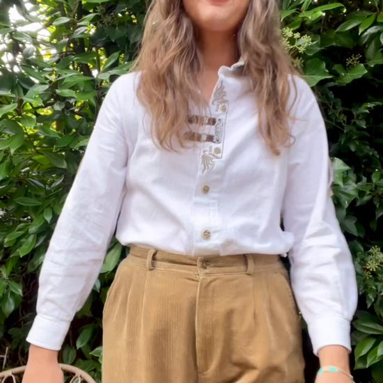 Stunning cotton top with typical Alpen style details. Embroidery and faux leather details (machine washable!). On warmer days the sleeves can be rolled up and buttoned up.