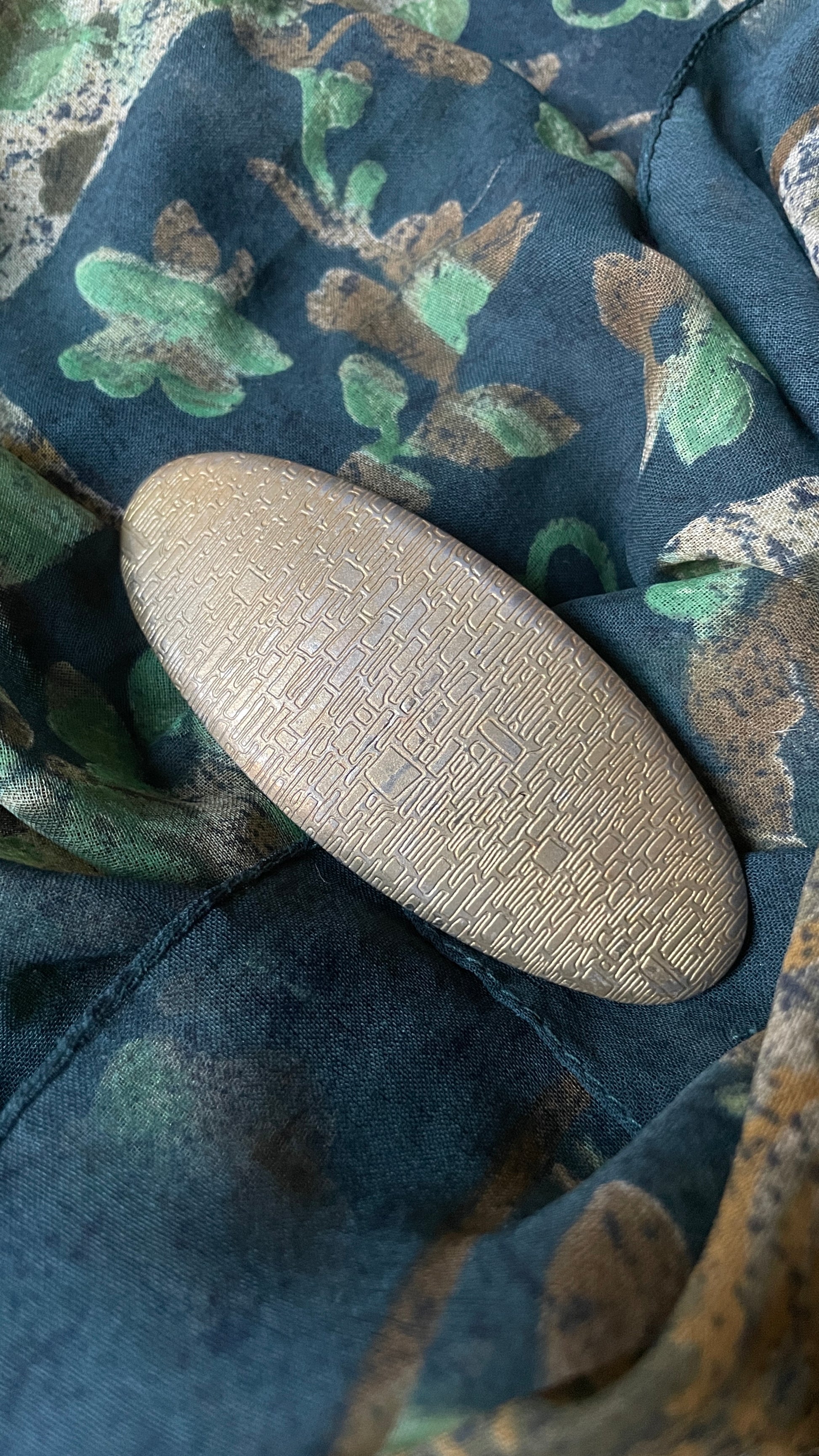 A Little tarnished but still spectacular I think. Super cute hair clip in a brutalist pattern.
