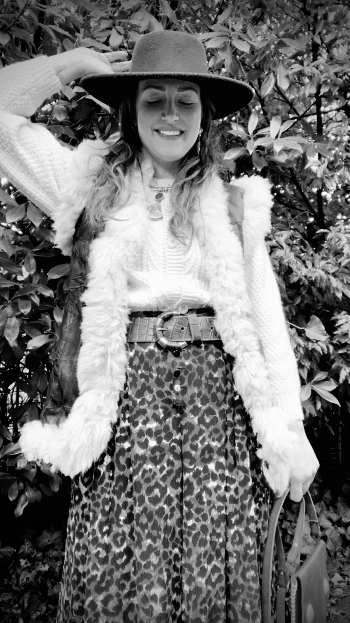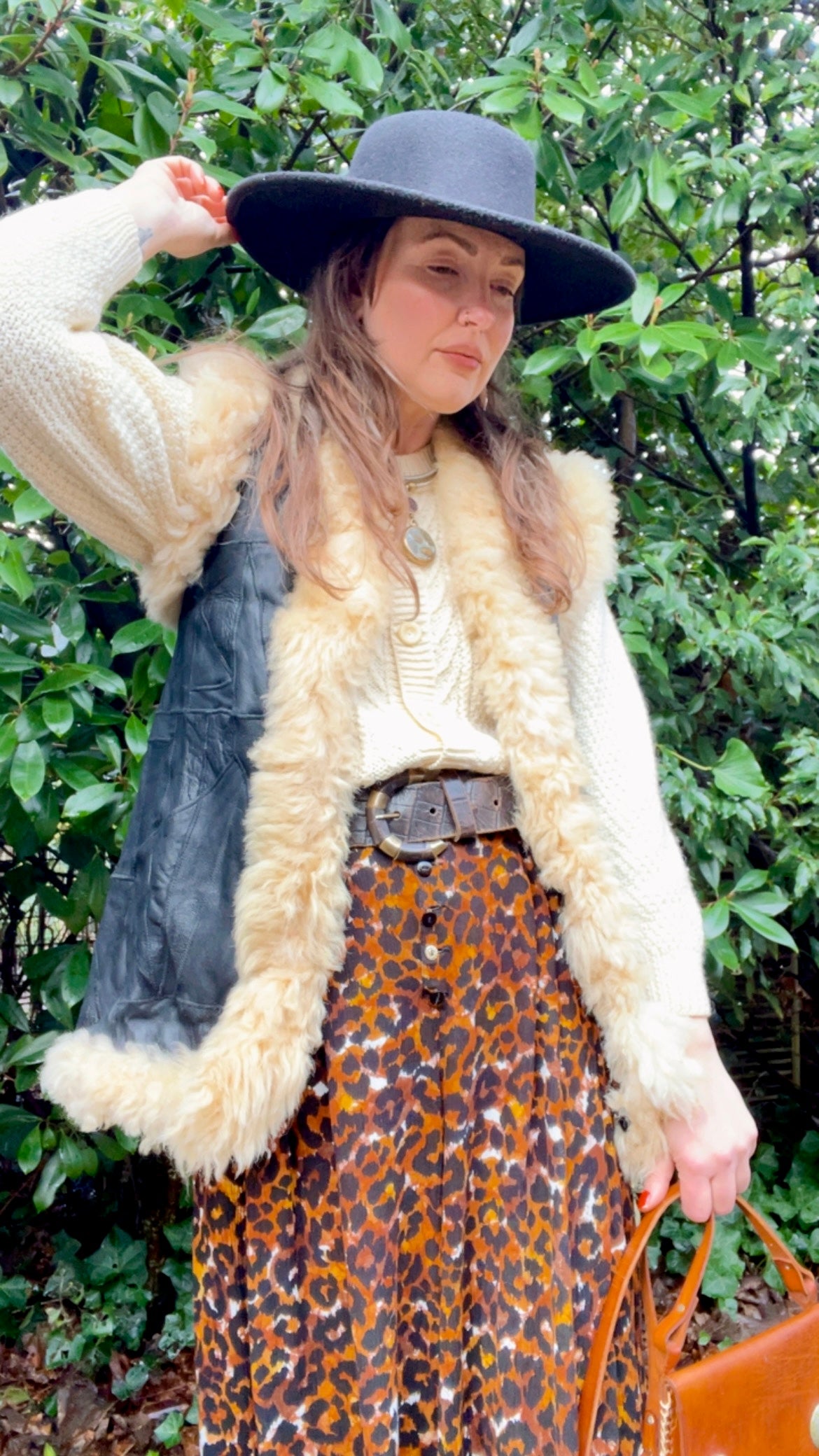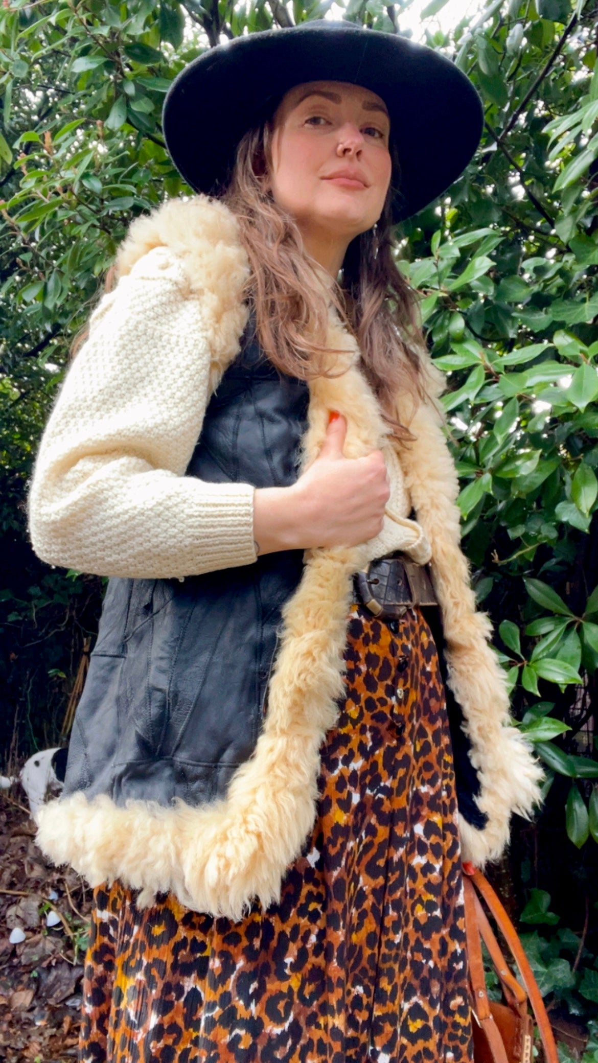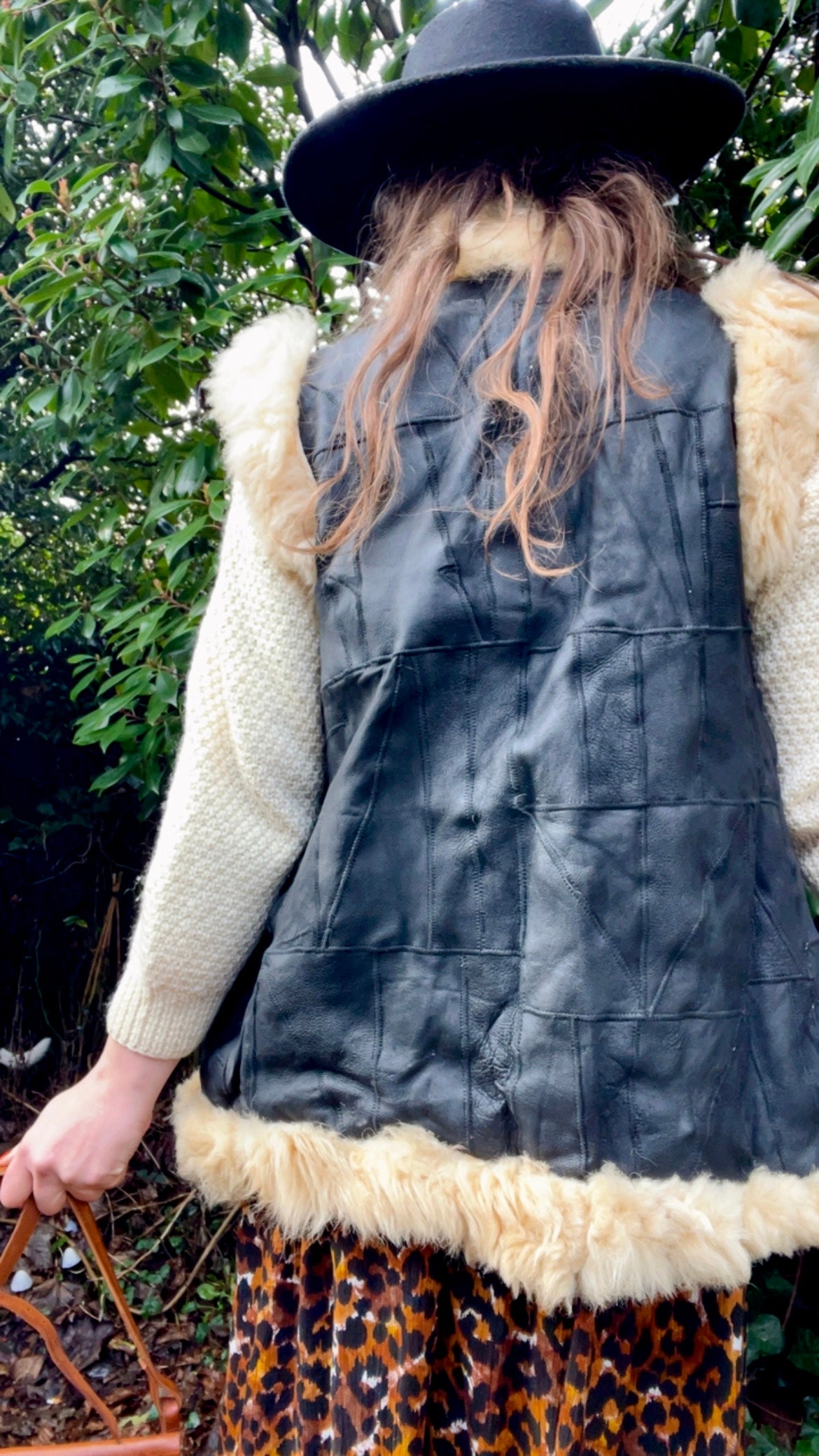 Super cool shearling leather patchwork waistcoat. Lining warm and fluffy black and trim is in a beige/ cream shearling. A perfect layering piece to not only look cool, but keeps you comfy and warm.