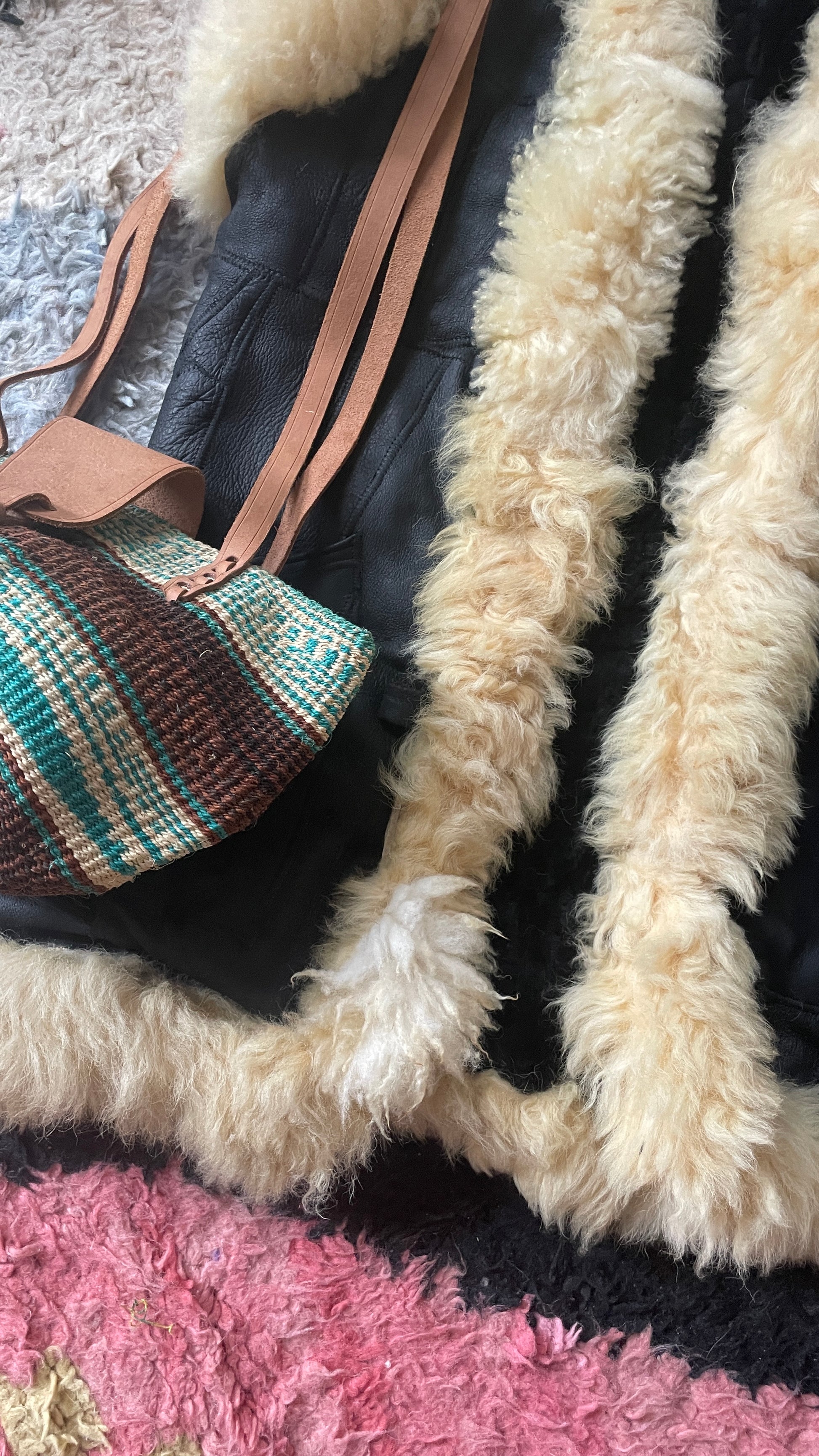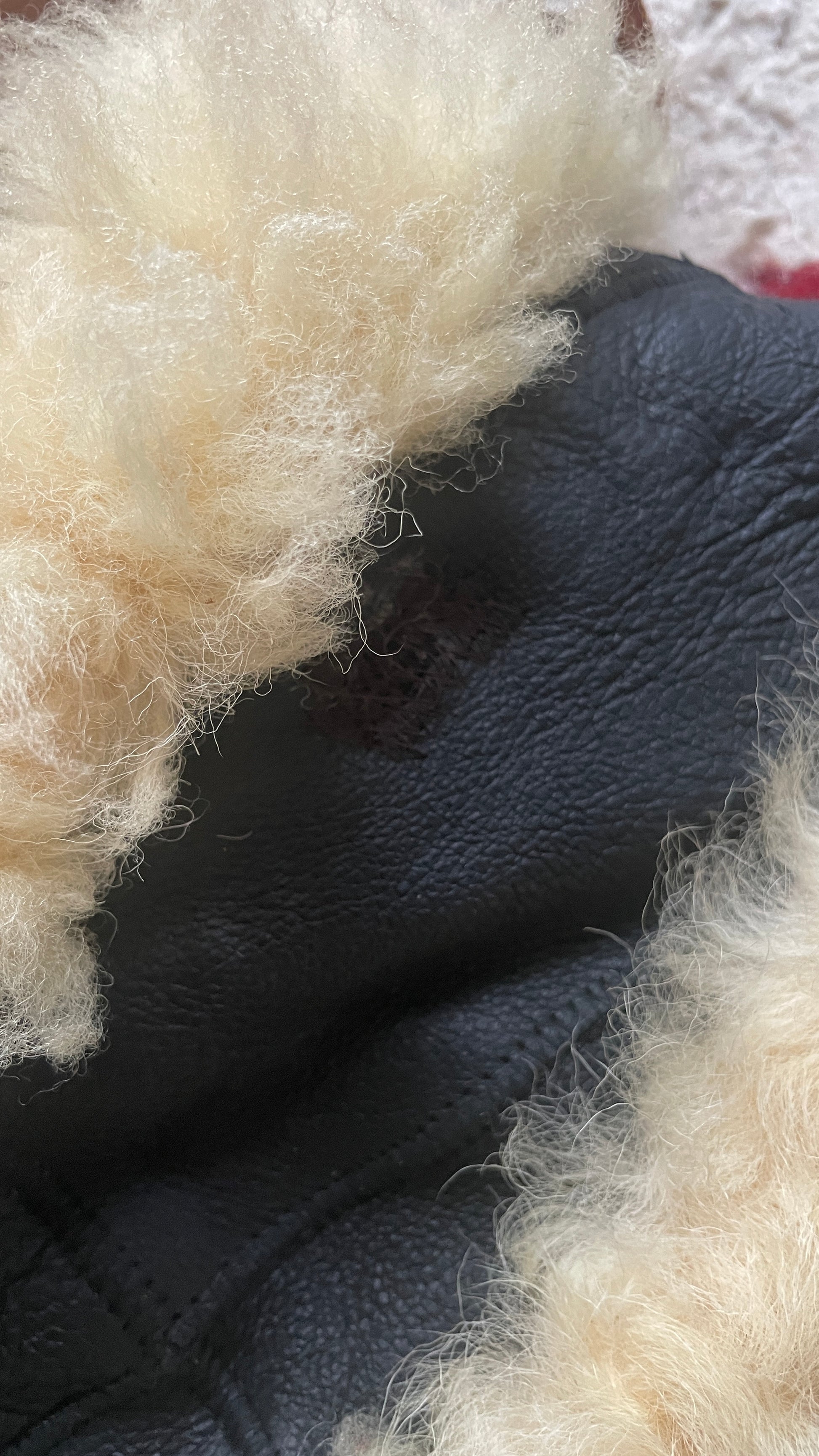 This beauty has two repairs, a bold spot in the trim is filled in with a piece of shearling and a little hole on the right front shoulder is repaired. This repair is hardly noticeable due to the trim and the patchwork design. The leather is treated with leather oil that conditions and maintains the leather. I advise you to repeat this yearly to maintain a good quality leather and prevent it from drying out.