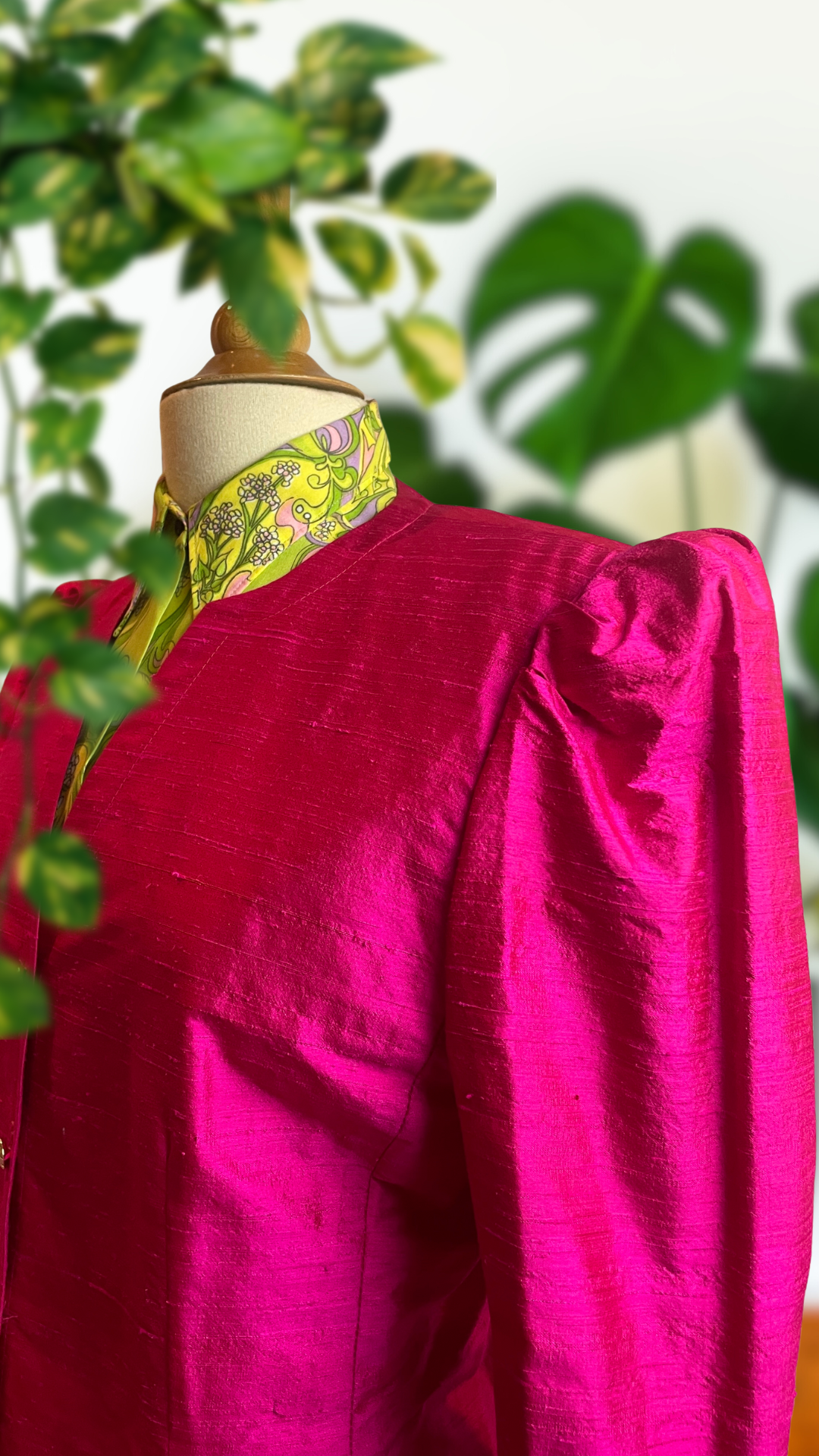 Need a raise? This suit has got your back! Together she’s pure pink power. Separate you can easily dress it down. The fabric is a beautiful 100 raw silk. The skirt has a semi elastic waist-belt and closes with a zipper on the back. The blazer has shoulder pads and puffed shoulders.