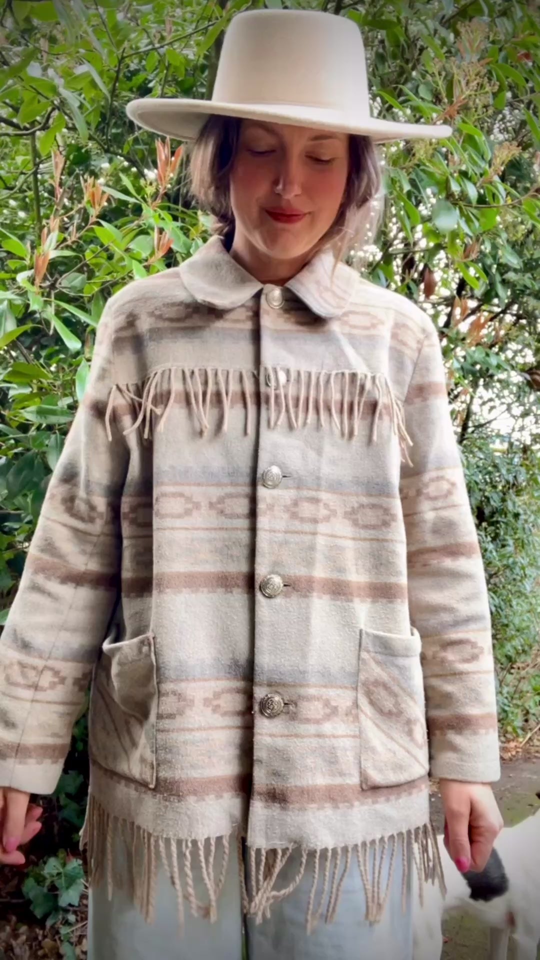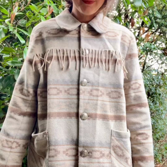 1980’s-1990’s blanket style, Southwest Western shacket. Frings details, box shape and rounded collar. Silver color buttons and two front pockets. A very cool layering piece for colder days and as an outdoor jacket in spring/fall. Not lined or padded.