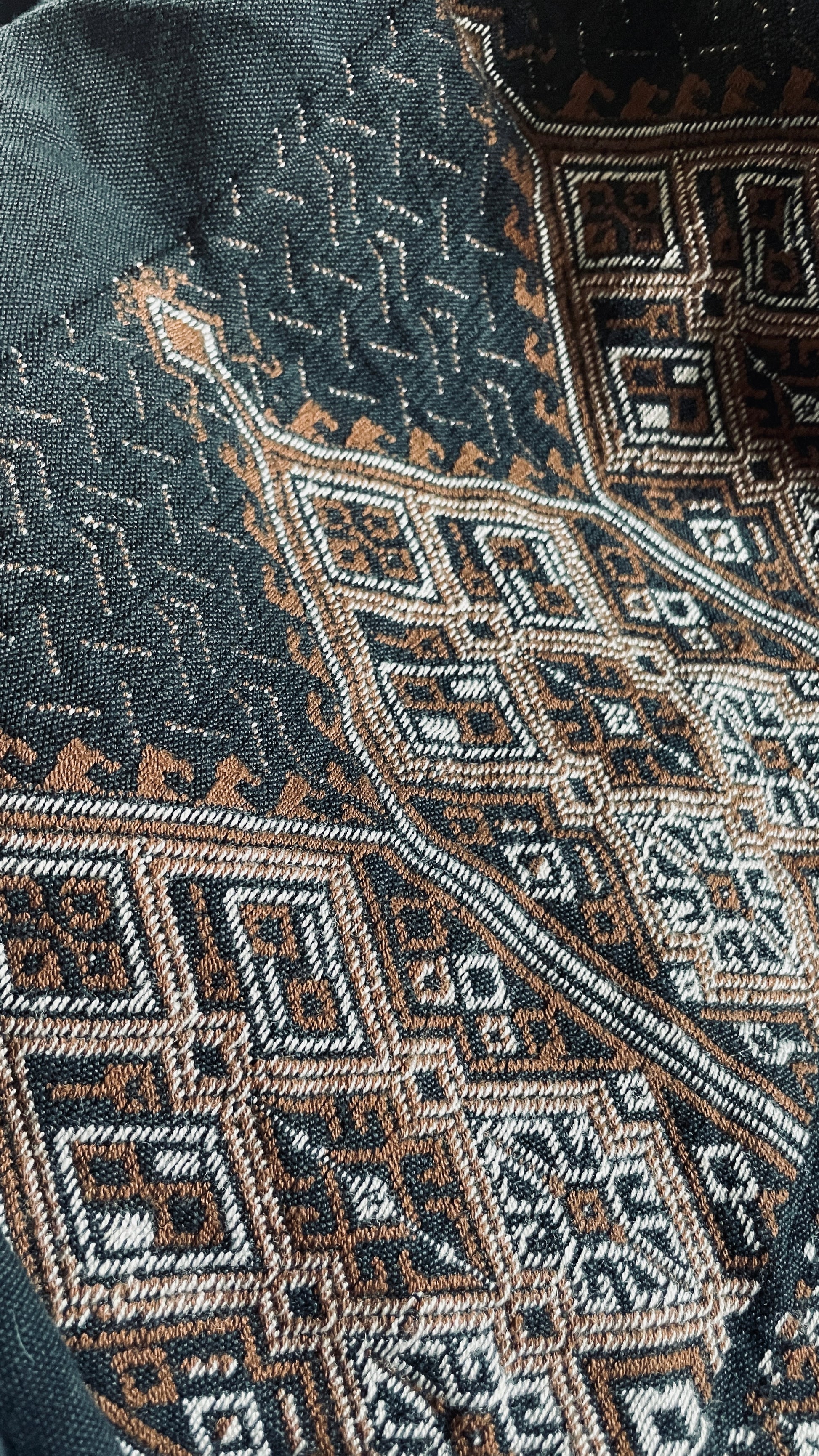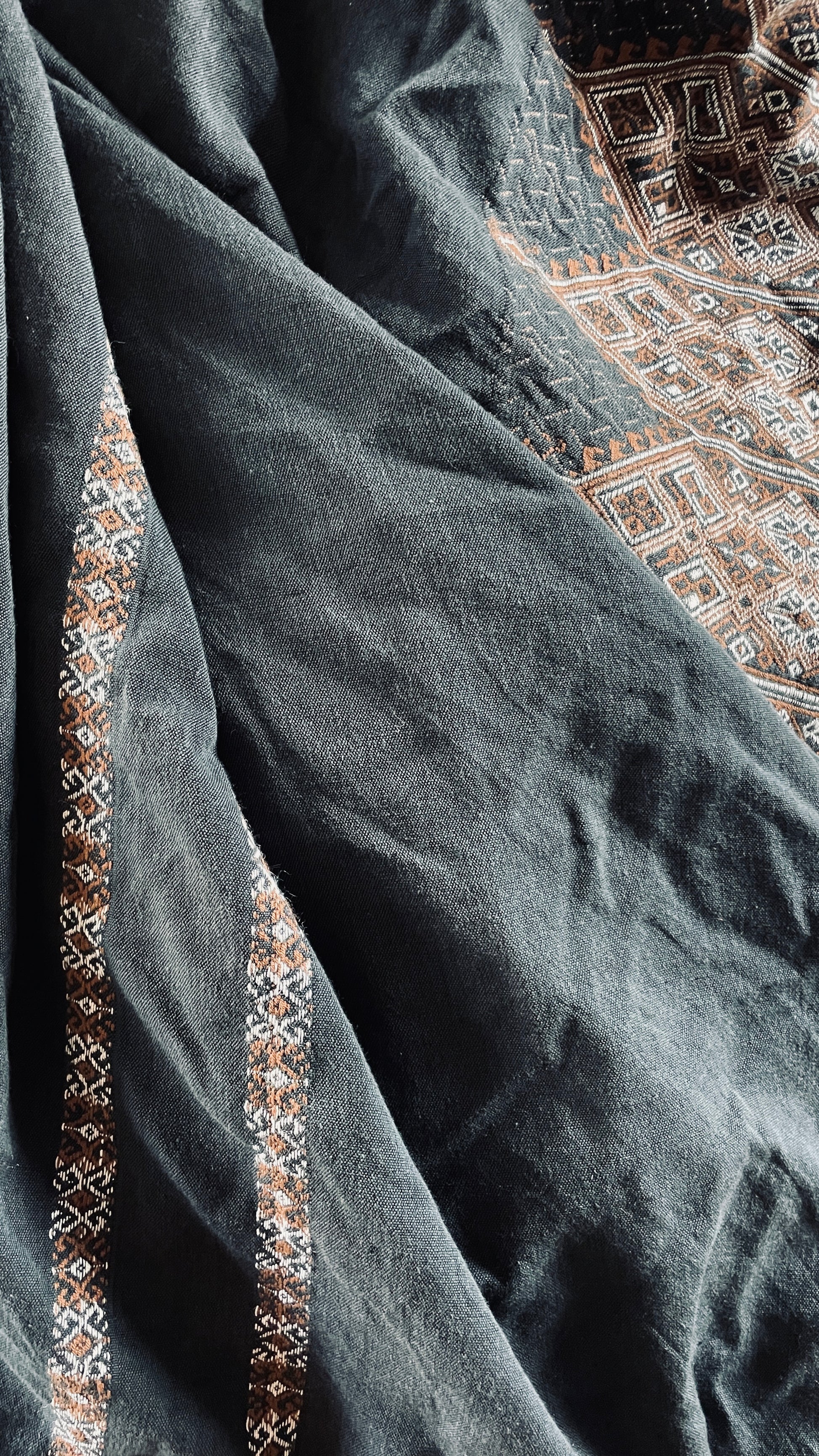 Gorgeous dark grey, call it charcoal wrap skirt with woven pattern. A very beautiful quality fabric, artisan made. When using measurements, consider the waist is a total of the fabric width. This means consider a certain amount of overlap.