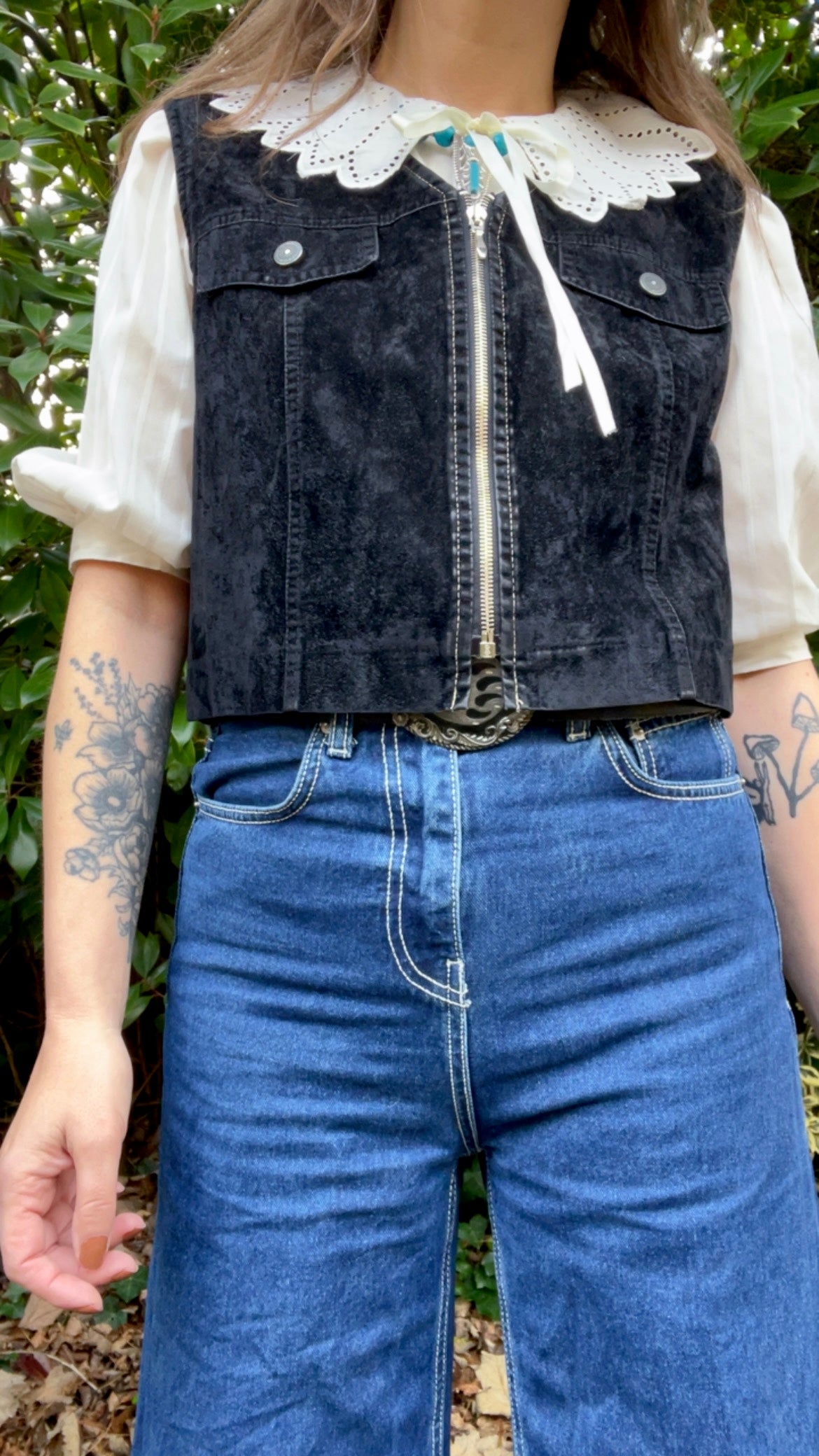 Pretty little waistcoat or top with faux suede front and stretchy ribbed back. Closes with a metal zipper. Great layered or just as a top on warmer days.