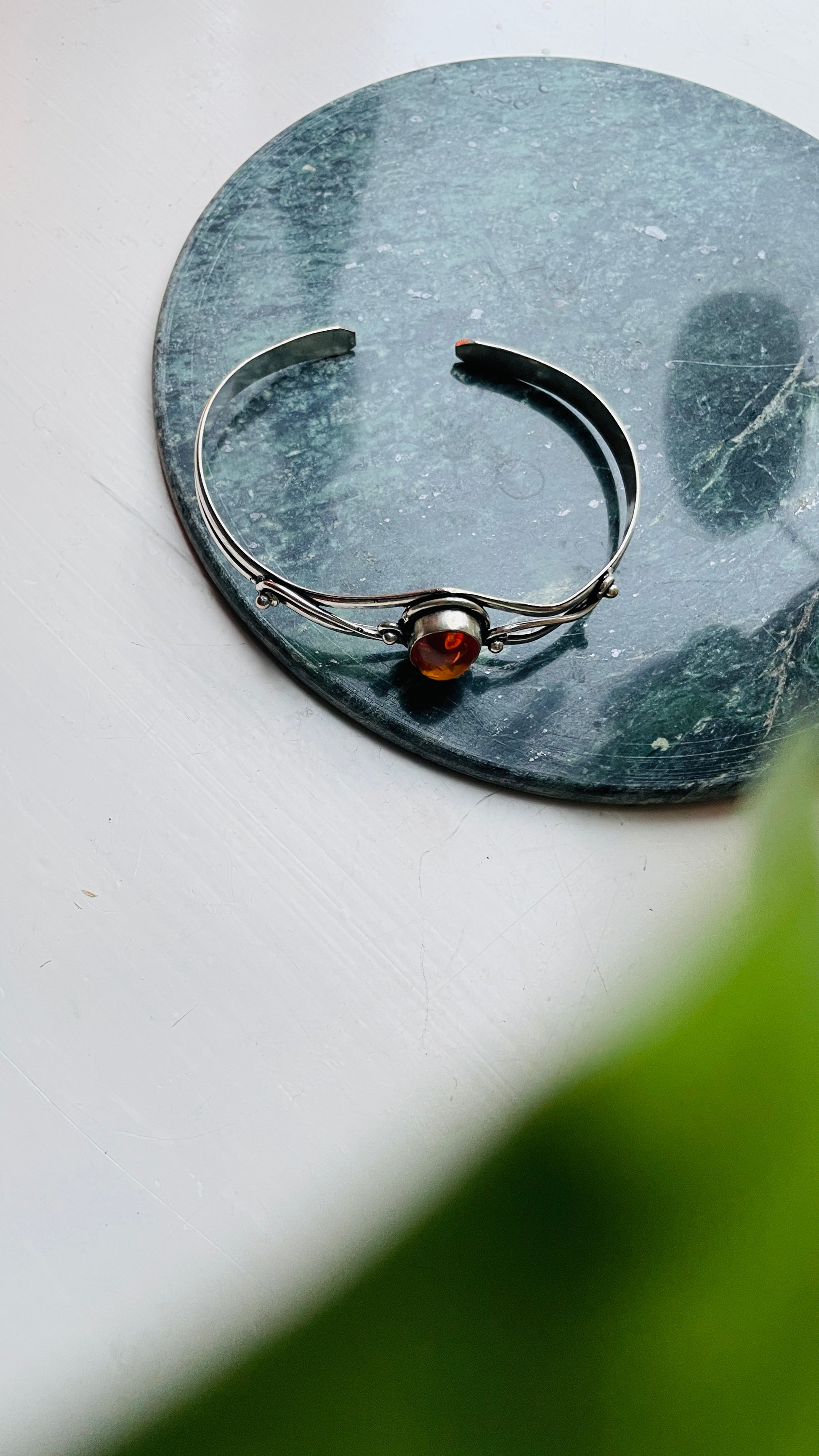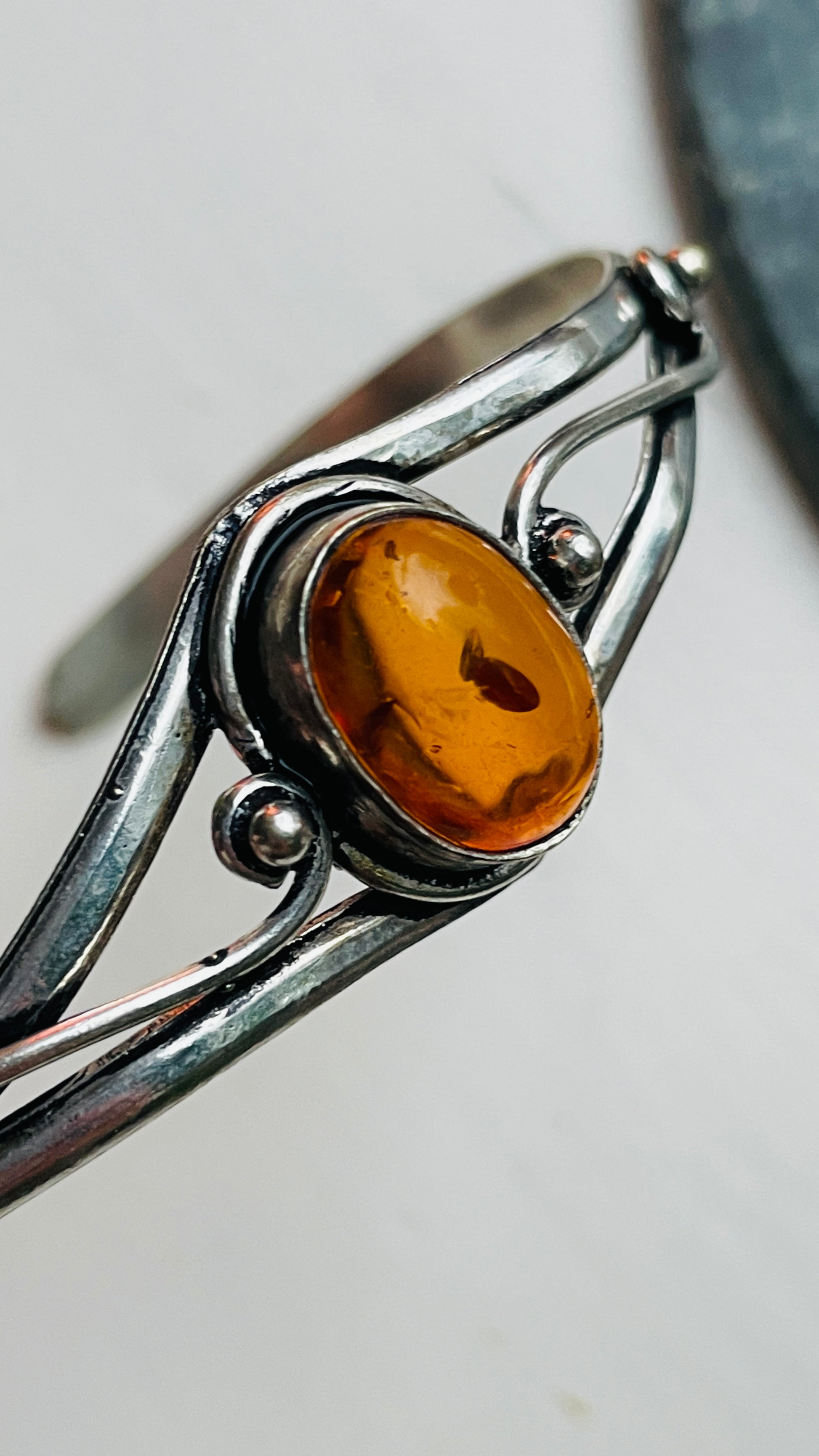 Very cute silver plated cuff bracelet inlayed with a piece of honey colored Baltic amber. Baltic amber is not a stone, but an organic material that is considered a gemstone, valued for its historical significance and natural beauty. It is fossilized tree resin, primarily from coniferous trees, dating back 40-50 million years. It’s soft and warm unlike stone that is hard and cold. It is considered a medicinal material used in pain relief. This is a more modern made piece with deliberate patina to give the design definition. The cuff can be carefully bend to fit. No markings, I suspect this bracelet might be silver plated and not solid, price adjusted as such.