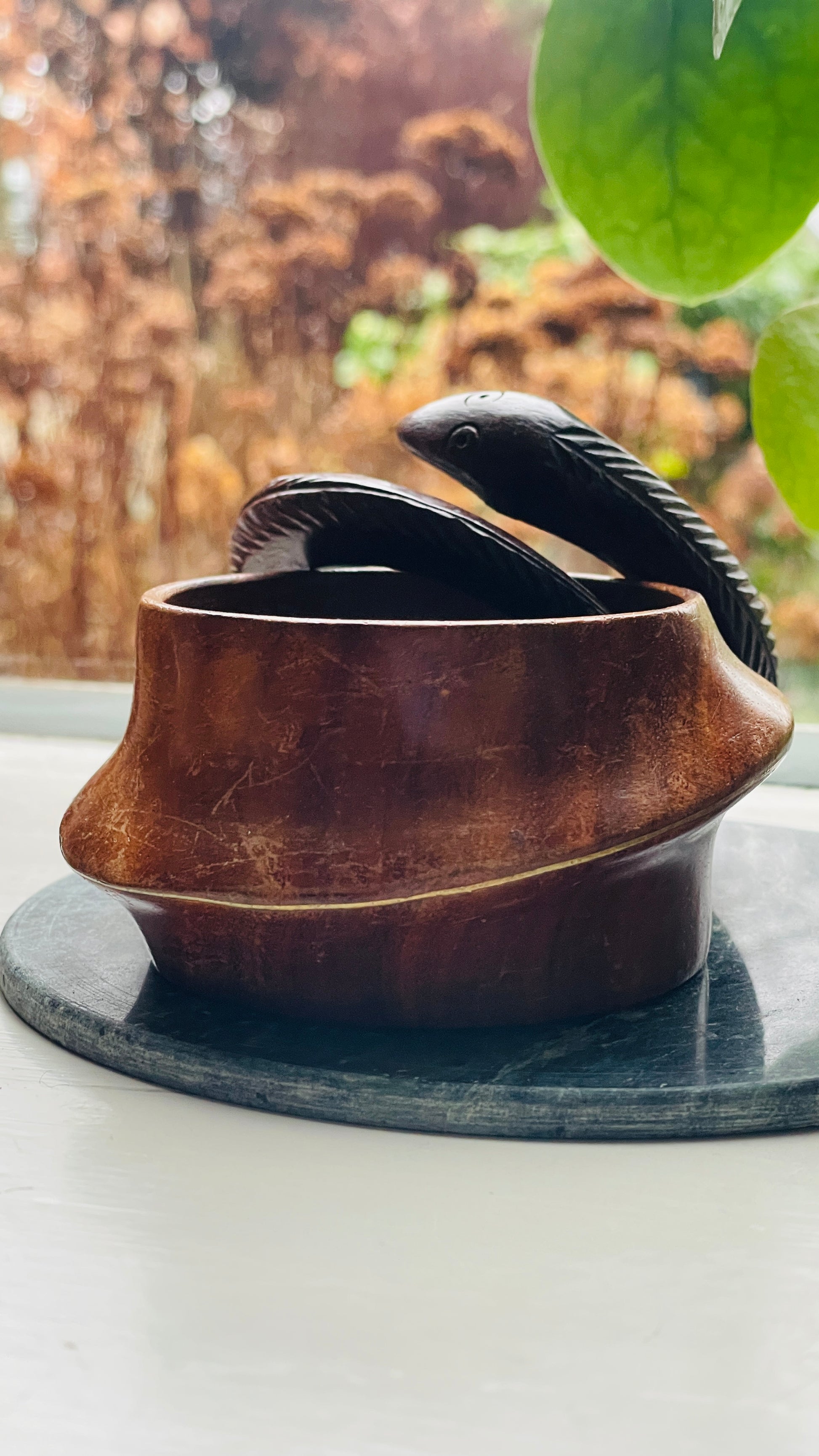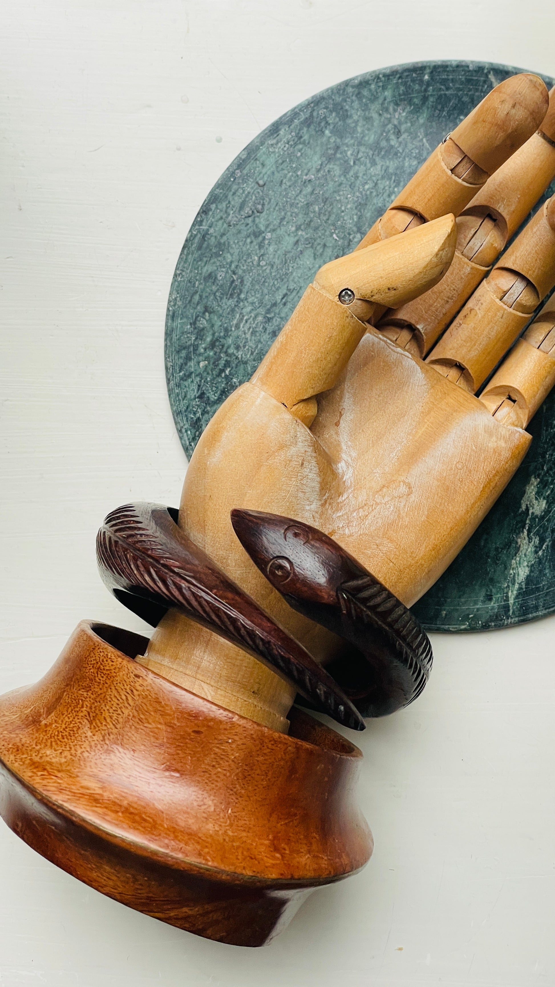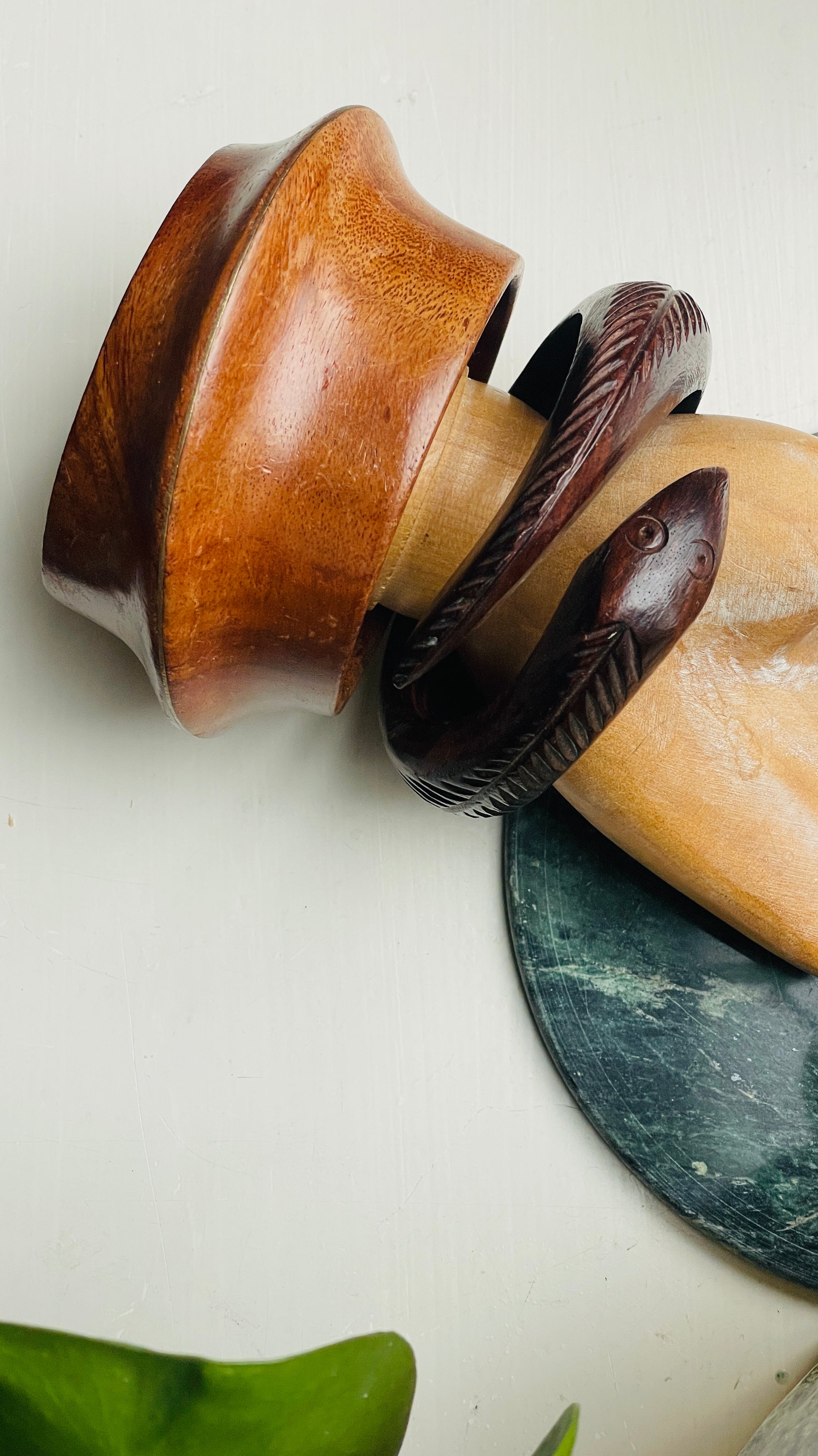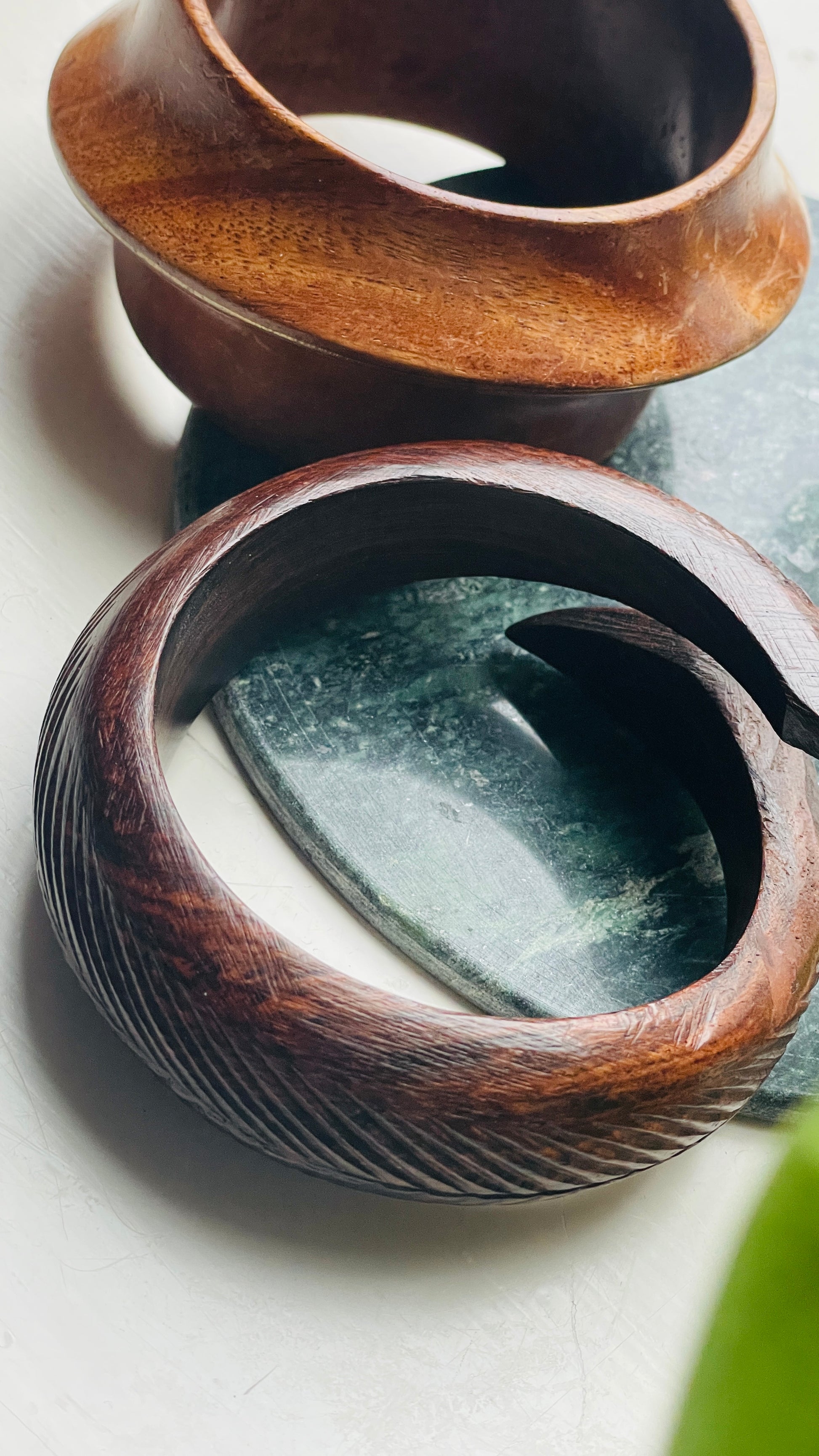 Very cool cuff bracelets. Carved out of wood. One shaped like a snake, the other a flowy shape with subtle messing inlay. The bracelets are treated with wood oil that conditions the wood, gives it a subtle shine and keeps it in a great condition. It’s a skin and even food safe plant based oil.