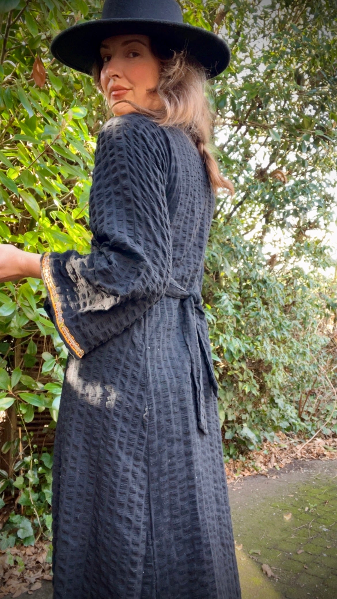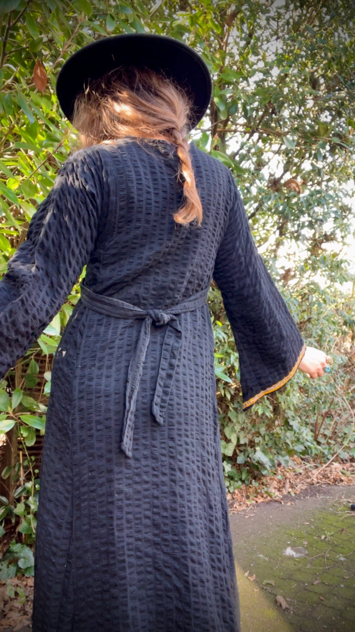 Absolutely gorgeous dress. Trumpet sleeves, decorated with decorative trim. The bust is beautiful with an insert, little woven flowers, sequins absolutely stunning. The waist can be adjusted with a bow in the back. The dress is long and can be even longer, there’s about 7 cm seam allowance. The fabric is cotton, in a waffle structure.