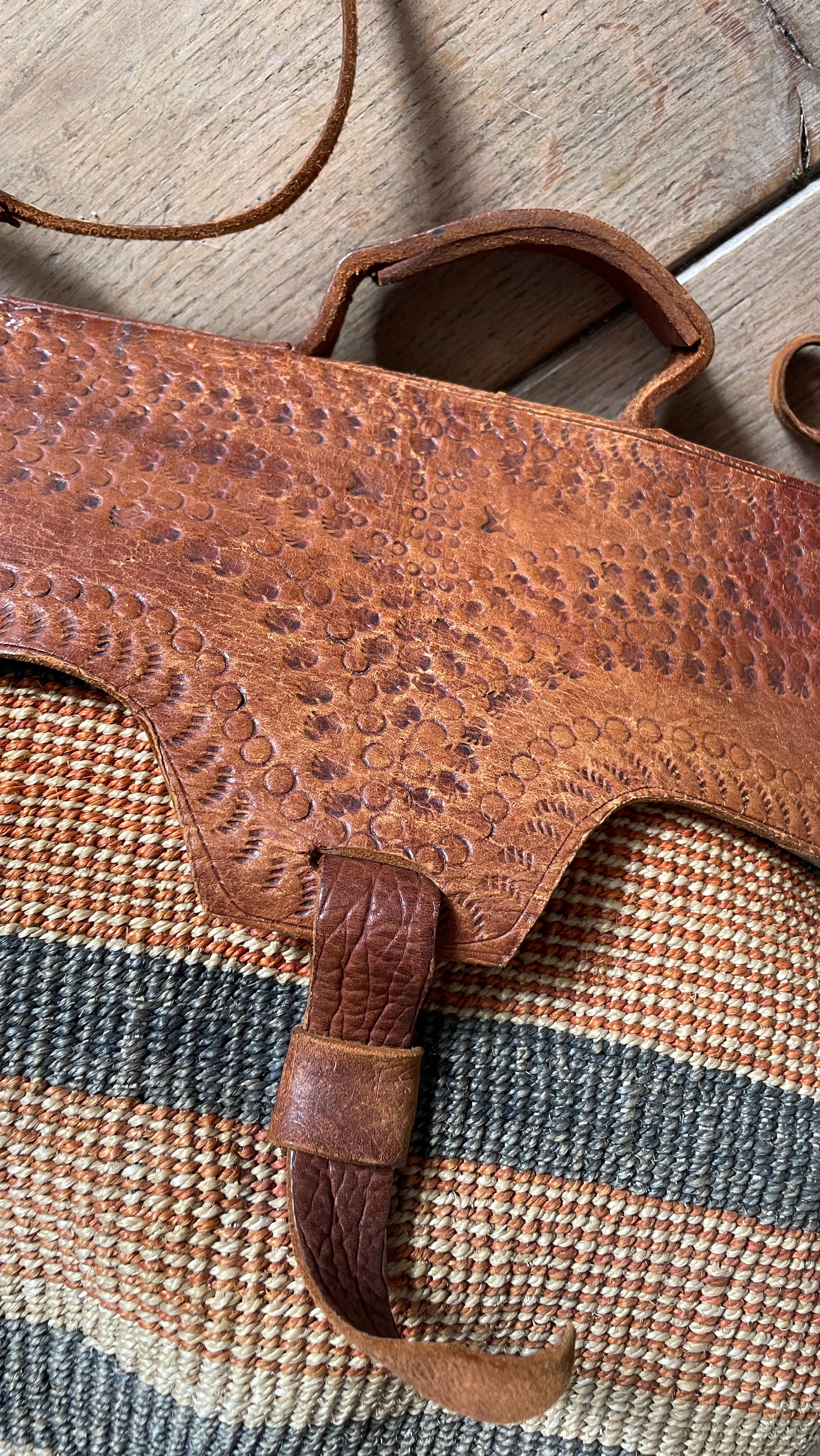 Super cool bag, woven grass basket type base with leather flap and strap. The leather is beautifully decorated. This bag is old but still in such a good shape. The quality is amazing! The leather is treated with leather oil. I advise you to repeat this once a year or more often if the leather starts to show signs of dehydration.