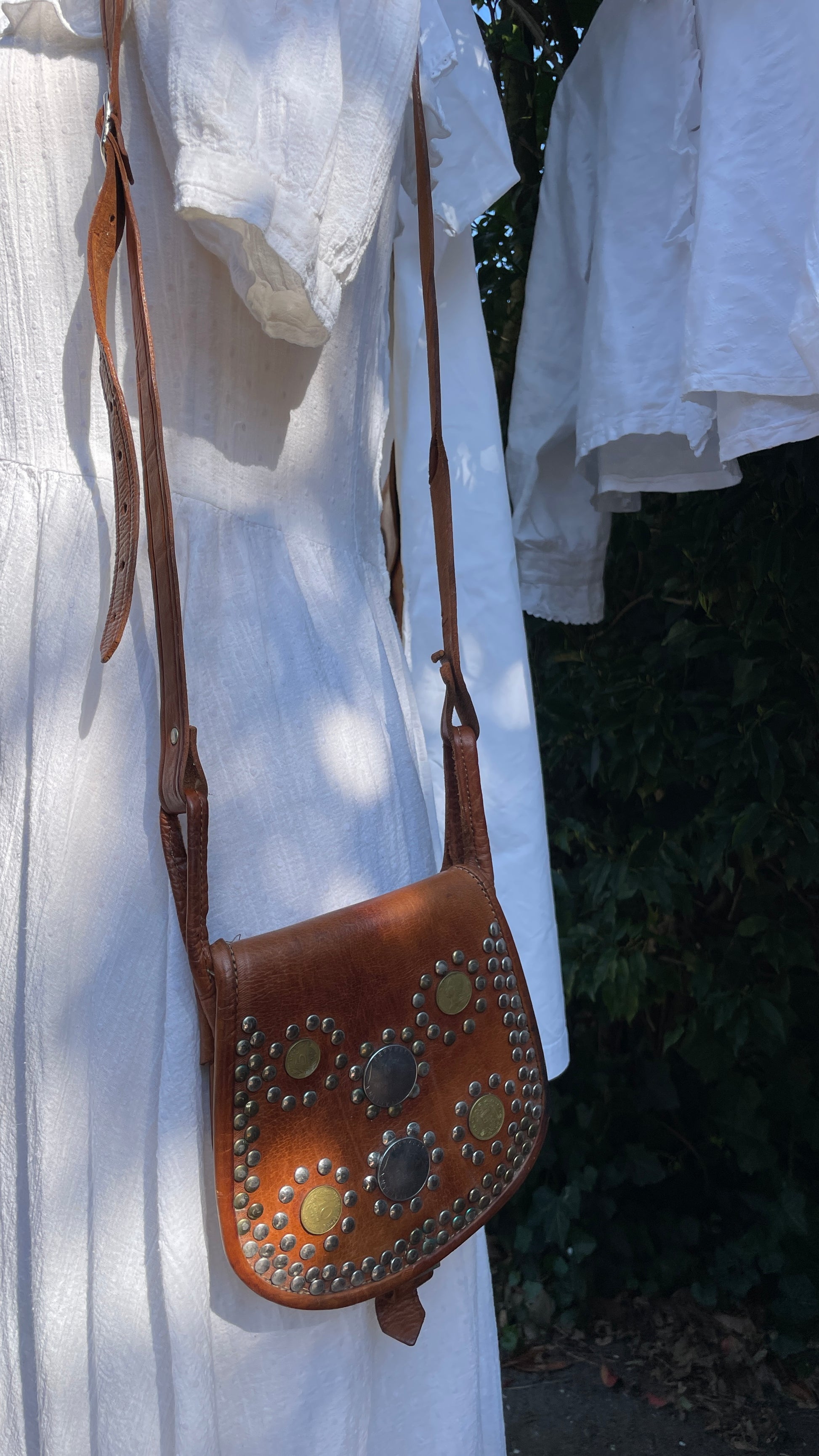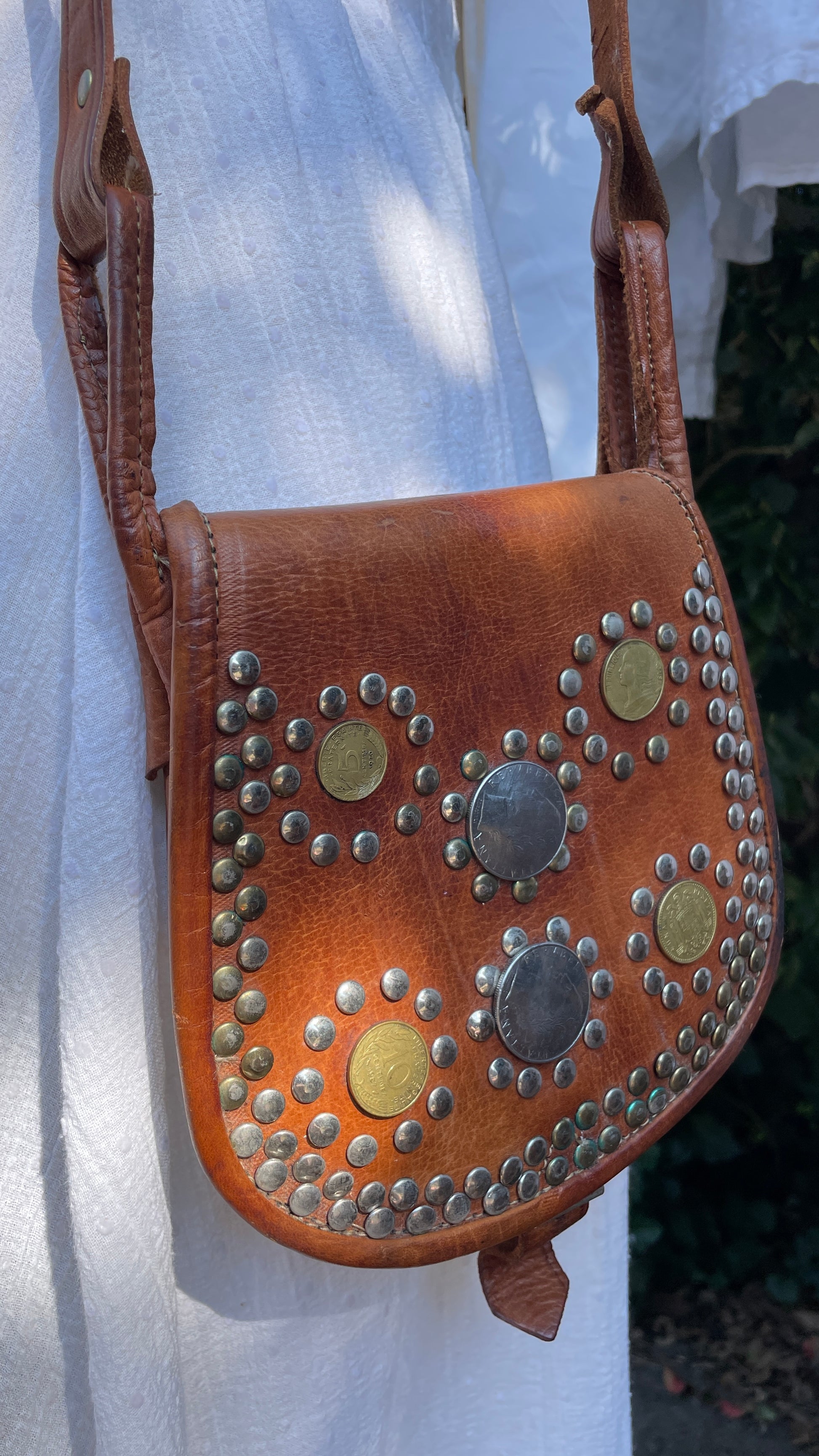 Lovely original 70s purse made from leather, decorated with coins and studs. Lovely small size that can hold your phone wallet and keys with ease.