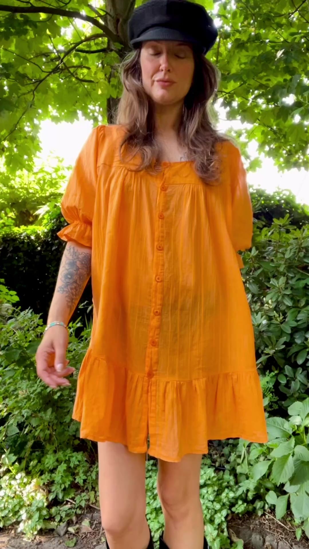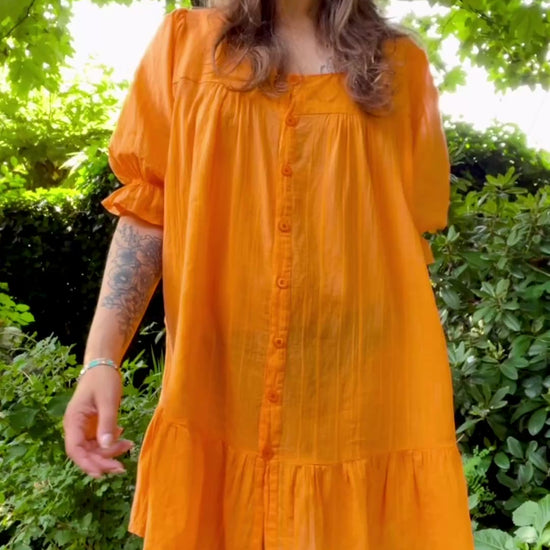 I would first up say the orange is less “in your face” irl, a little softer. Could be worn over pants or as a mini dress. Very cute balloon sleeves with ruffles, elastic cuff. Fits many bodies depending on the desired fit. Functional buttons all the way down, so could be worn open as a layering piece.