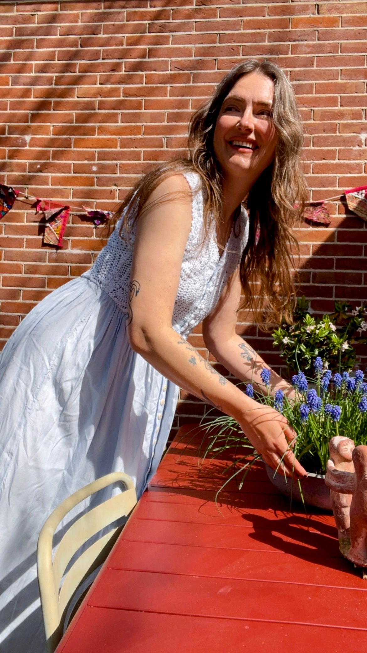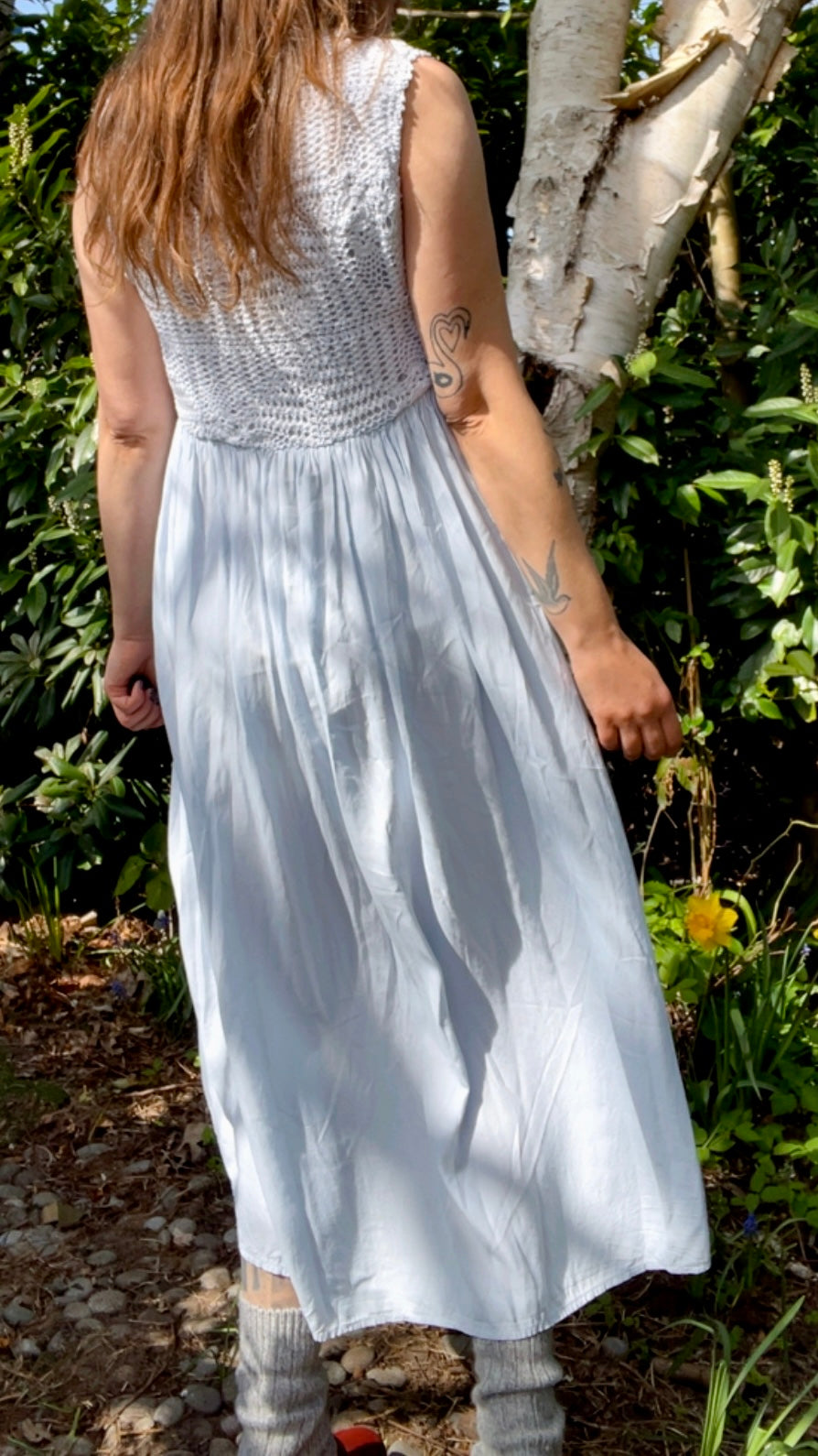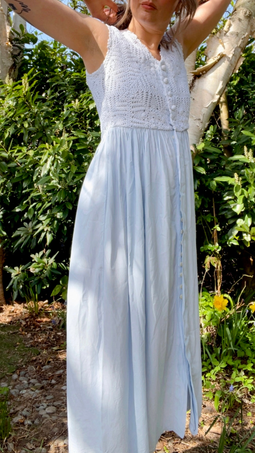 Amazing soft sky blue flowy dress with crochet bodice. Buttons all the way down, so that gives multiple styling options. Crochet top part is lines with a cotton gauze.