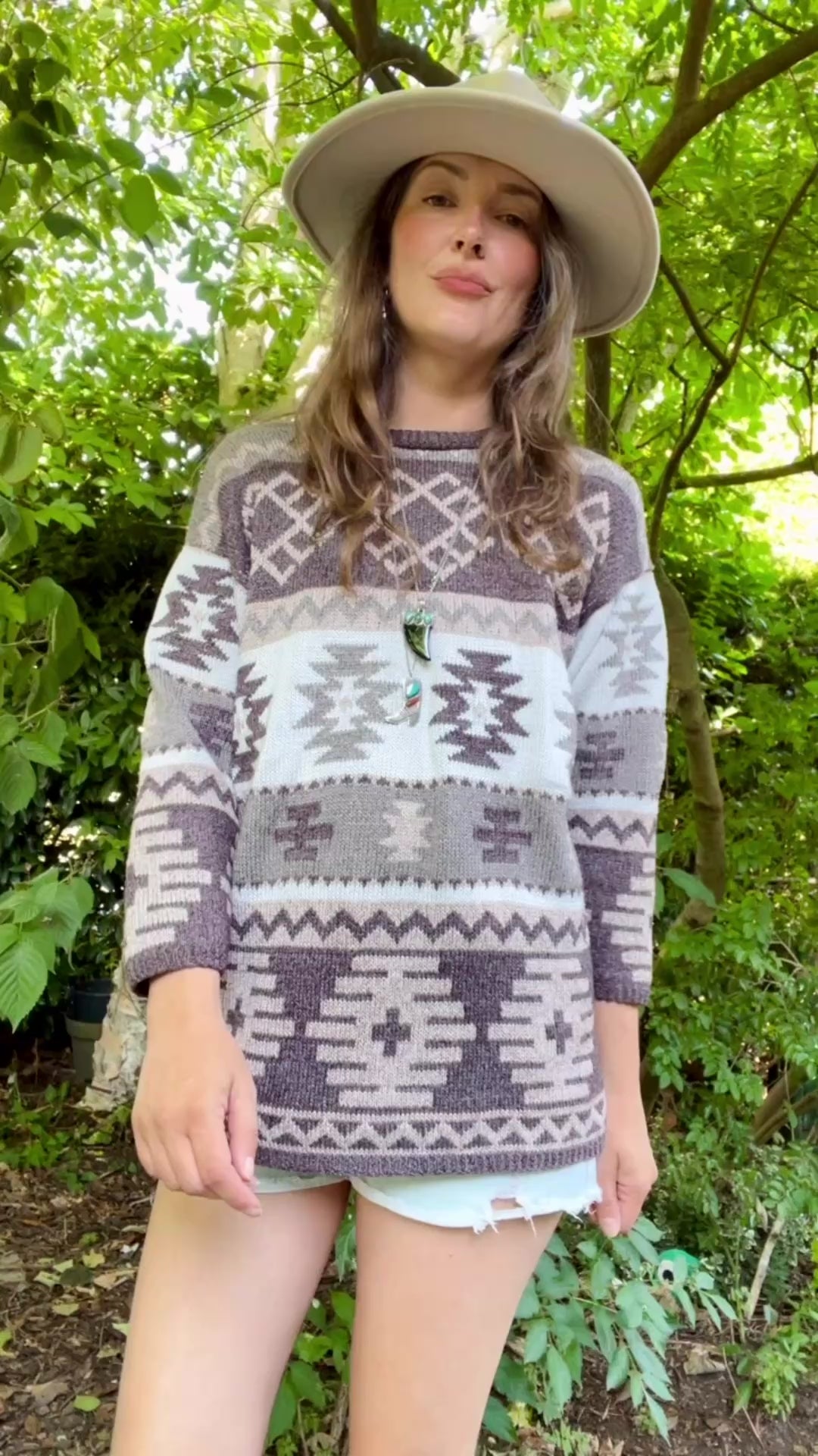 A beautiful handmade jumper. A heavy quality cotton in beautiful light grey to brown shades. Sleeves are on the shorter side for someone my (arm) length. A perfect opportunity to combine it with your favorite bracelets or layer it over a top with interesting cuffs if you think of this as a problem that needs solving.