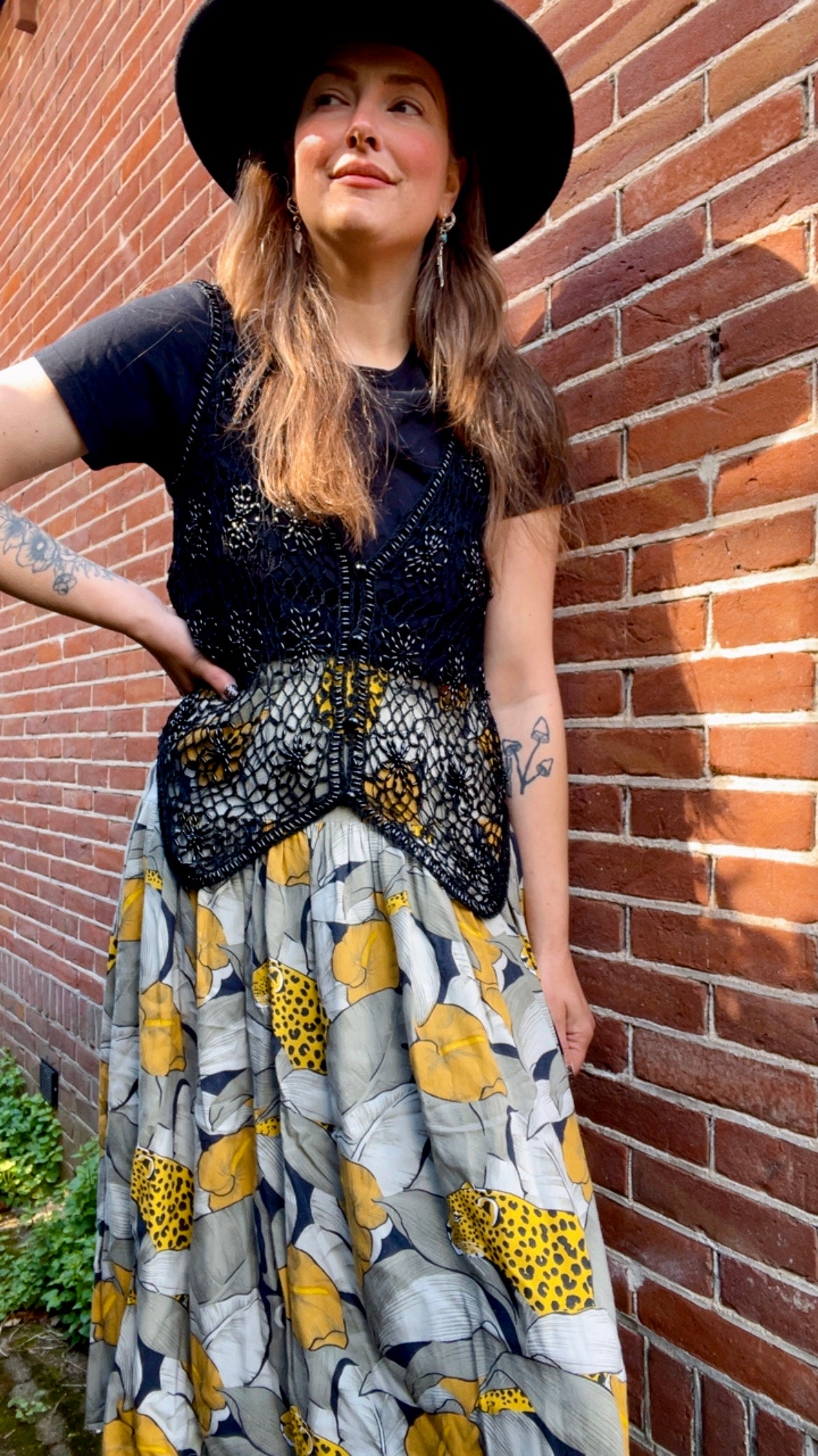 Cute layering piece, this crochet (or maybe even macrame) waistcoat with beaded decorations. Pitch black and subtle sheen.