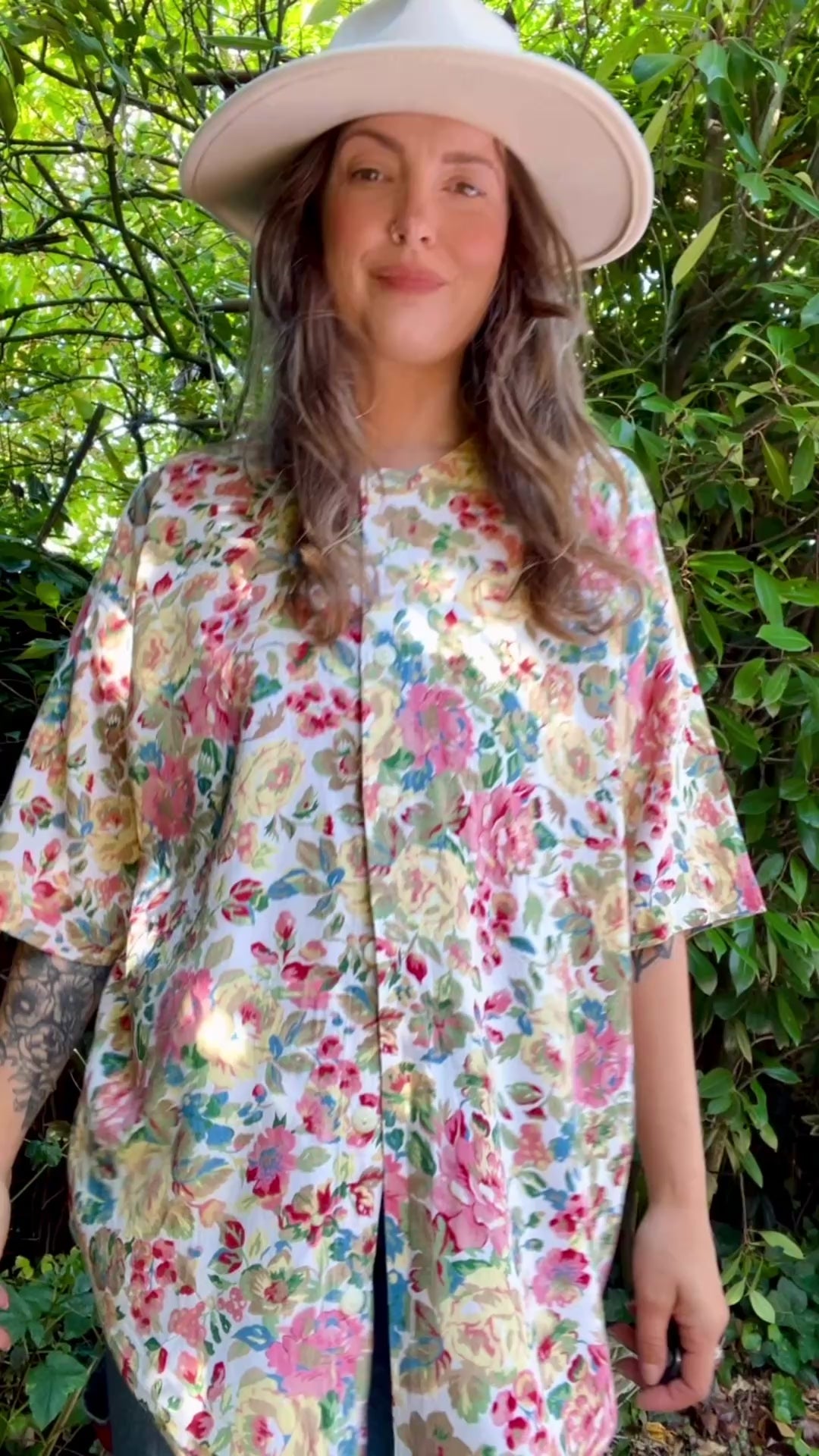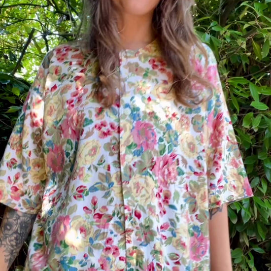 Very cute floral shirt. Closes with buttons all the way down and rounded hem.