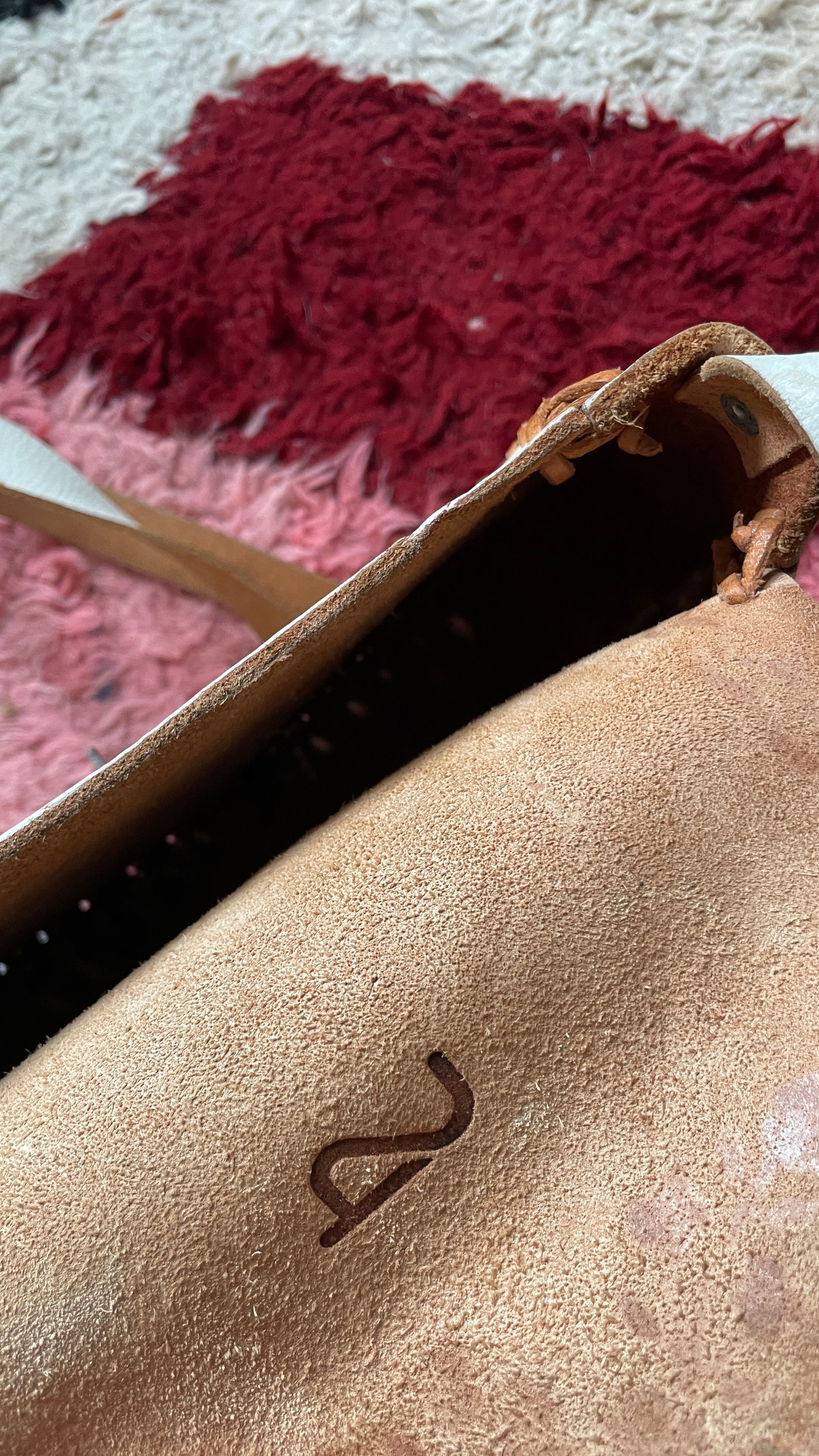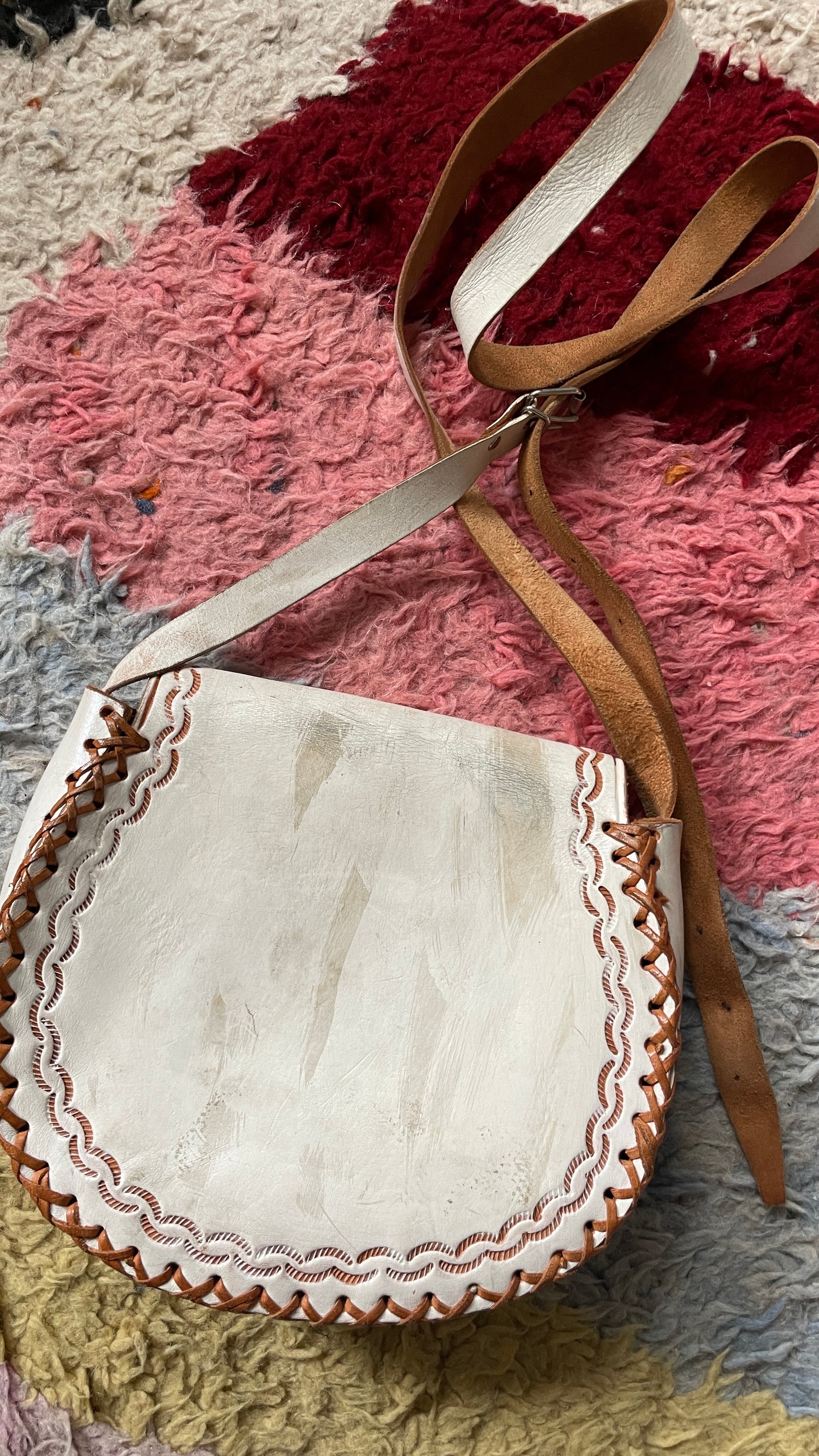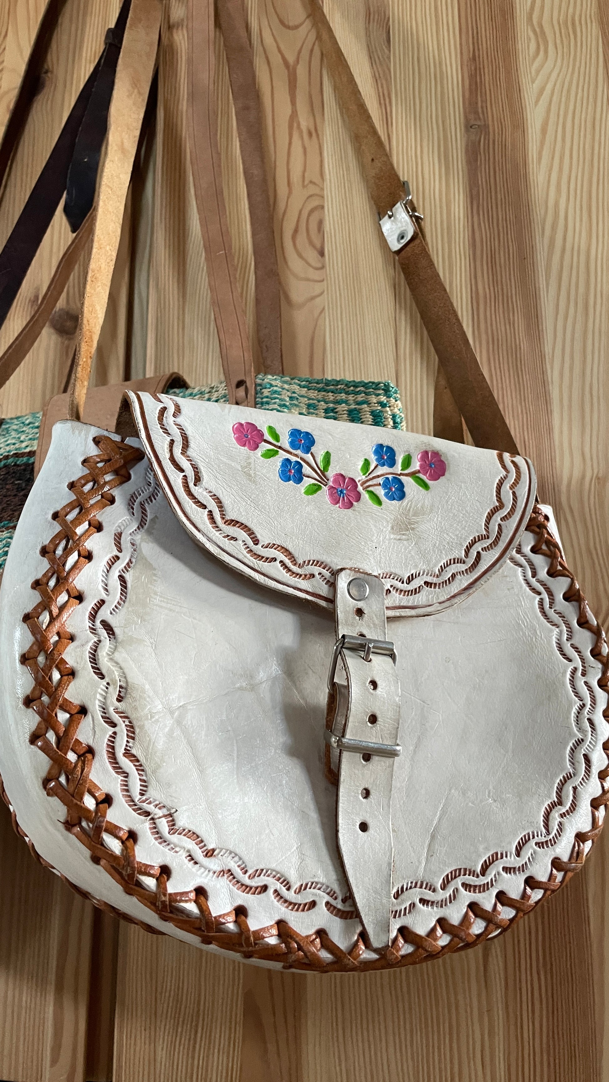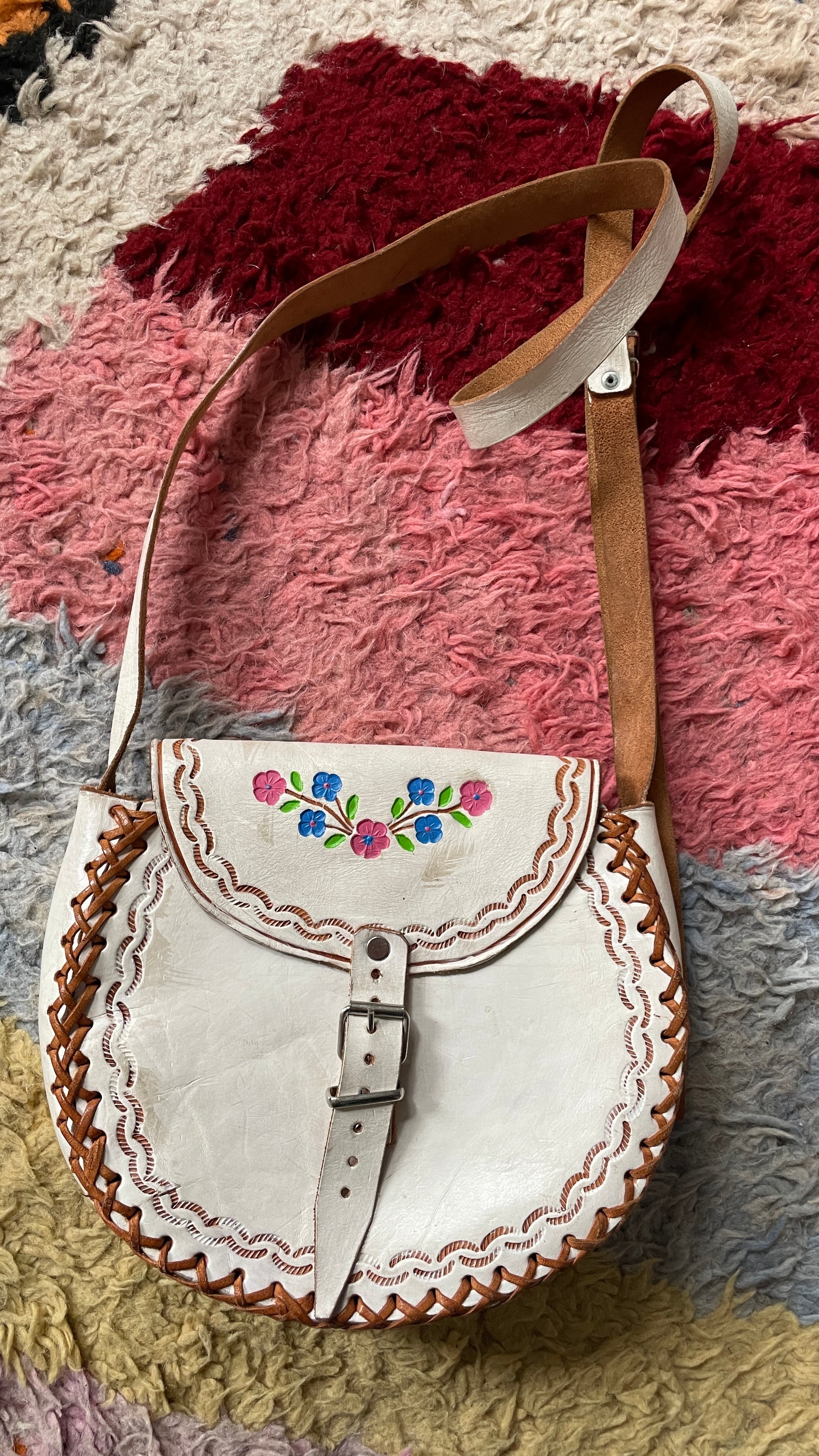 Super cool purse in white leather and hand painted flowers. The leather has a perfect worn look. It’s sturdy and thick high quality leather. Closes with a buckle in the front. The strap is adjustable and the purse can be worn both cross body and on the shoulder.