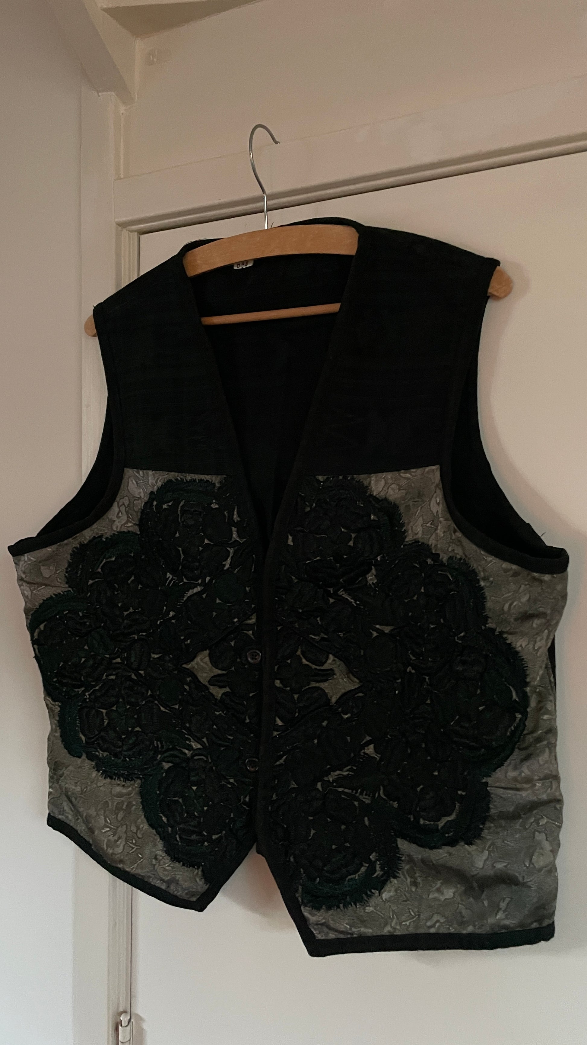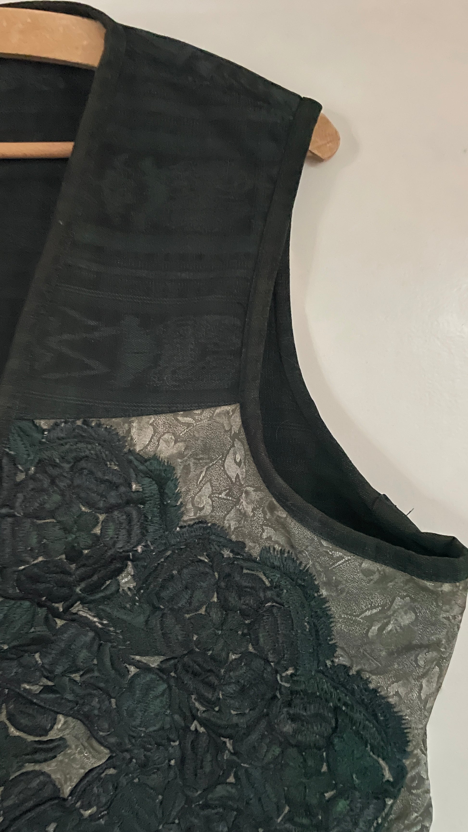 Stunning waistcoat in moody color palette. The color is a dark grey green. On first sight it seems like the base is one color but it’s a beautiful woven pattern. The front has embroidered flowers, what’s not to love. Closes with buttons in the front.