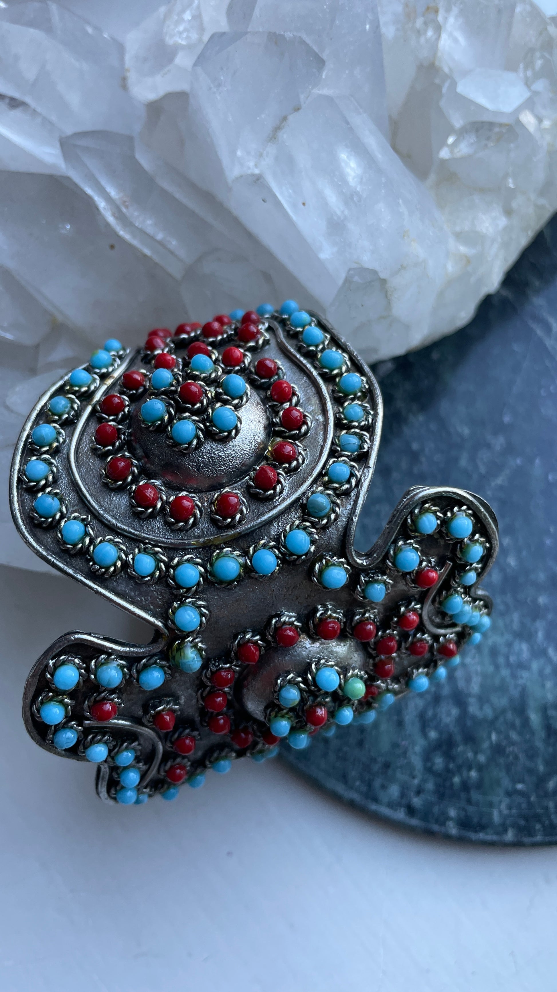 Amazing cuff bracelet made in India. The best thing about this bracelet is that all the beads are there! I’ve never come across one that’s complete. This bracelet is an amazing decorated piece that showcase the artistry of the makers. I’ve cleaned the bracelet just the right amount that it still shows patina from age. Please be careful with nickel allergies, vintage silver made in indian artistry is sometimes of a lower purity. Because there’s no markings there’s a high chance there’s a mix of metals used that could cause irritation for people with allergies. The metal can be slightly and carefully bended if it doesn’t fit right. The fact that it’s not sterling silver has an advantage over “the real deal” and that it’s way more affordable. An artist made piece like this in sterling silver, this size and weight usually start at 250 euro and sometimes even up to 450 euro.
