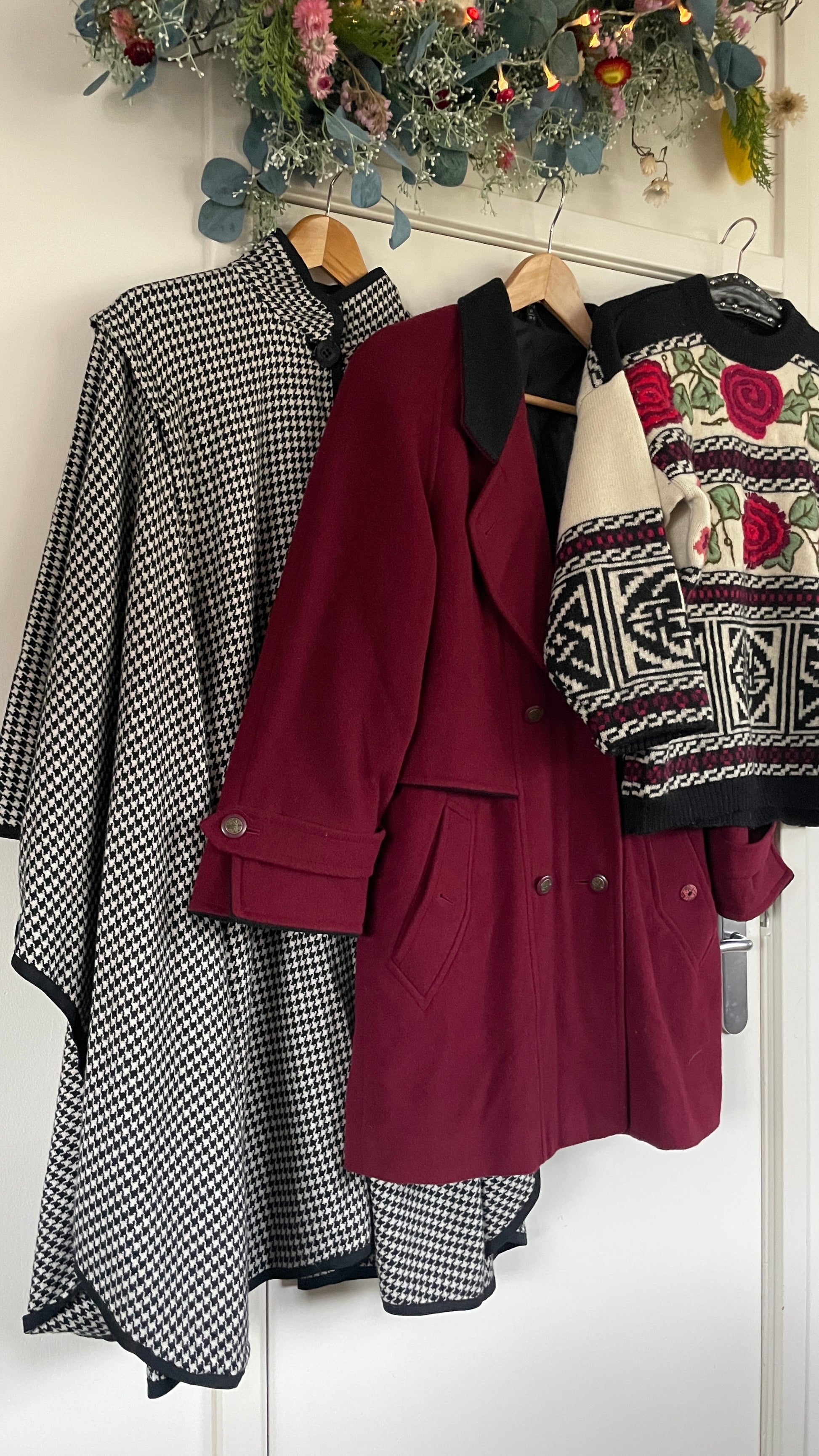 Stunning dark burgundy coat with black lapel and piping. A classic fit that is a perfect oversized layering piece. Great for combos with chunky knits. Shoulder pads and deep pockets. Jacket can be buttoned up all the way up.