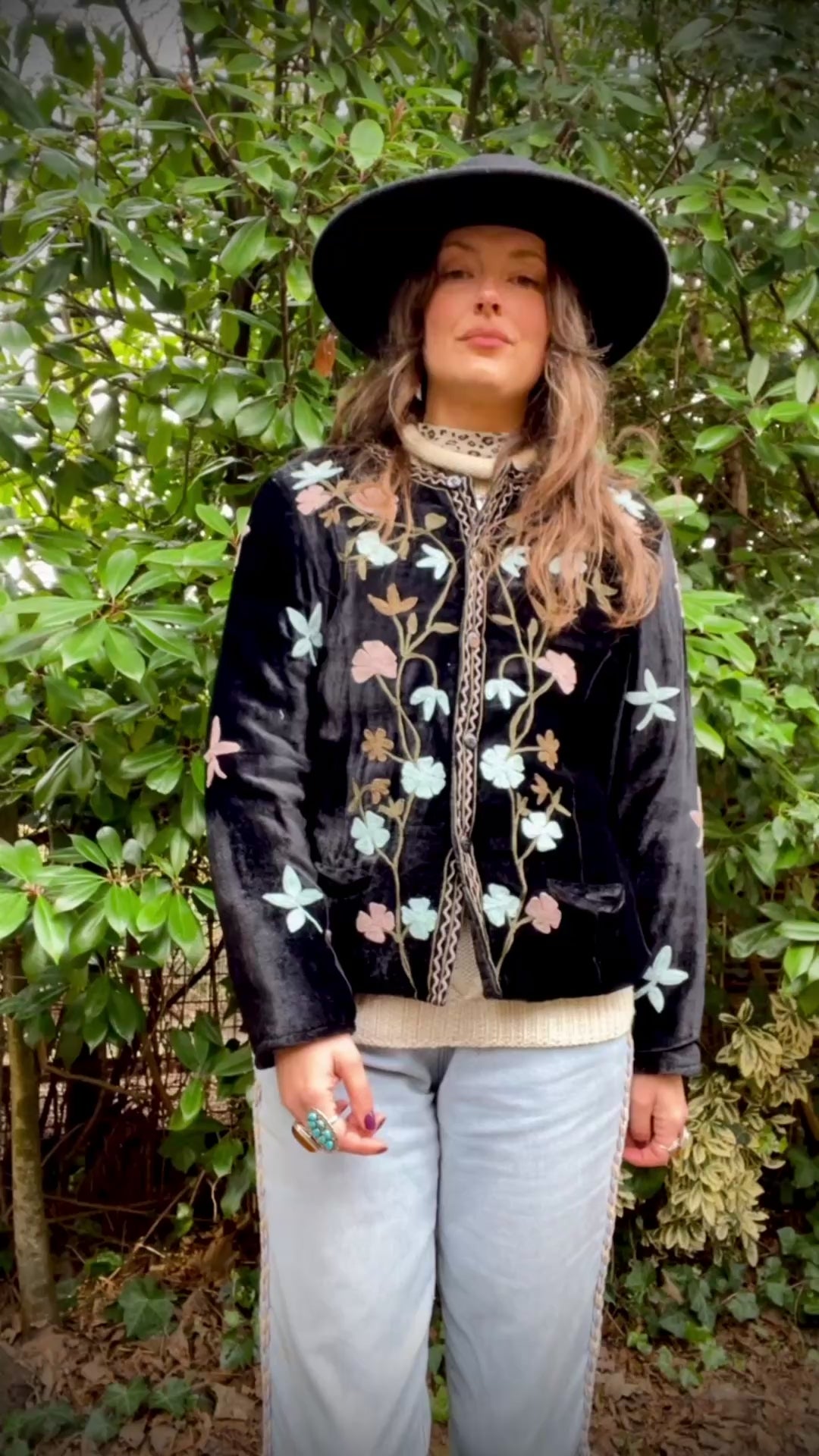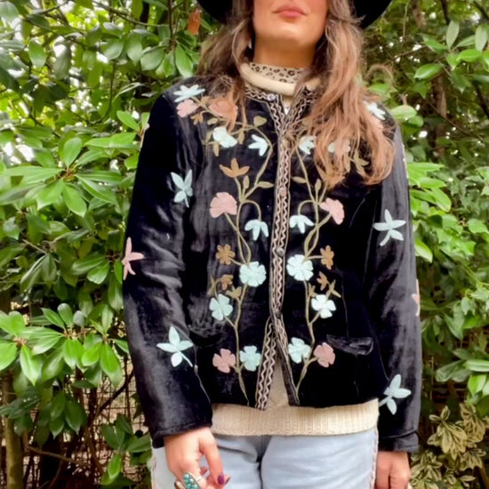 Stunning velvet jacket with bohemian floral embroidery. It’s lightly padded, has two front pockets and closes with buttons. There were two missing and replaced them, highlighting the work with a little bead showing signs of use can be beautiful.