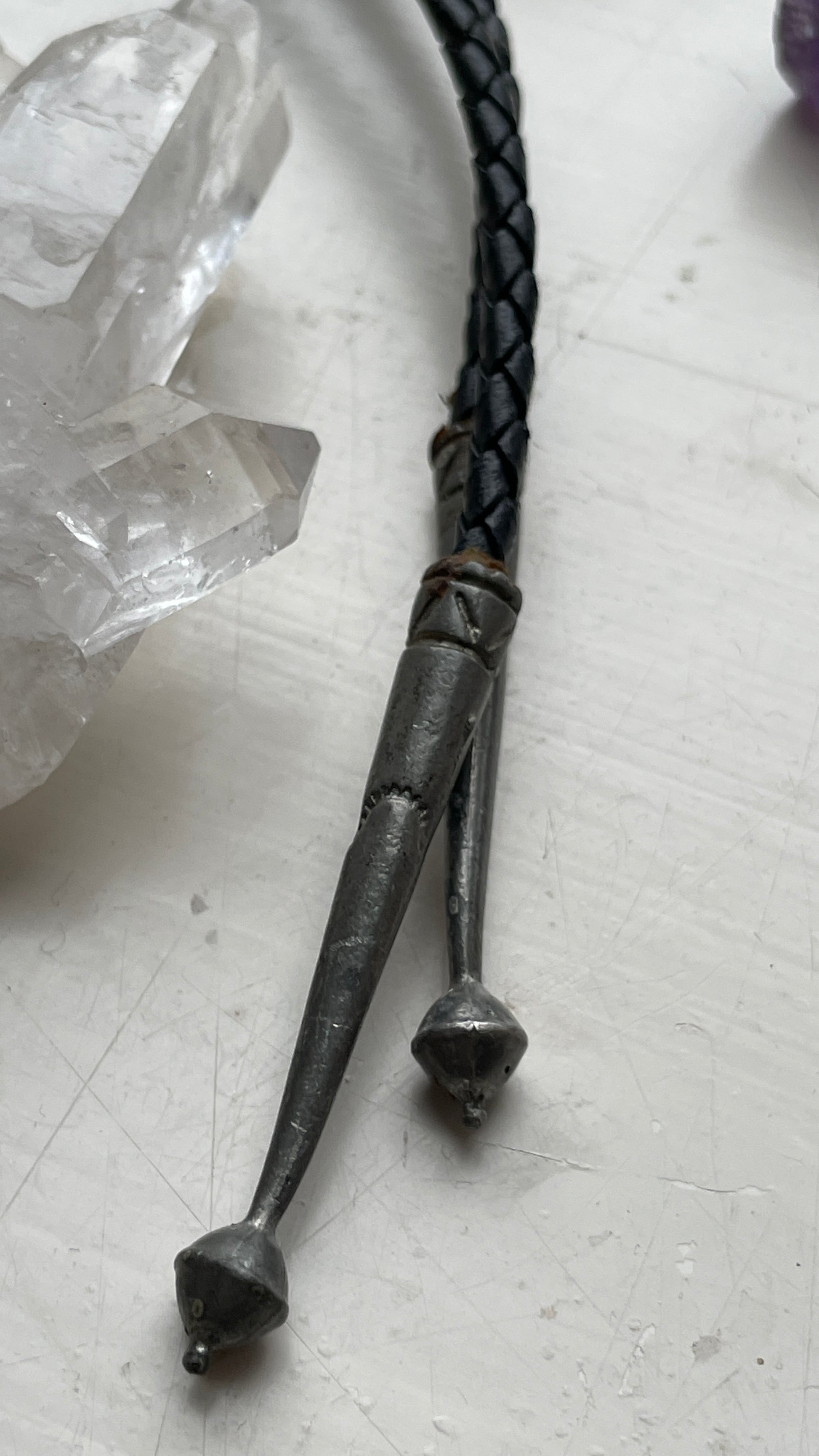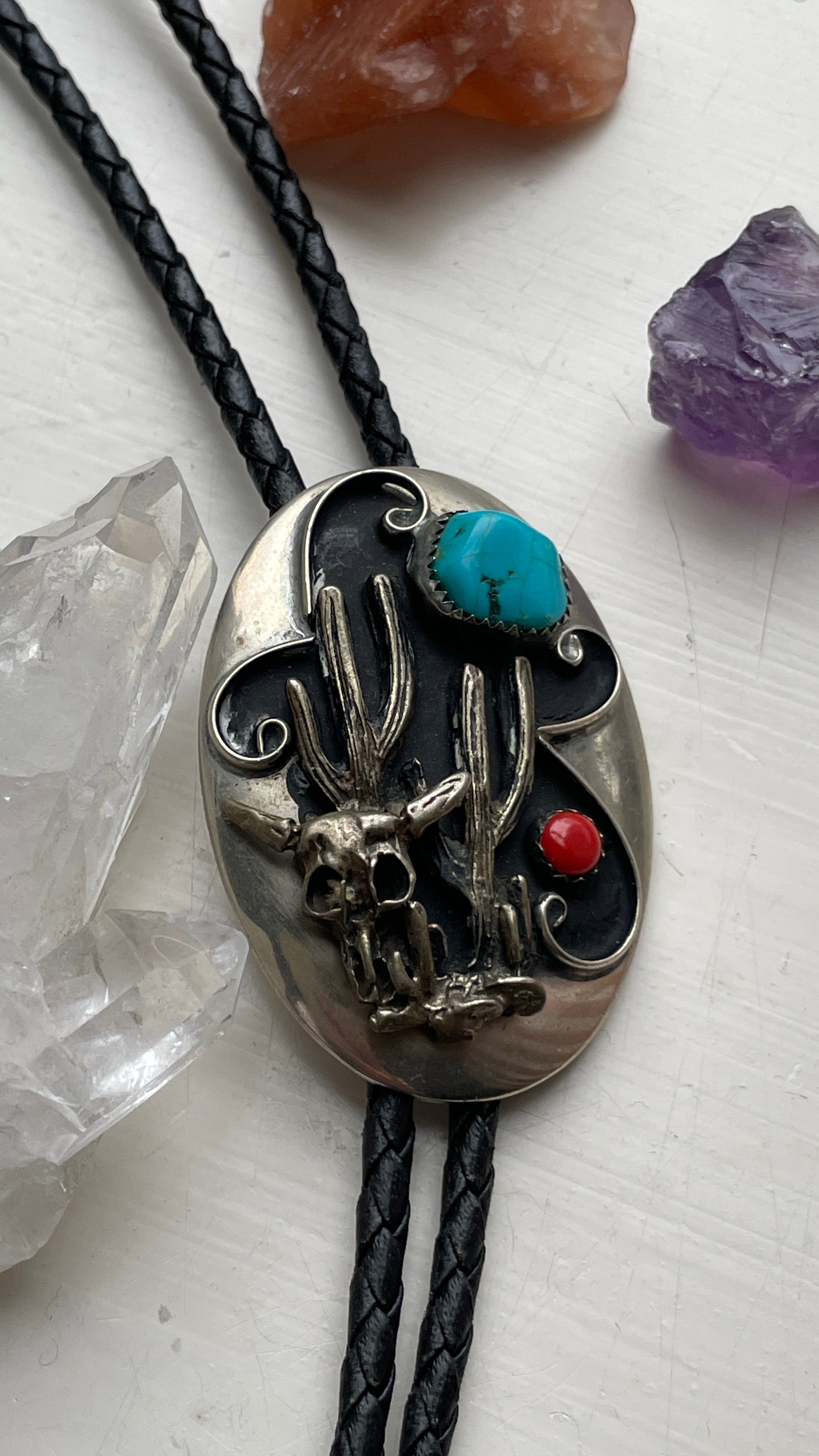 A real statement for my south western loving people. This bolo is beautifully made, featuring a coral and turquoise stone. Leather lace and the size can be adjusted in the back. The tales of the bolo have a dark patina, these aren’t real silver. No makers mark.