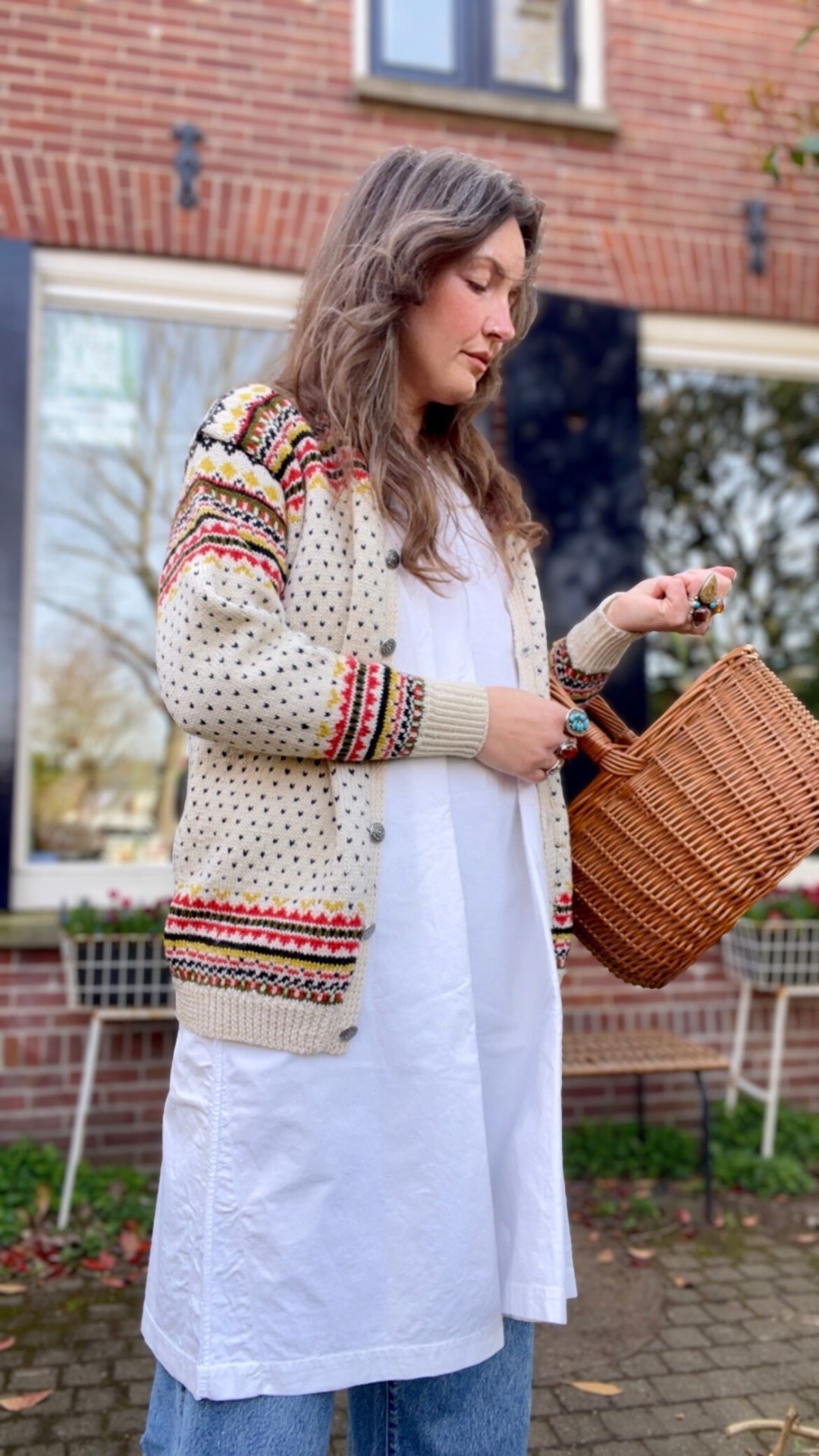 Such a treasure, timeless Norsk Husflid cardigan in the most amazing pure new wool. A cosy indoor piece for winter and take it outside in spring and fall as a jacket substitute. Pretty patterns not too outspoken so it combines easily. Closes with silver colored metal buttons. Tag says “Moth Proof” so that’s a bonus.