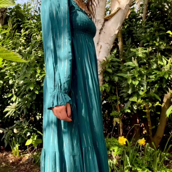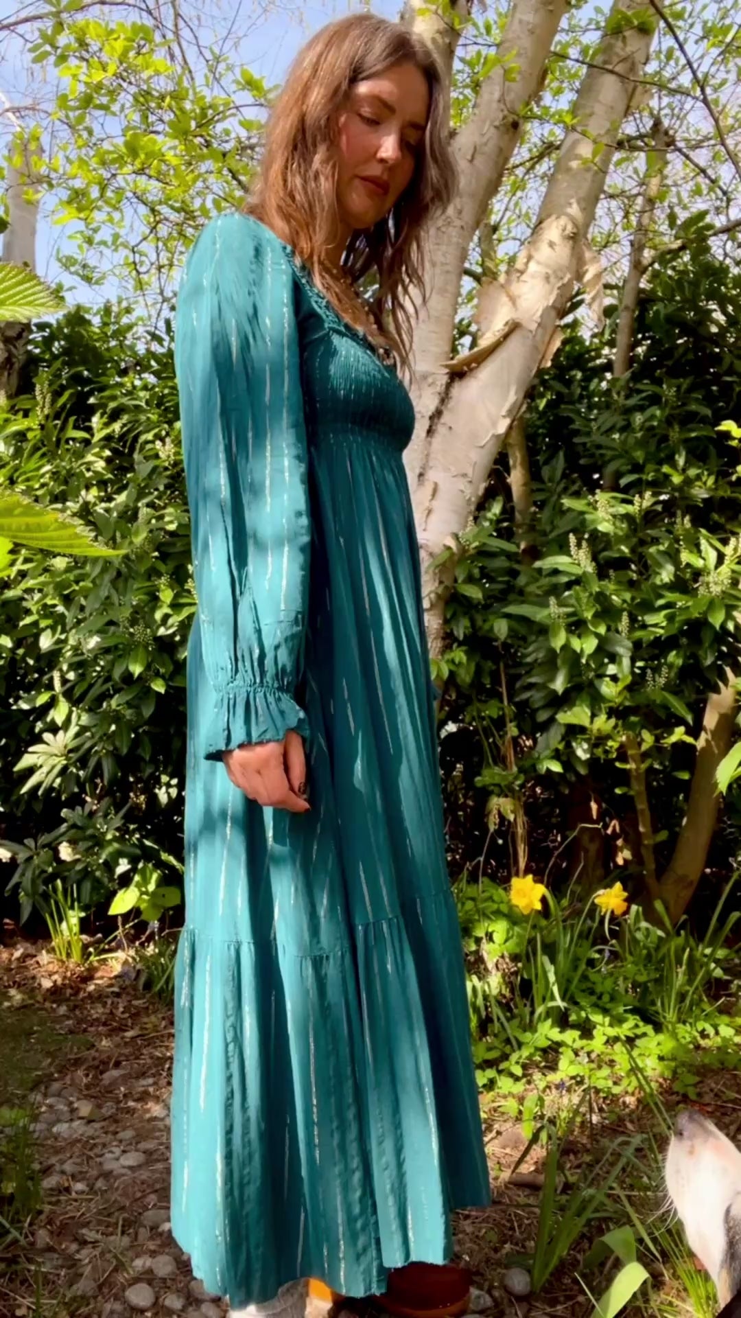 Not vintage but still amazing. This teal viscose dress has a smocked elastic bust, balloon steeled that could also be worn off shoulder. Very comfy yet stylish. The fabric has a subtle lurex thread in gold and silver.