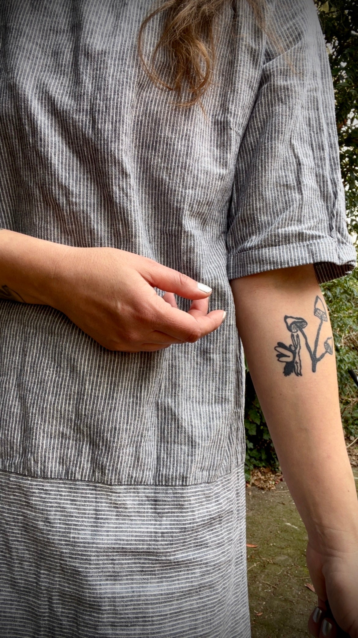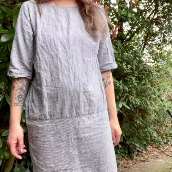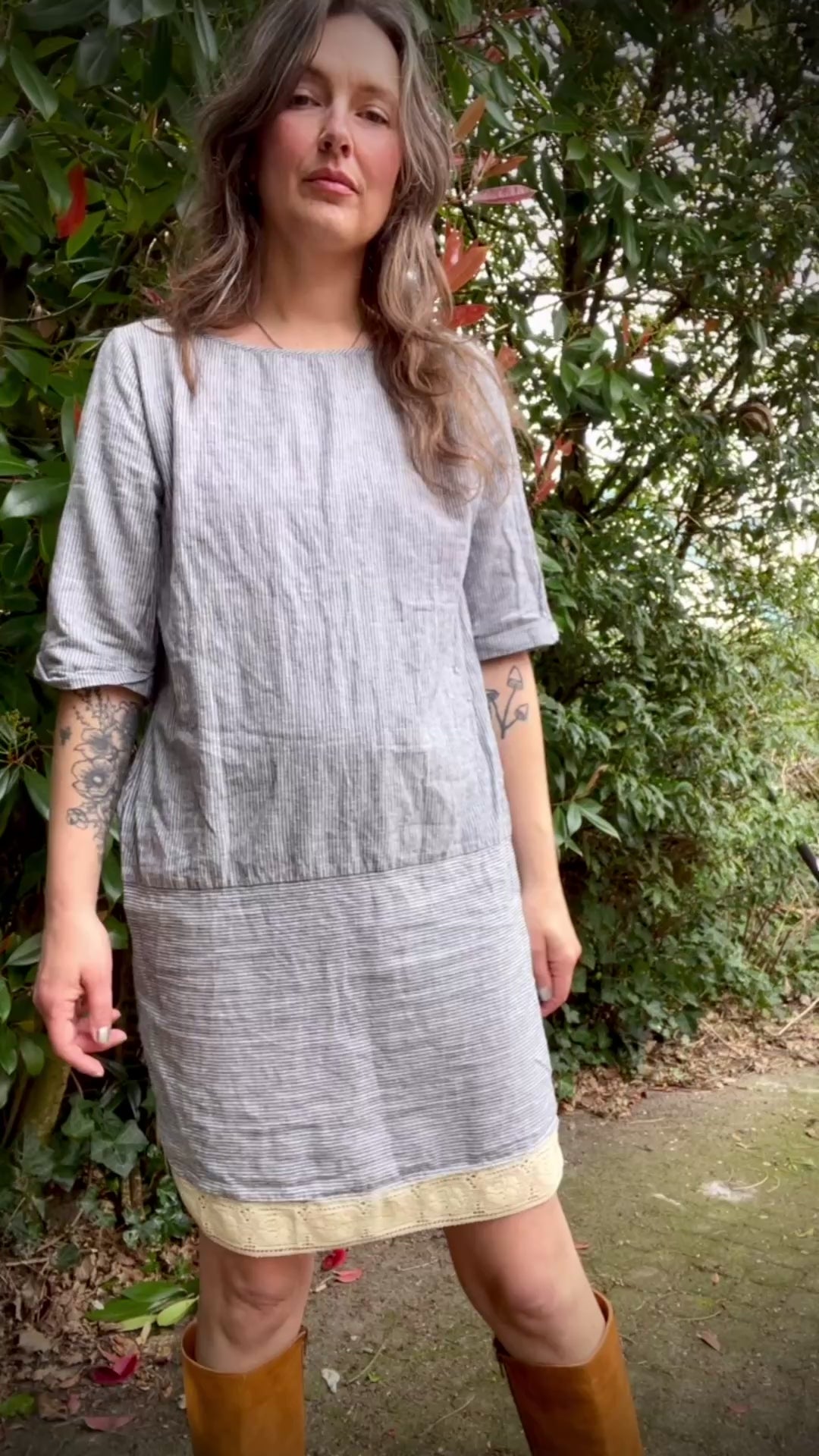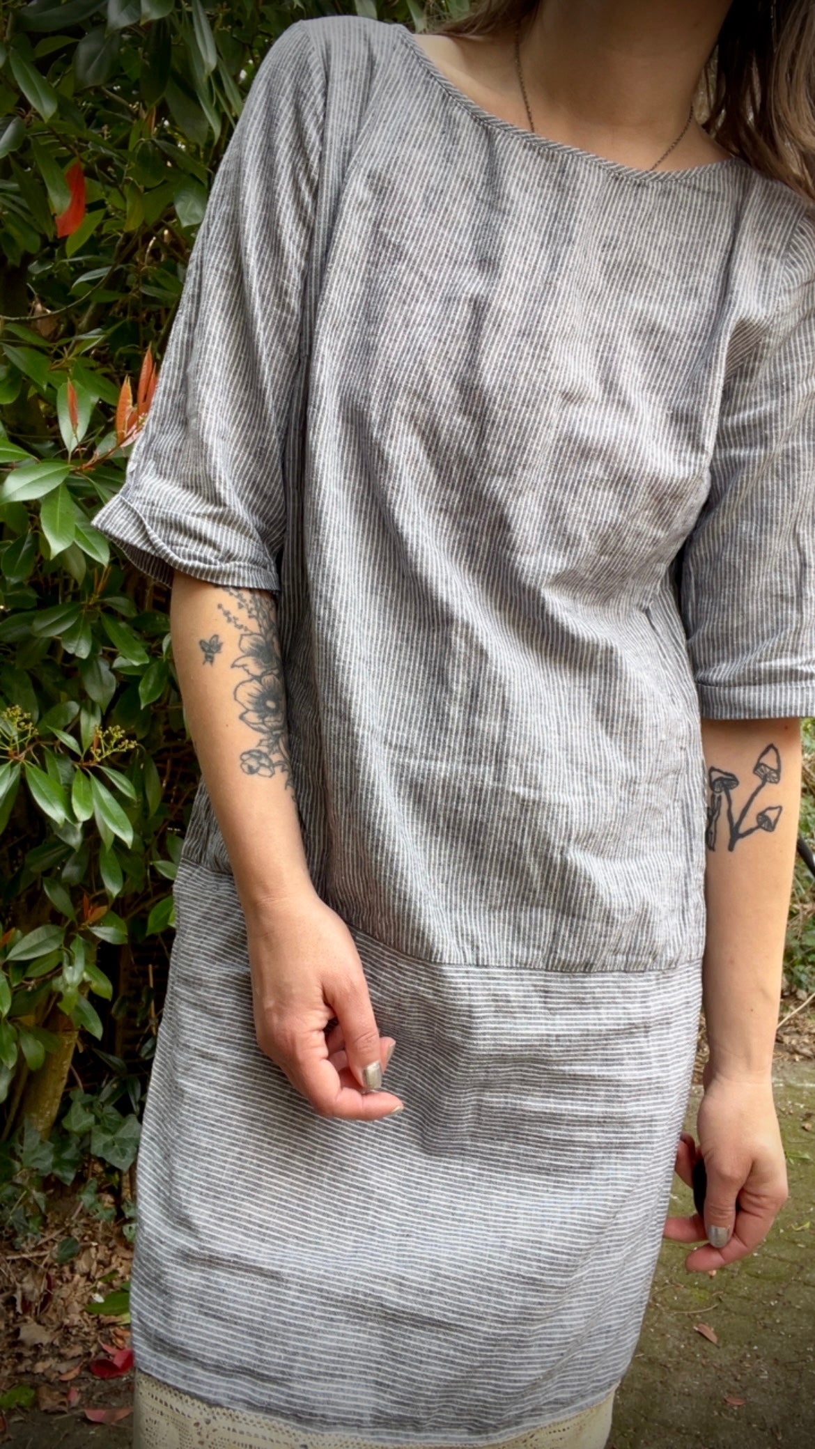 Super cool non vintage tunic or short dress in T-shirt shape. Lovely fabric, cotton and linen mix in a classic blue and white stripe. On the bottom I added a vintage lace trim. With indigo and roses reworked I give a new life to newer garments by adjusting them to be more unique or repurpose fabrics and other materials in to something new to wear. Reworked pieces are made out of 100% secondhand materials, from garment to thread.