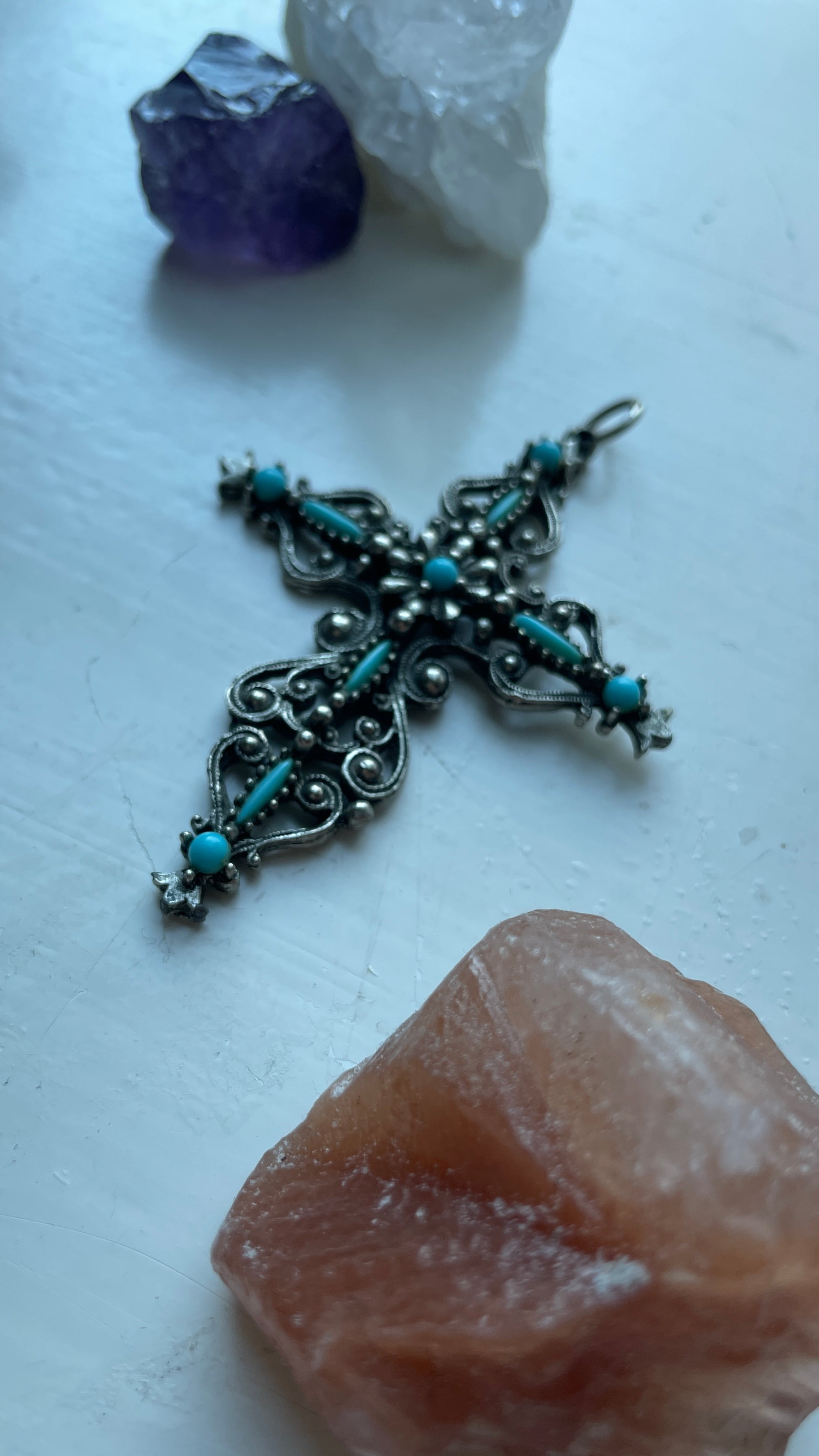 Beautiful piece of art, this cross pendant. Stamped “Roma” in the back. It’s a vintage souvenir. Unknown metal and faux turquoise.