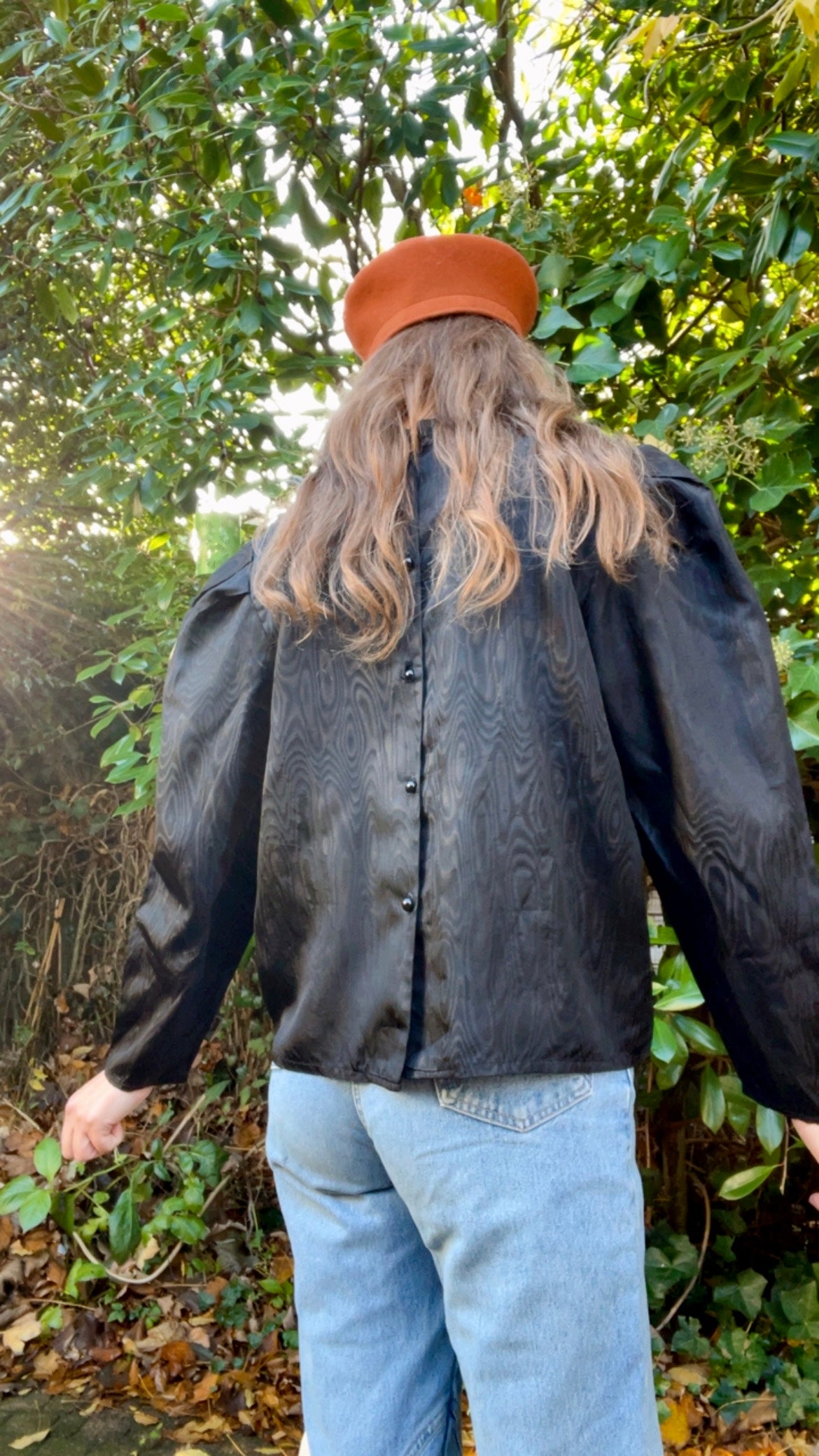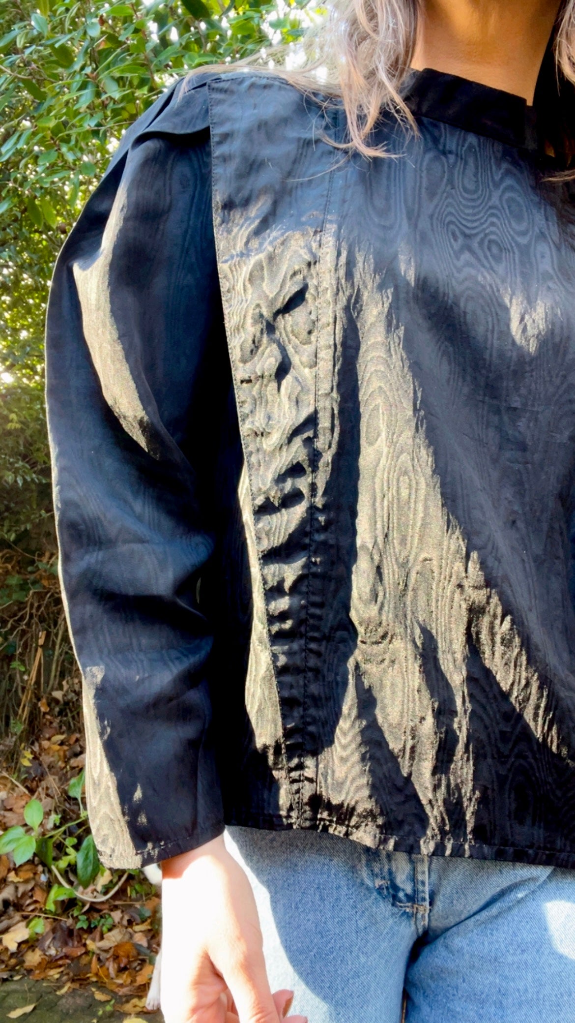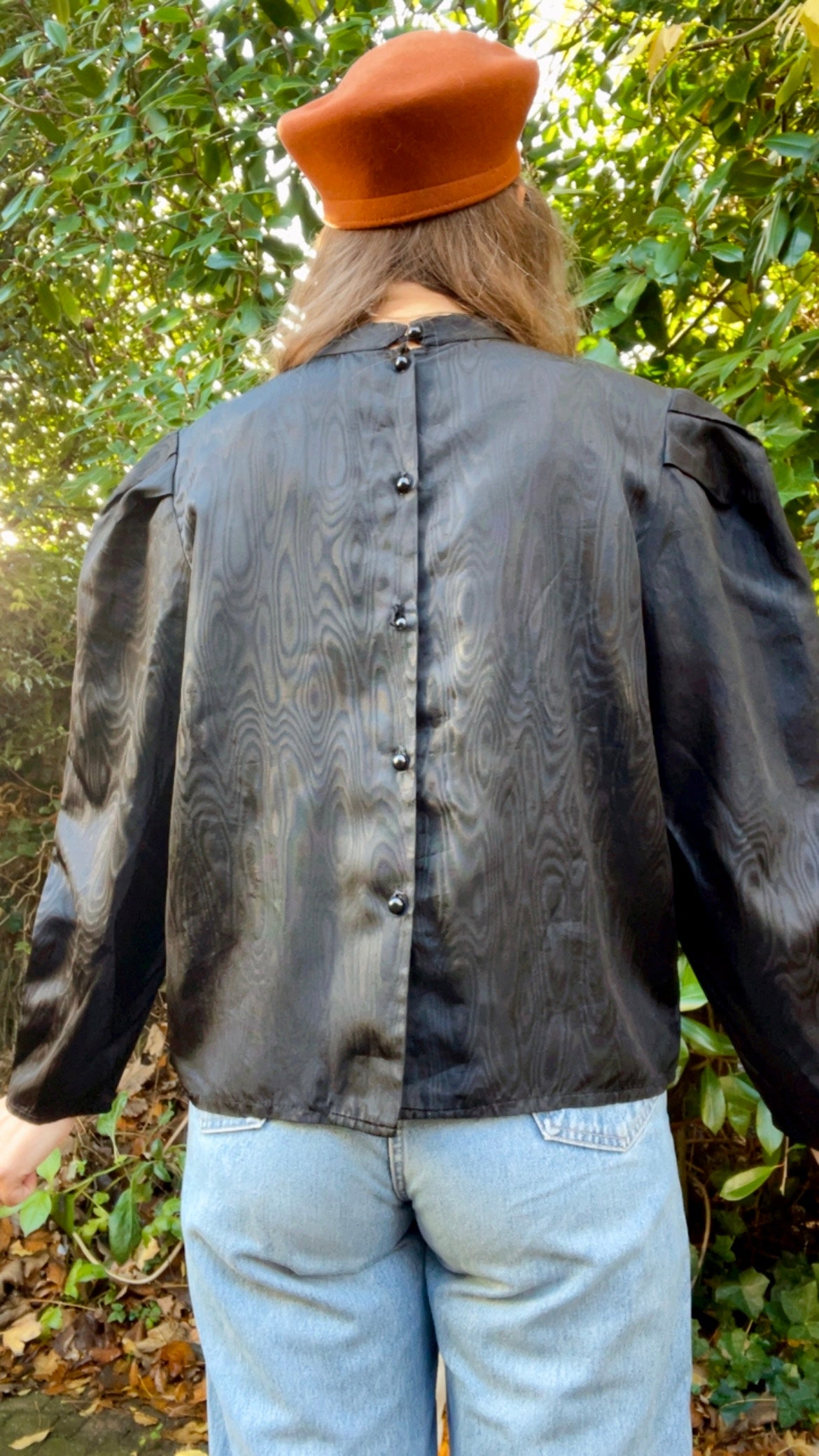 Amazing top with statement sleeve in night black with a “wood like” pattern. Closes with buttons on the back. Made in France.