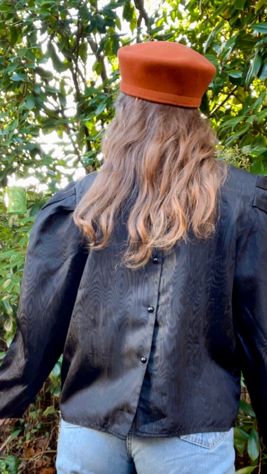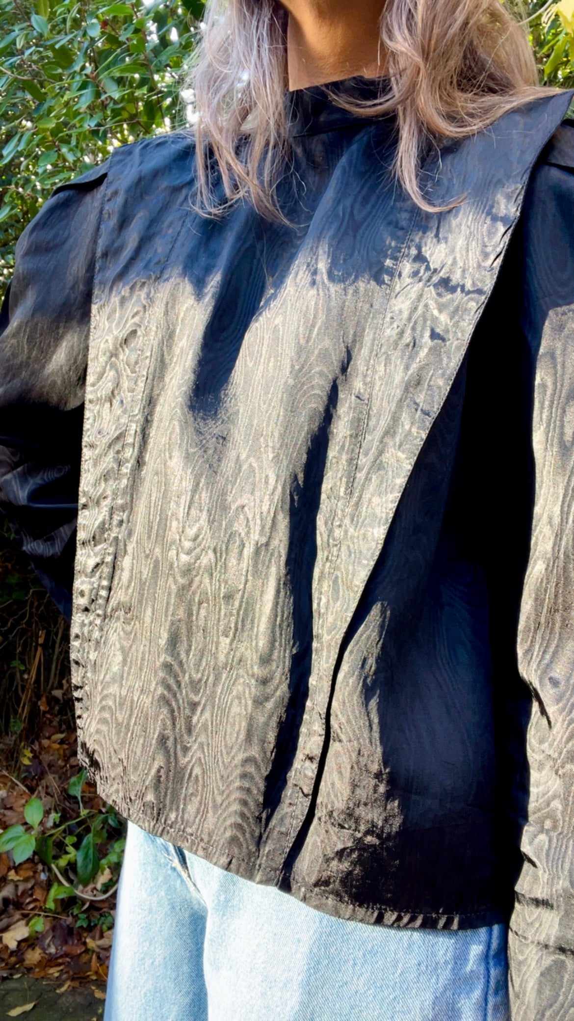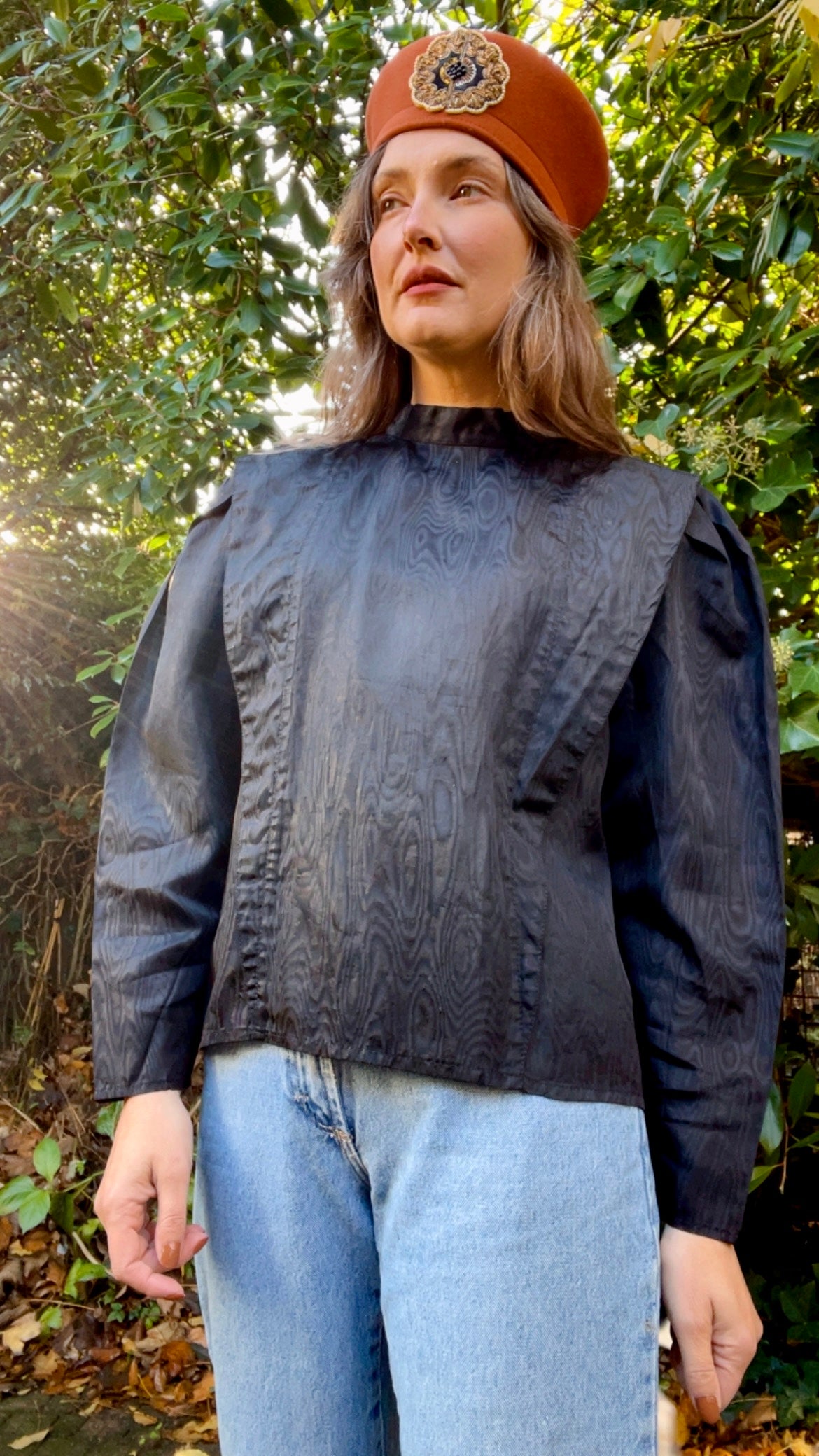 Amazing top with statement sleeve in night black with a “wood like” pattern. Closes with buttons on the back. Made in France.