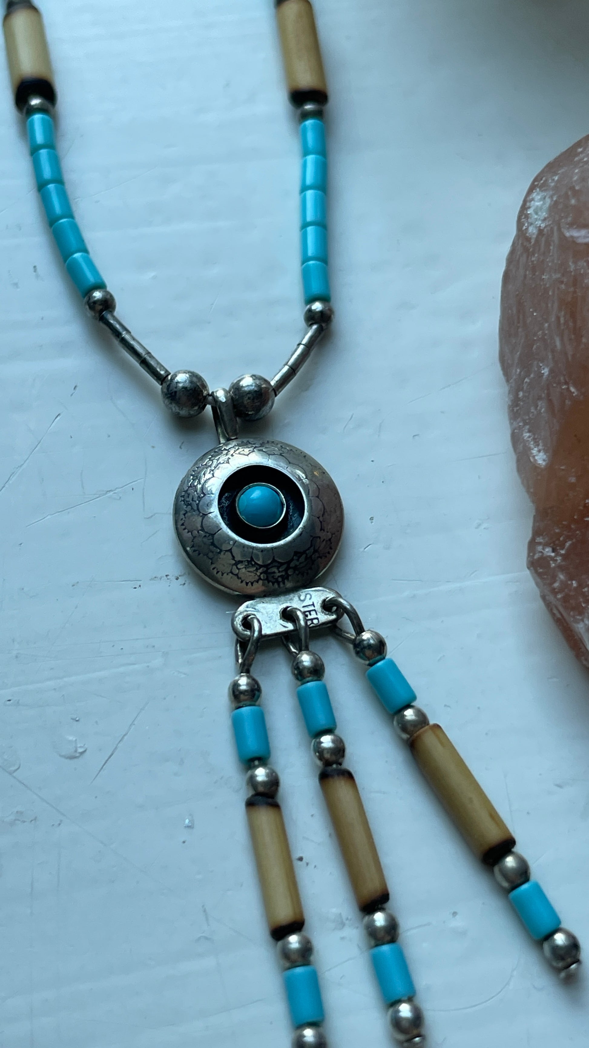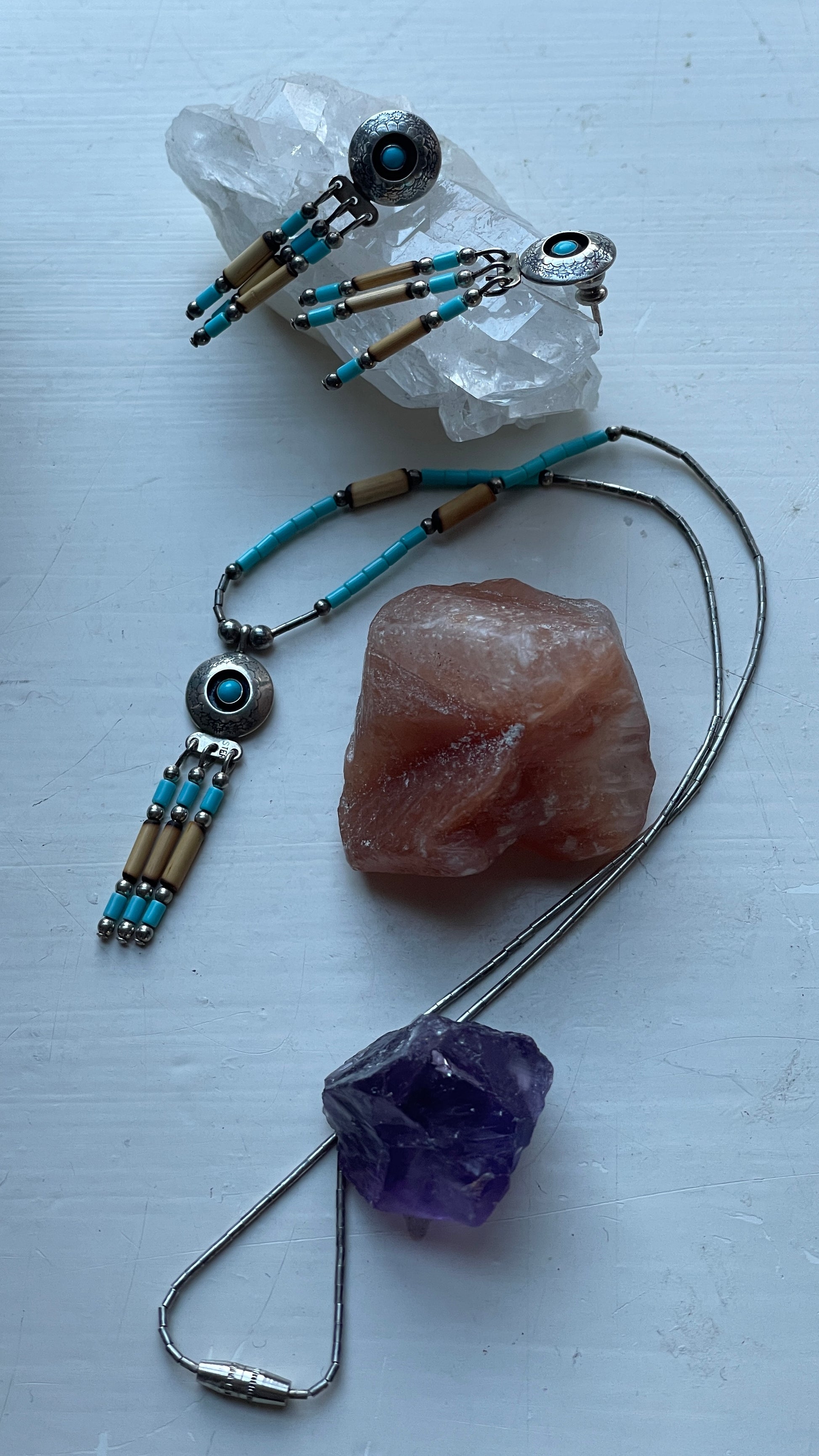 Beautiful set of silver, turquoise and porcupine quills. Amazing as is or to pair with other (silver) jewelry. Earrings and necklace sold separate.